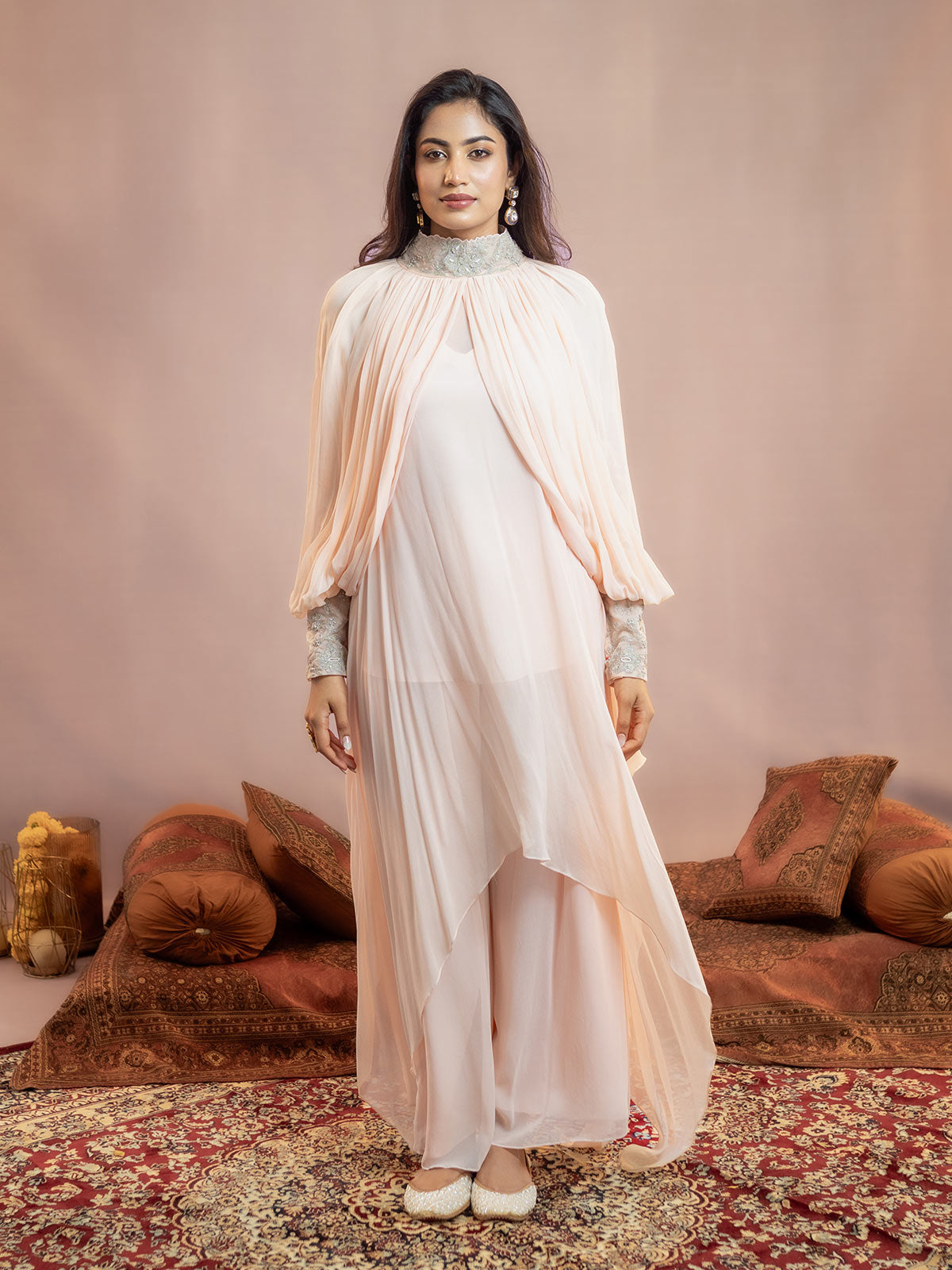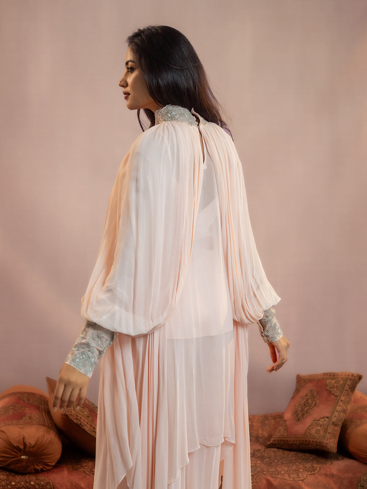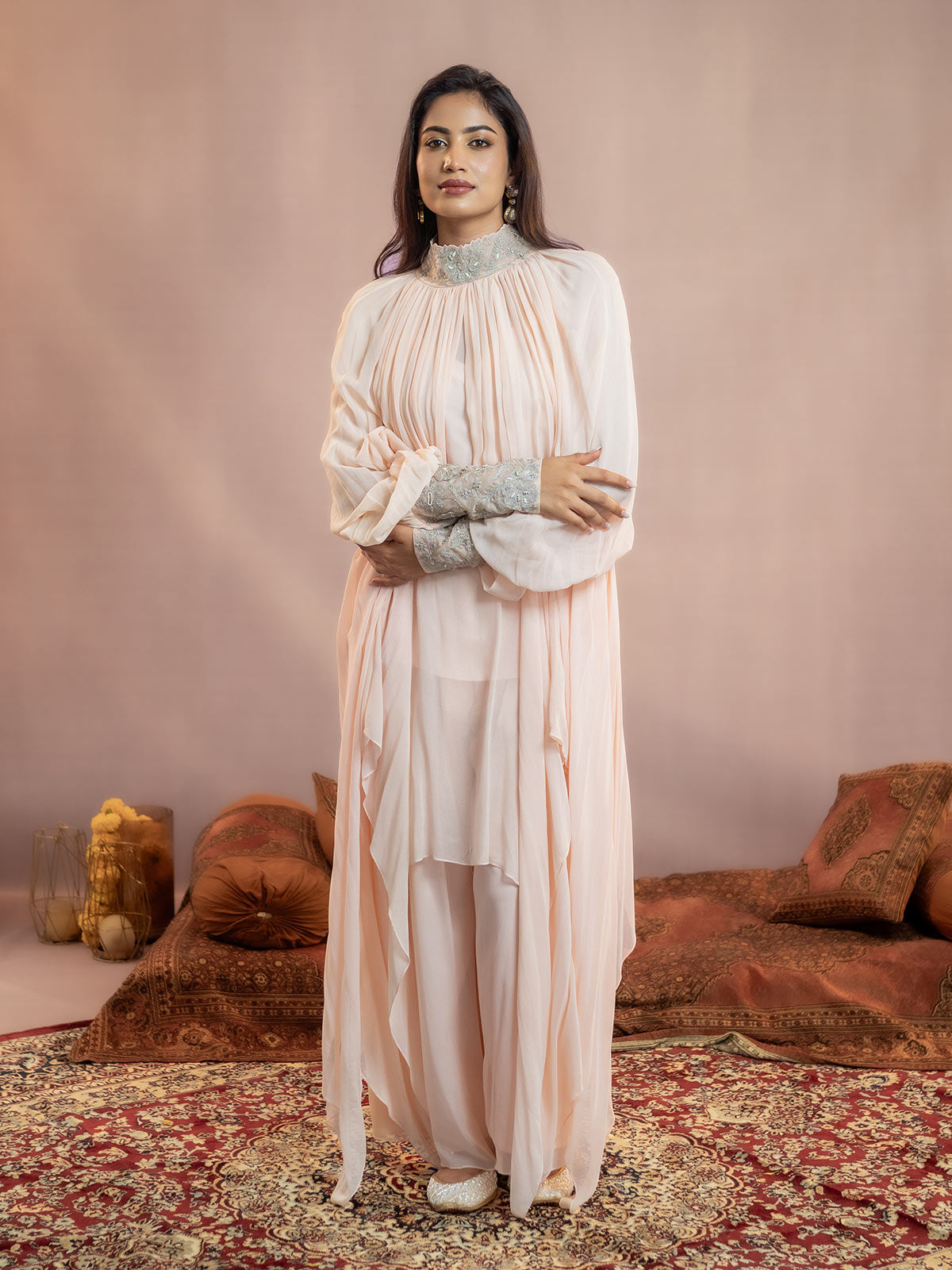 This exquisite baby pink kaftan features elegant drape sleeves adorned with intricate antique silver kasab 3D floral work. The wide cuffs add a touch of sophistication, while the georgette straight pants provide a graceful and comfortable fit. This ensemble is perfect for making a stylish and refined statement.