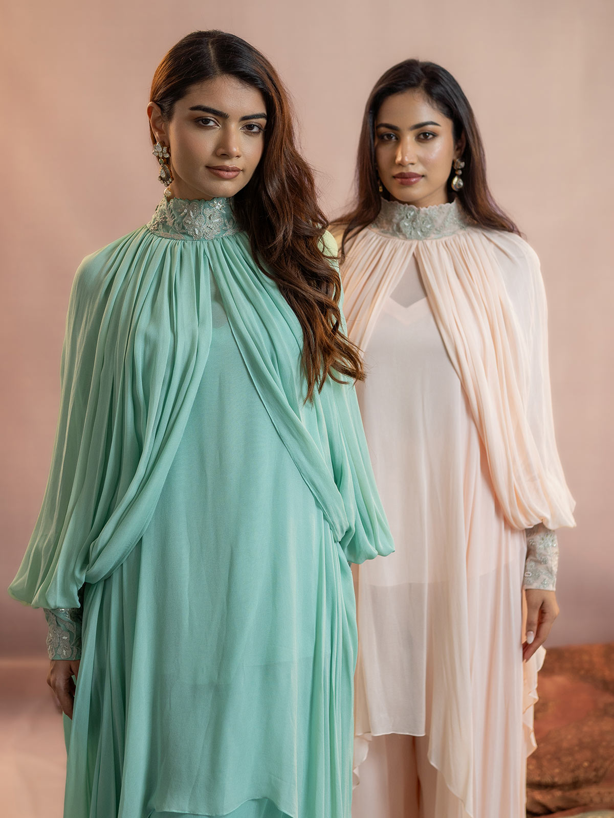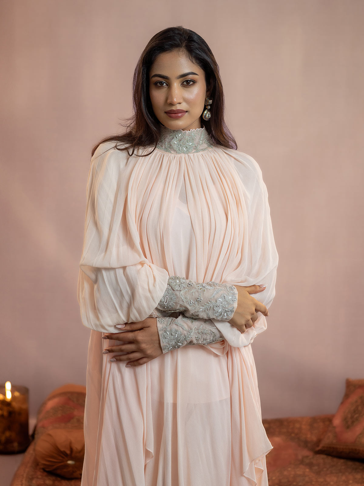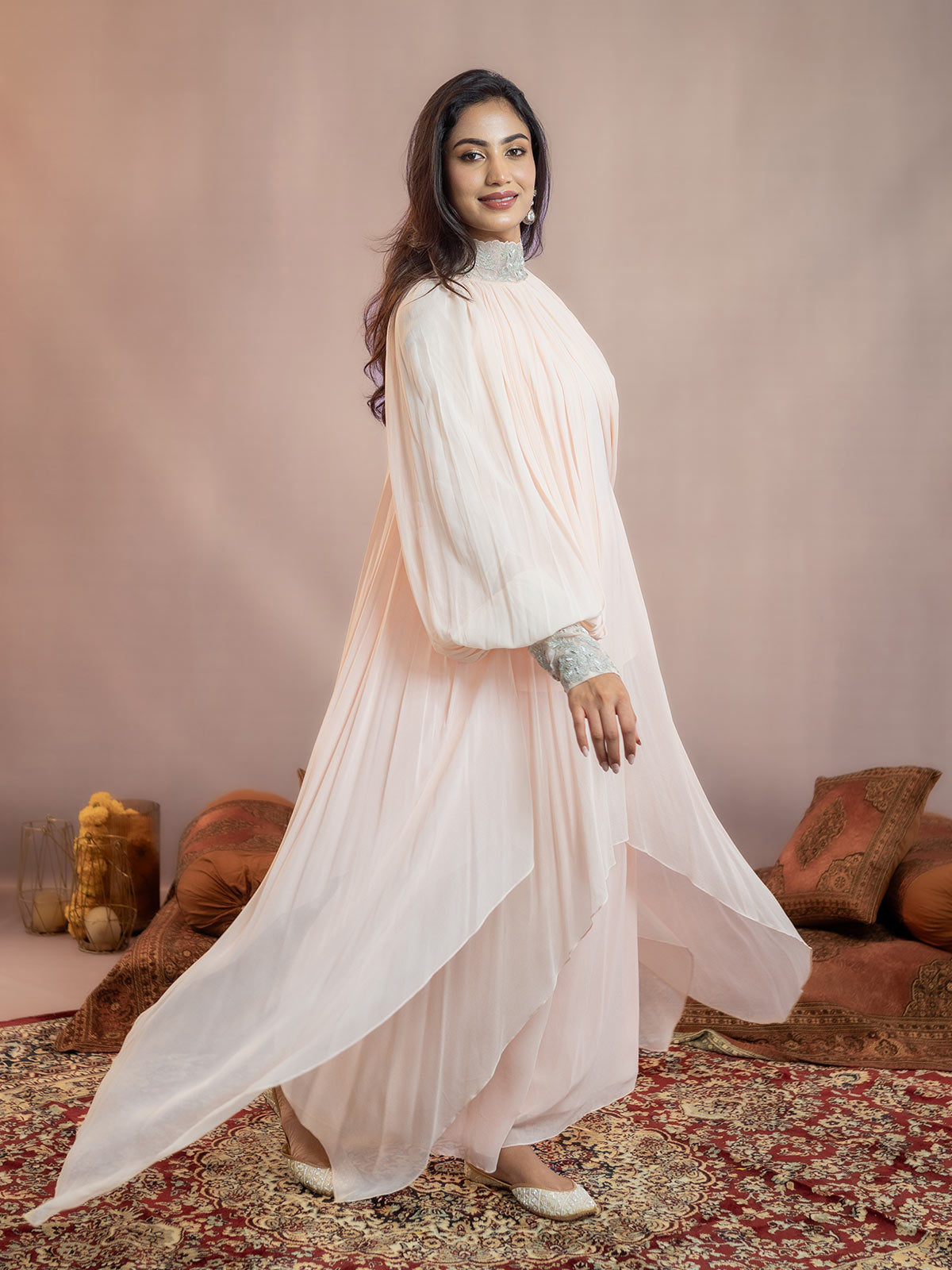 This exquisite baby pink kaftan features elegant drape sleeves adorned with intricate antique silver kasab 3D floral work. The wide cuffs add a touch of sophistication, while the georgette straight pants provide a graceful and comfortable fit. This ensemble is perfect for making a stylish and refined statement.