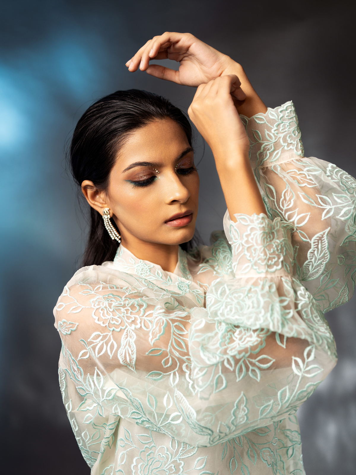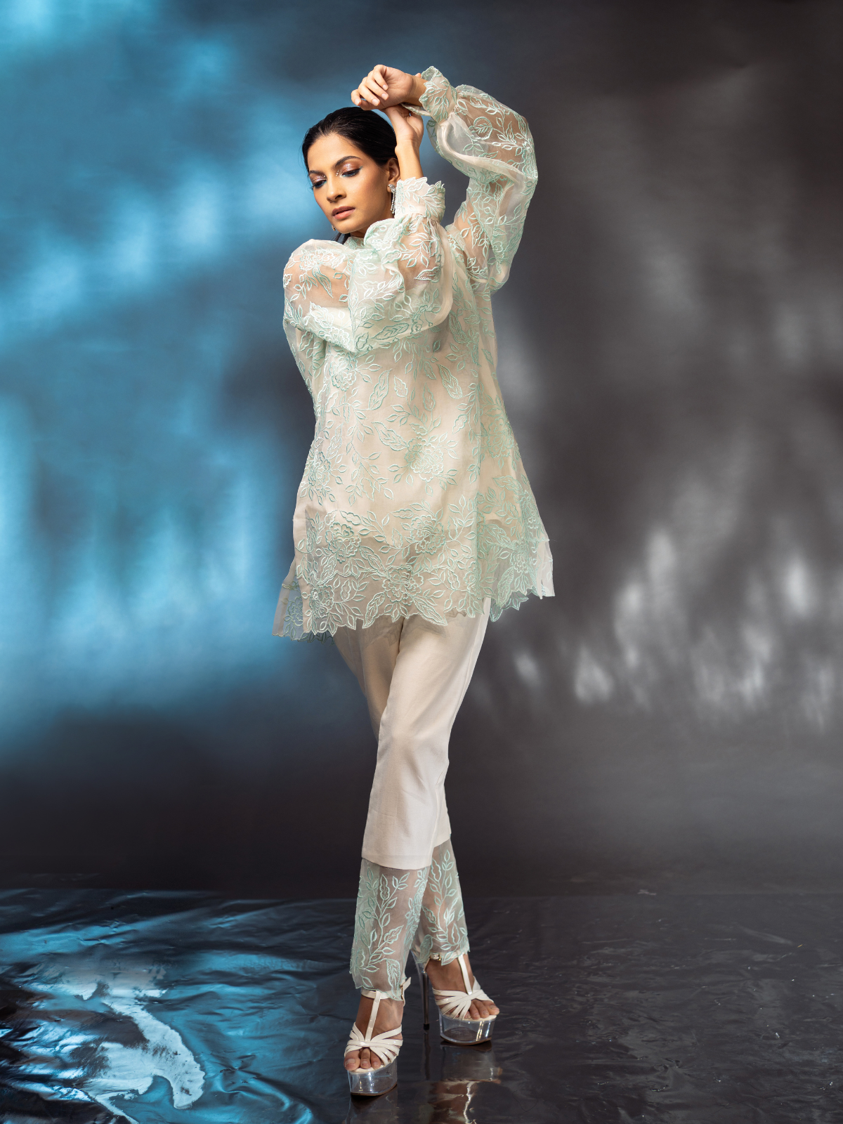 With hints of sage green and ivory, this chic set has an organza top with embroidered accents and flowing drama sleeves. Plus, the ivory chanderi pants feature embroidery details at the bottom, adding a punch of personality.