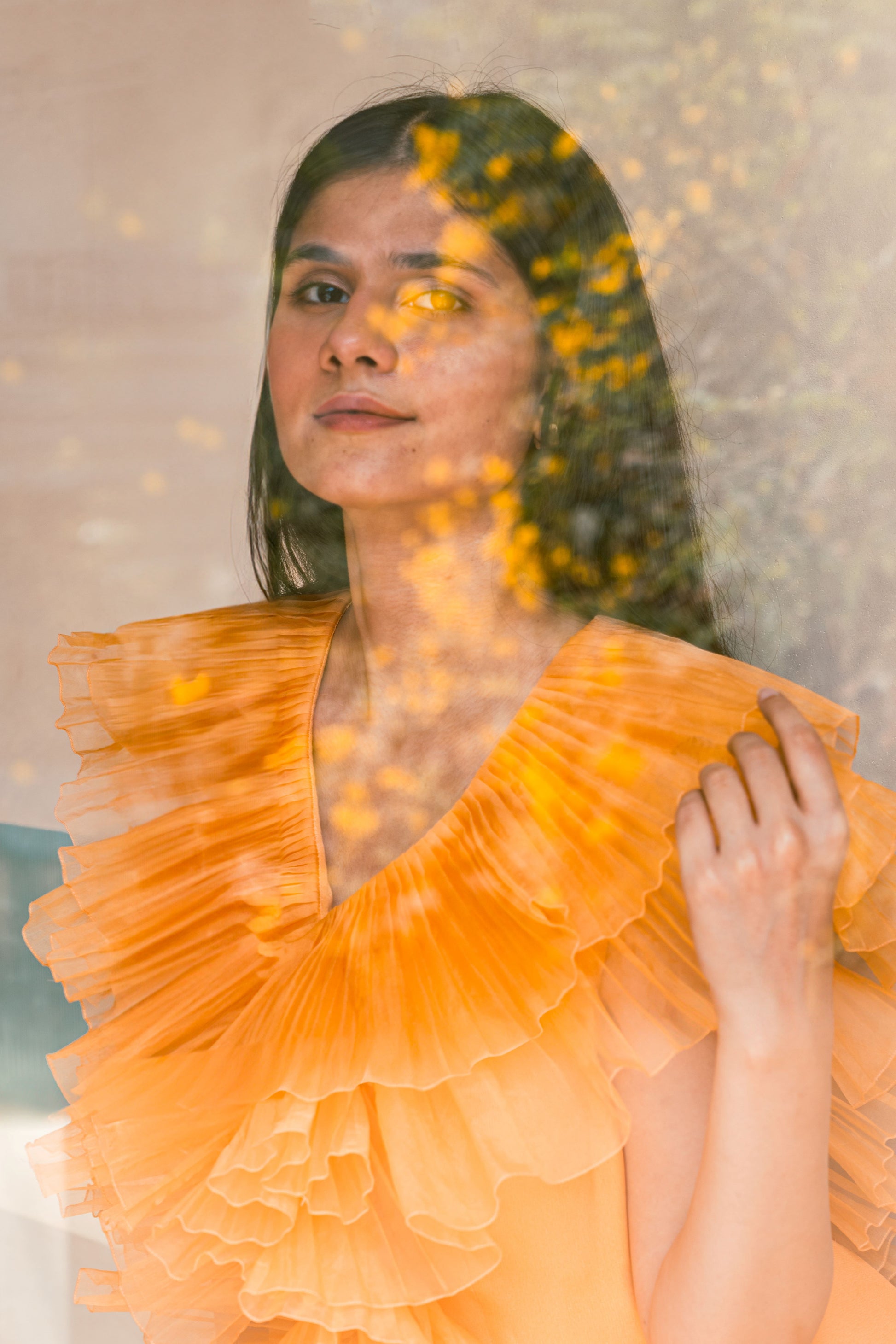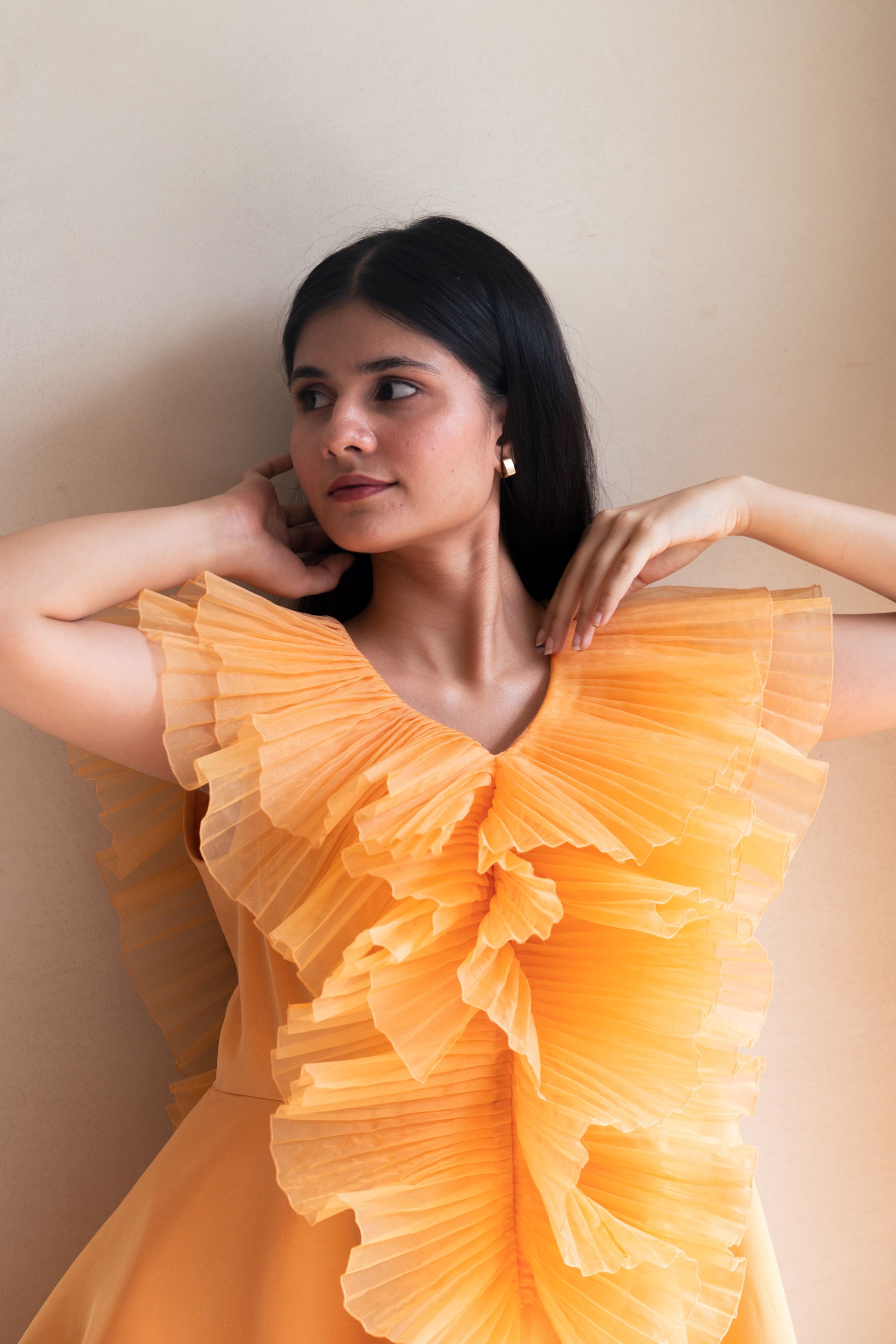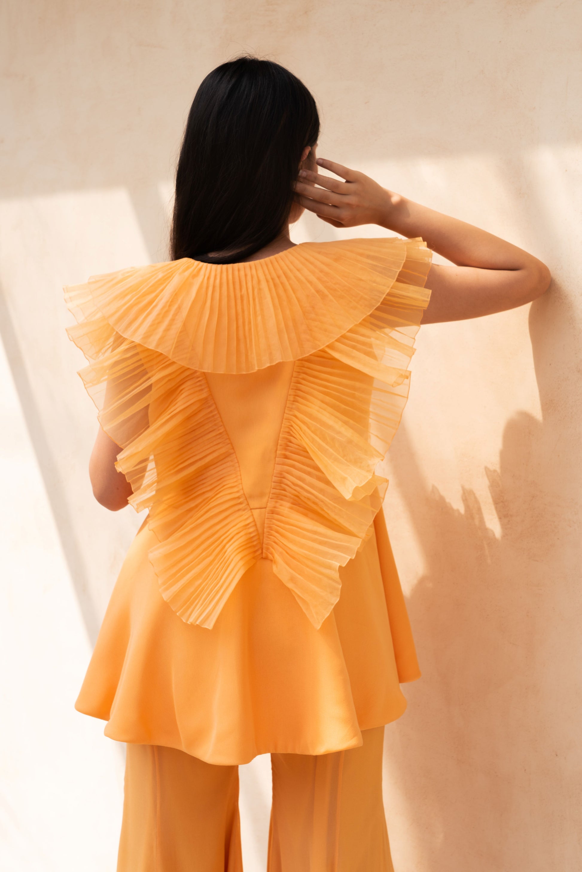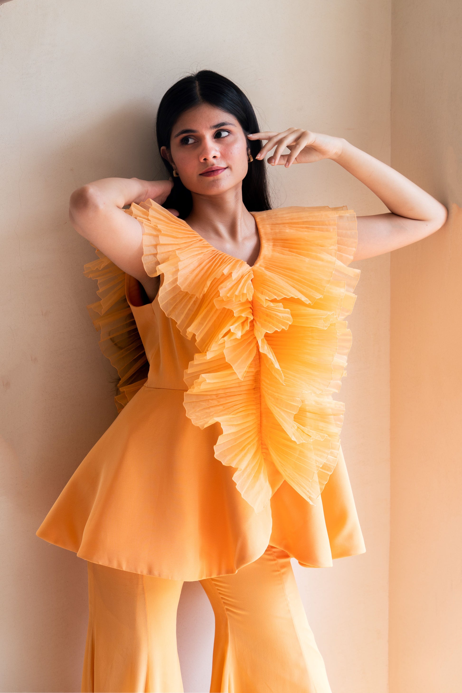 Chic-Marigold Pleated Co-ord set has peplum top with three layers of organza pleated ruffles attached to the neck, spreading on the shoulders and body. Paired with the kali bell bottom pants. Perfect for any date night, girl's day out, bridal shower any more fun events.