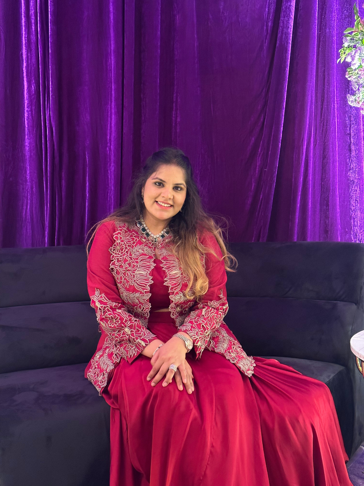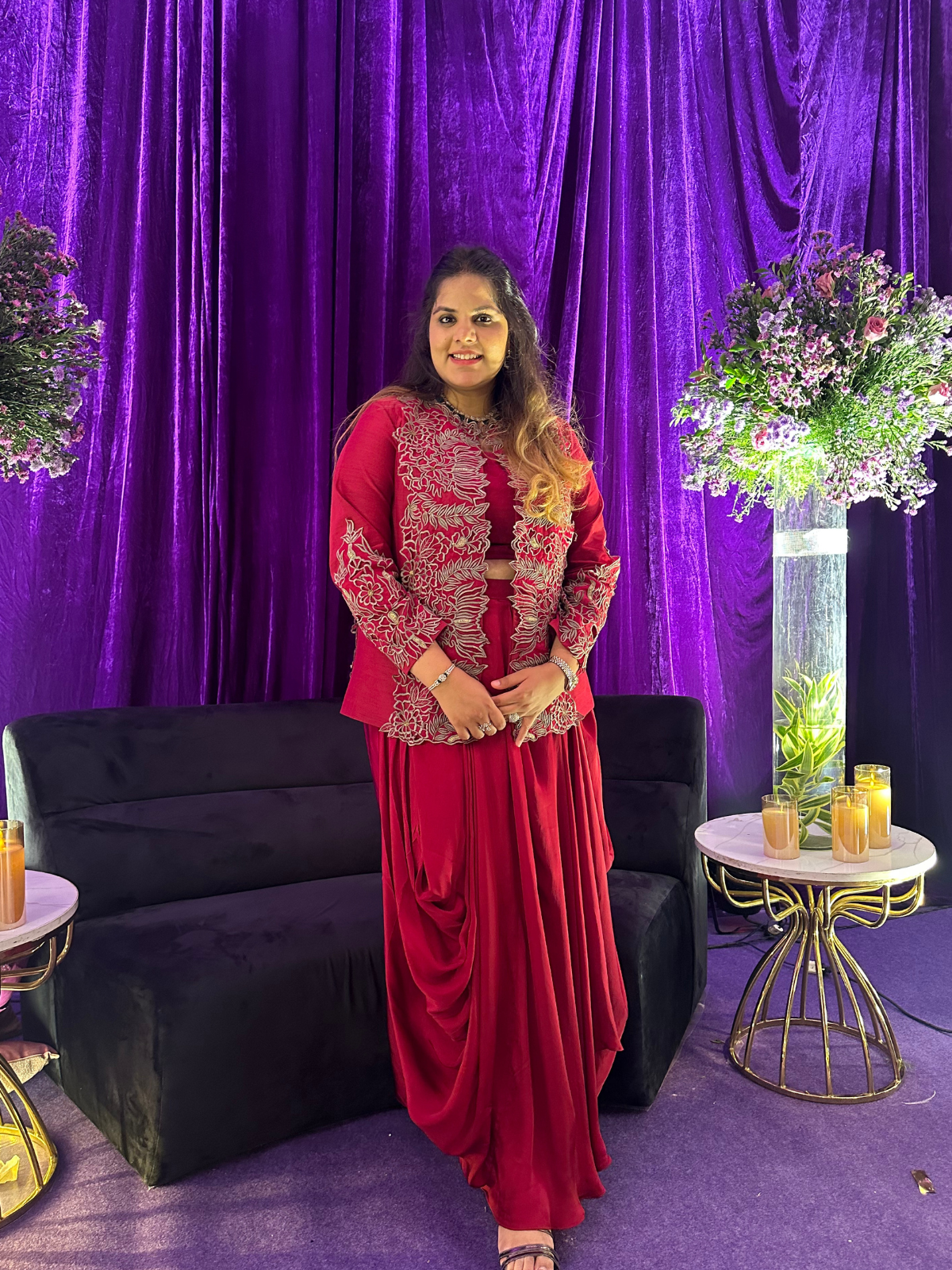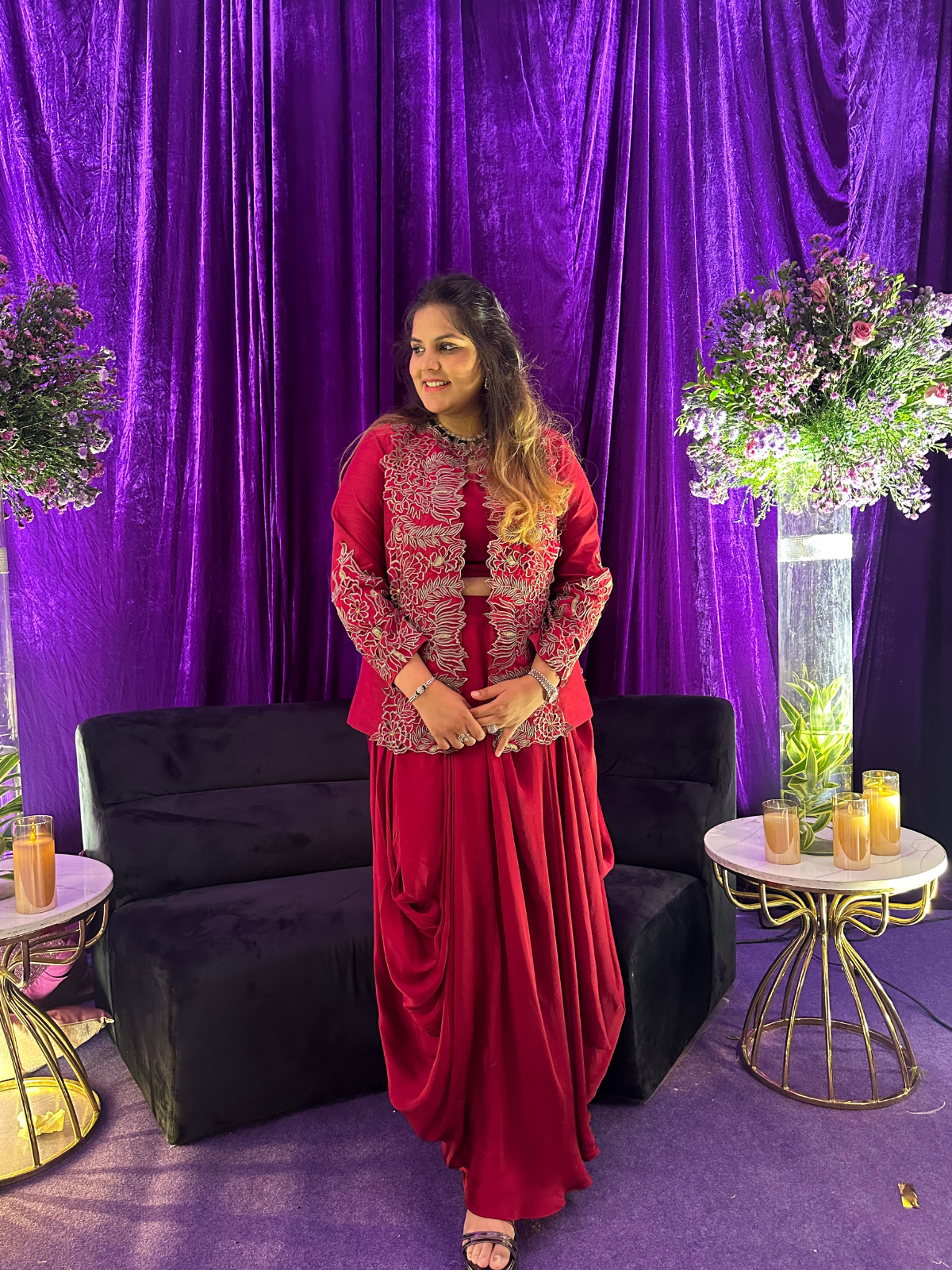 Get ready to make a statement with our Crimson Blazer Set. This set features a luxurious bemberg satin drape skirt paired with a fitted bustier and a chic chanderi silk blazer with contrast cutwork and pita highlight.