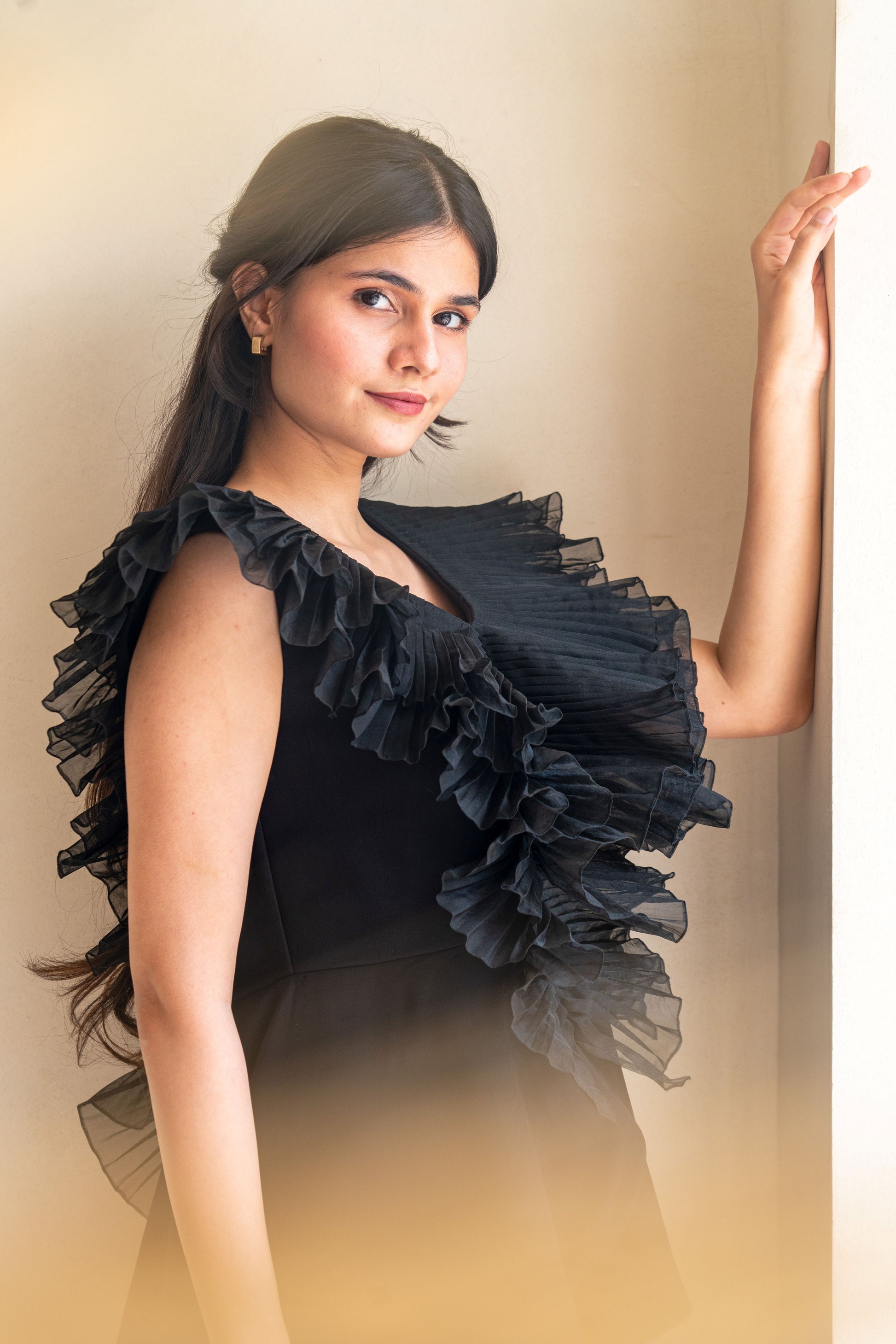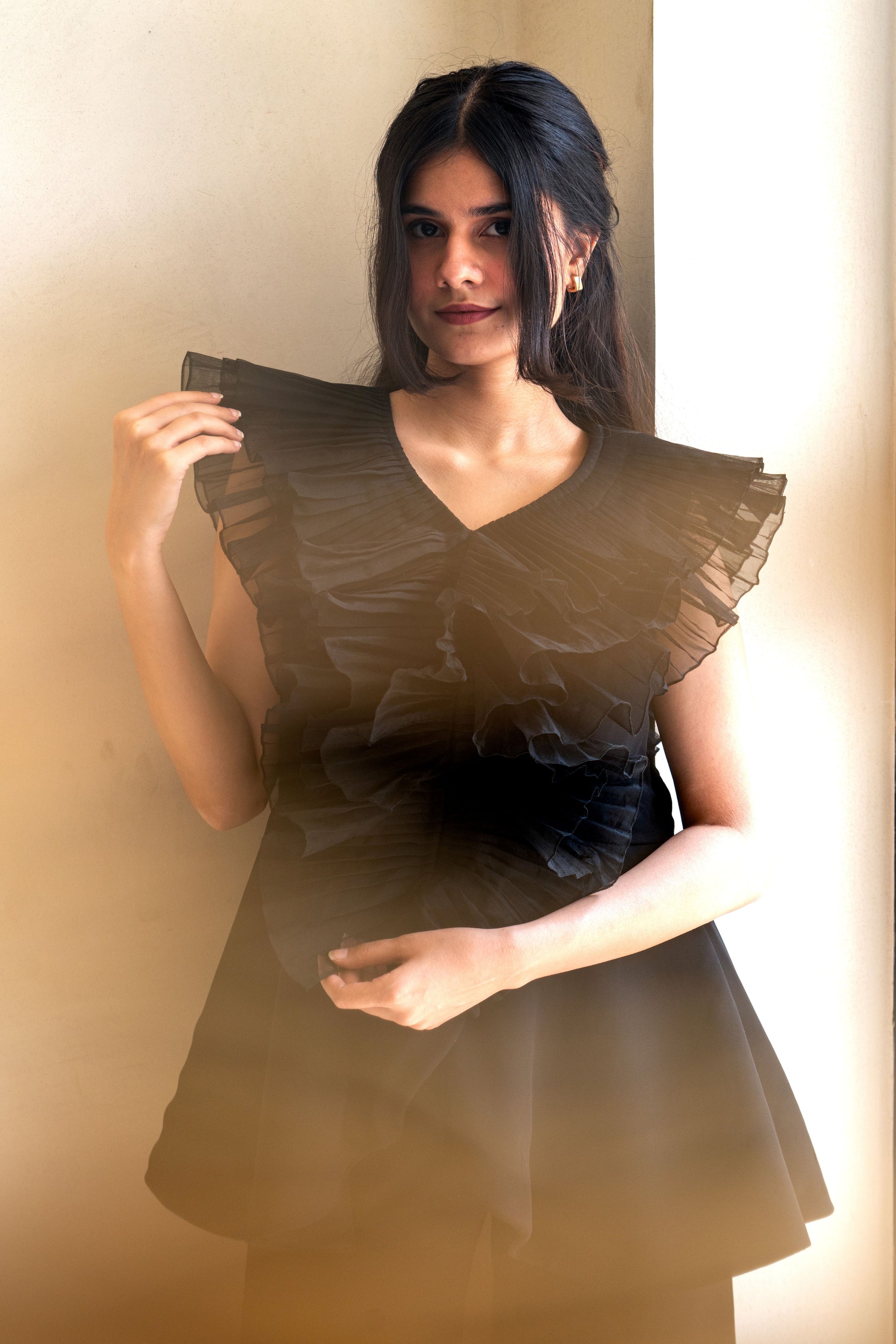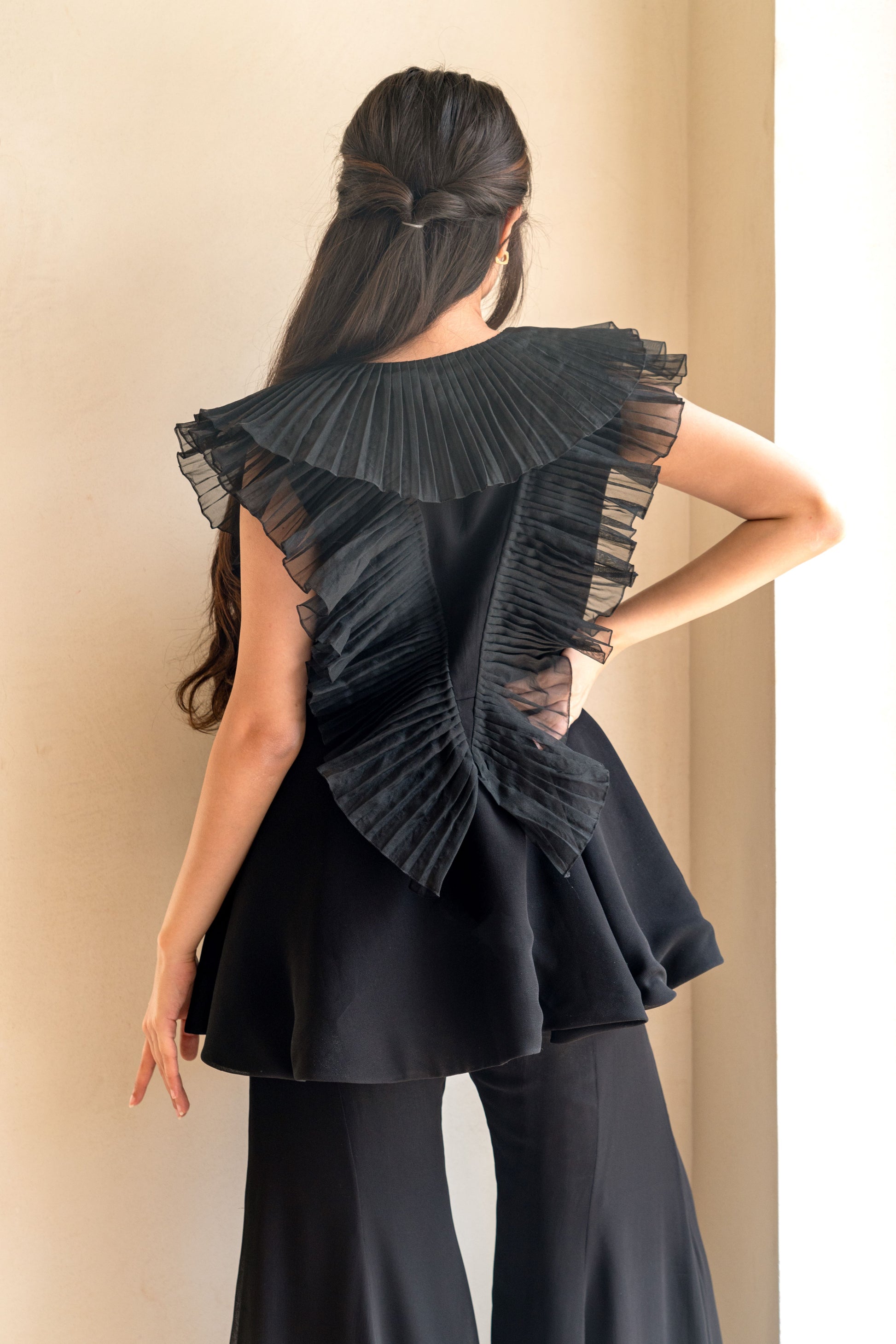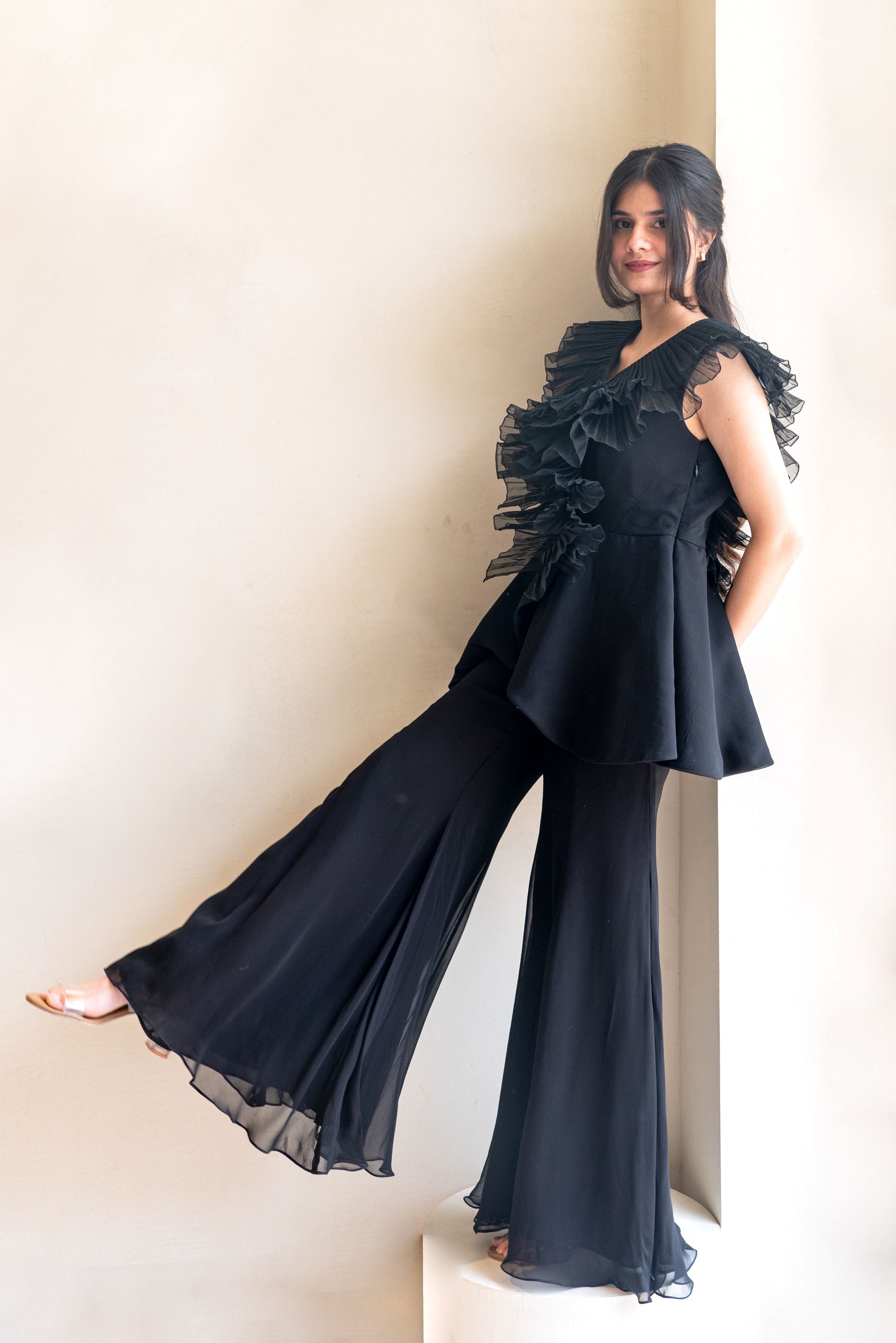 Chic-Black Pleated Co-ord set has peplum top with three layers of organza pleated ruffles attached to the neck, spreading on the shoulders and body. Paired with the kali bell bottom pants. Perfect for any date night, girl's night,cocktail,birthday!!!