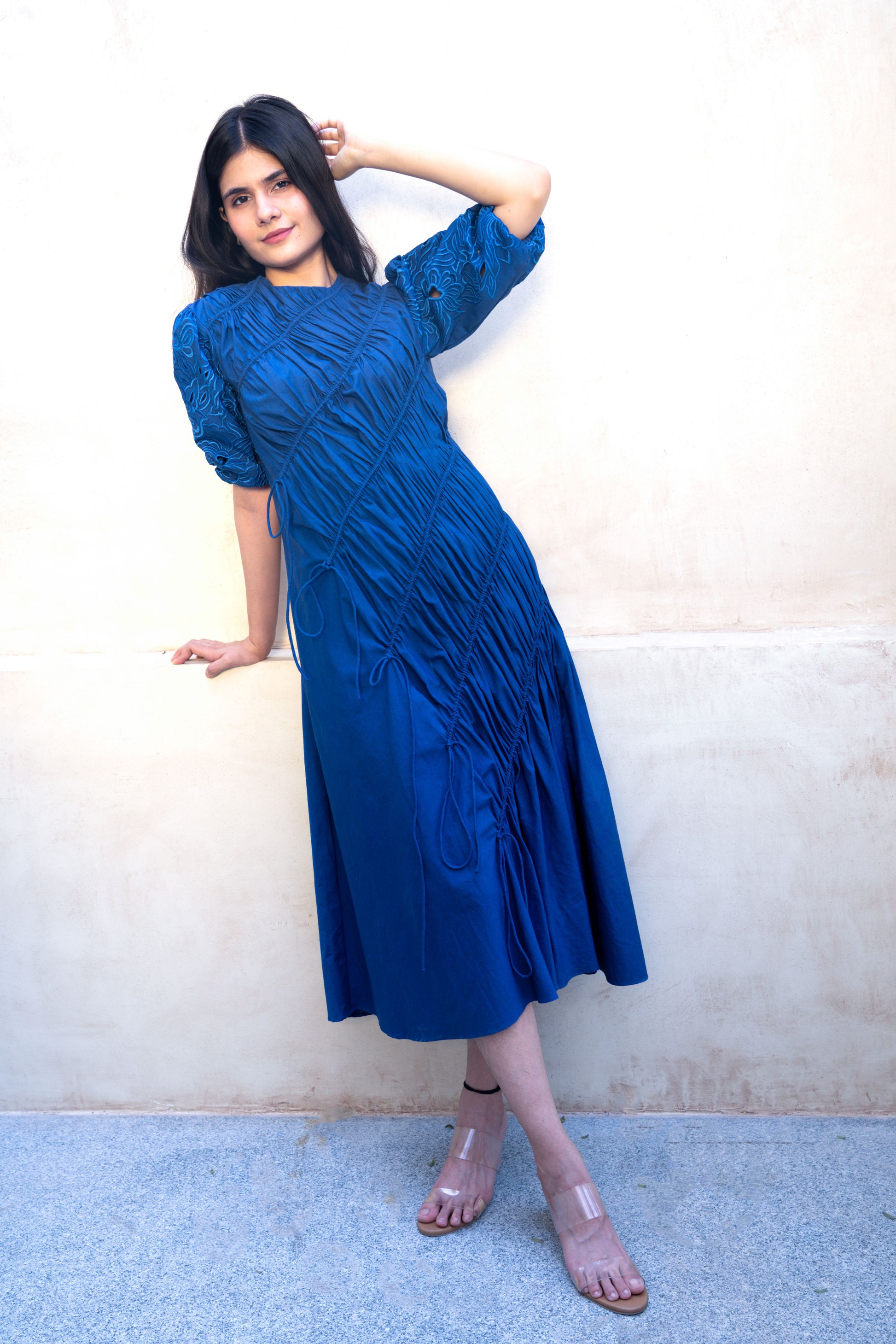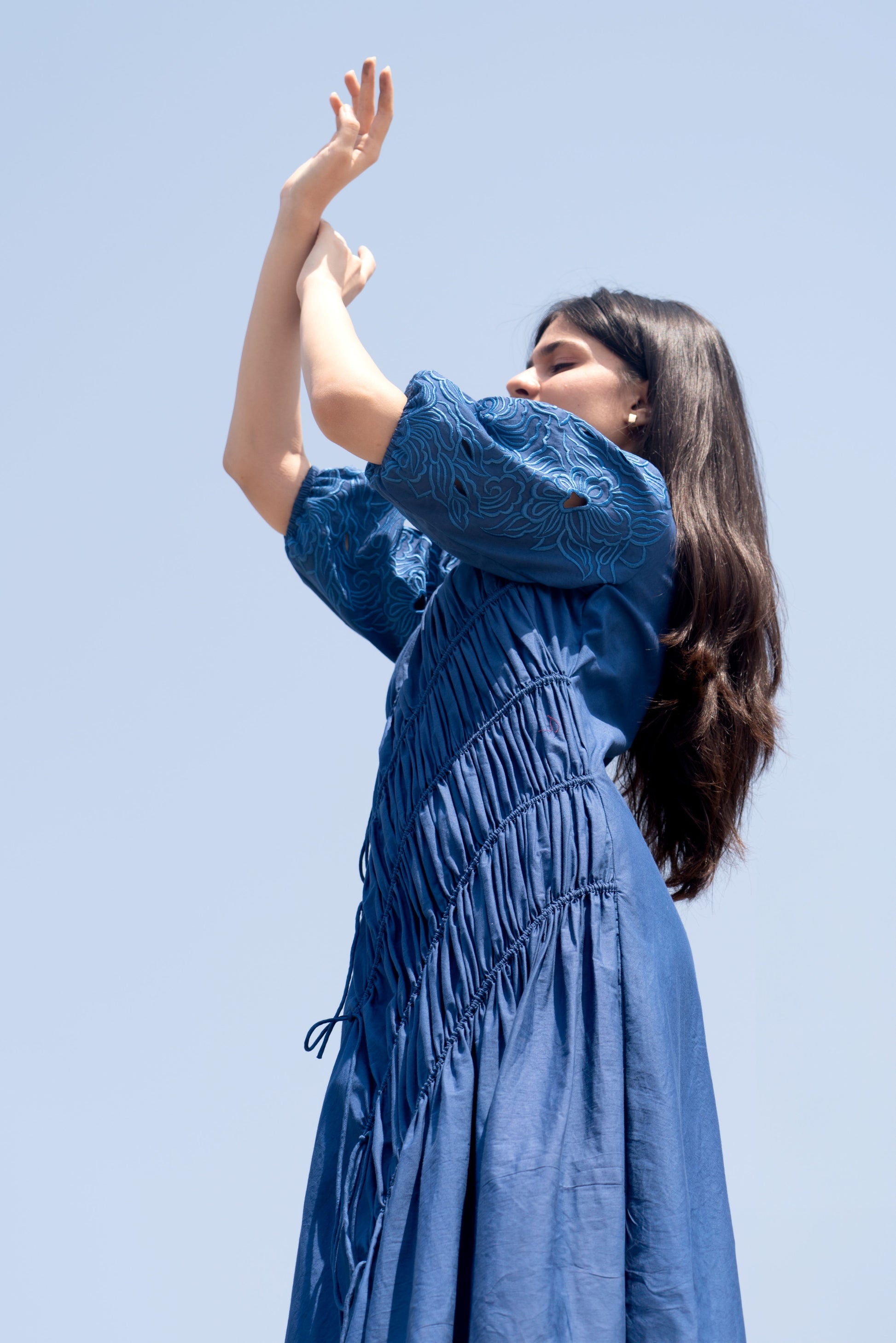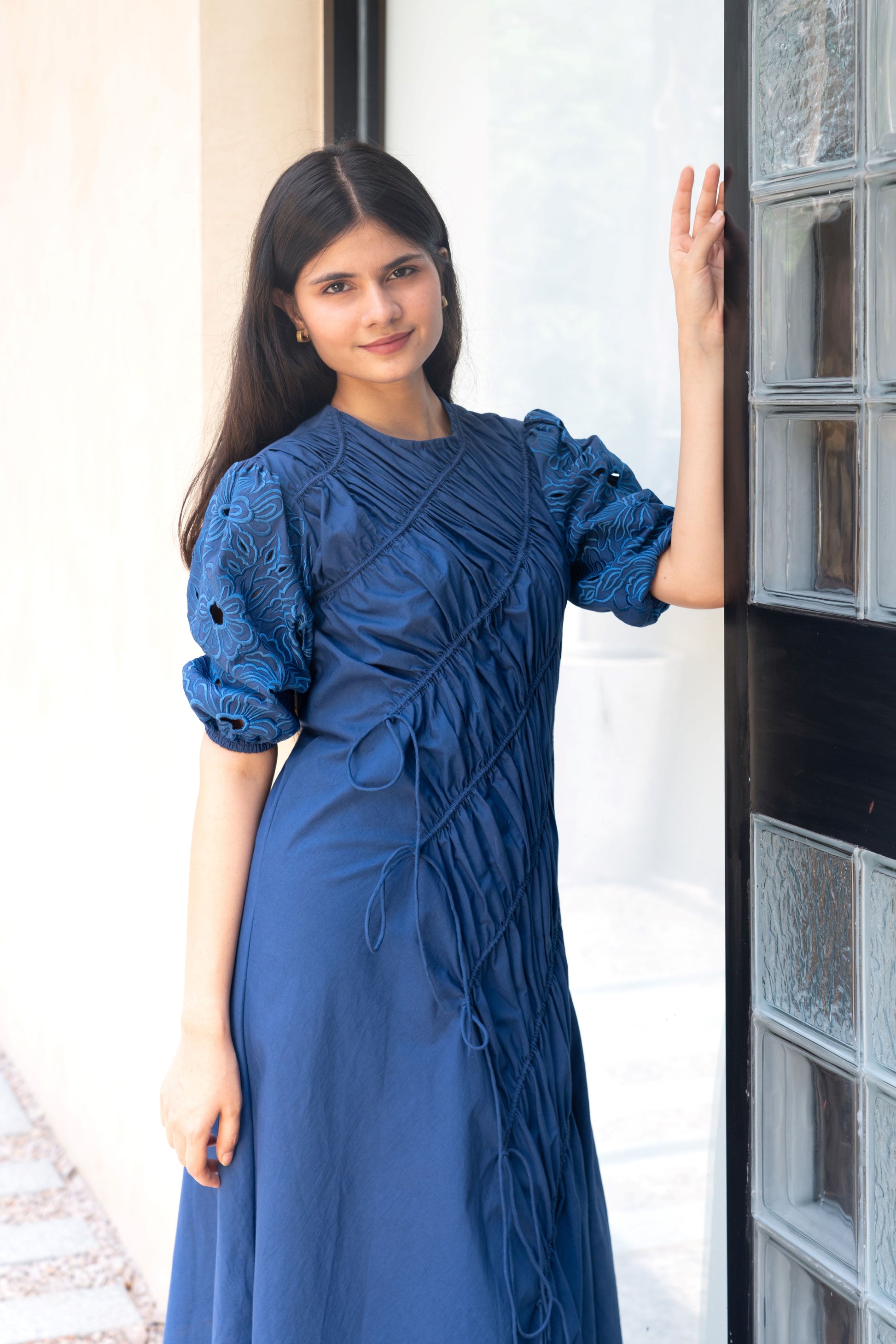 Light and airy the Blue cotton string dress has a closed round neck, tone-on-tone flower machine embroidery with delicate cutwork elbow-length puff sleeves featuring gathered strings along the body, adding a delightful texture that's both stylish yet comfortable.