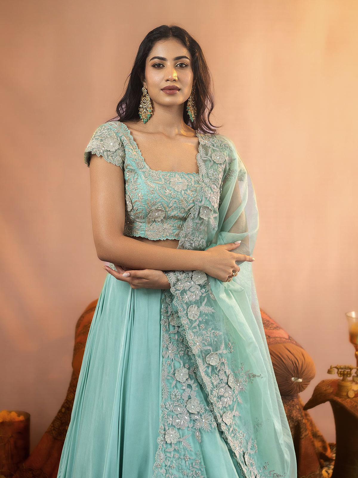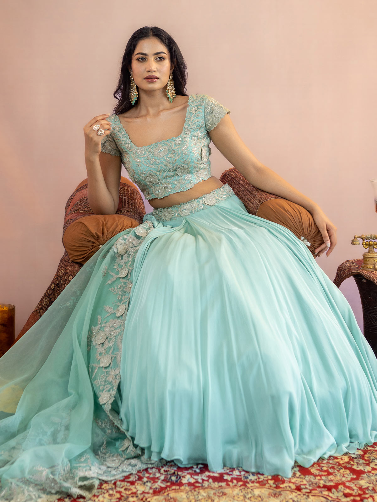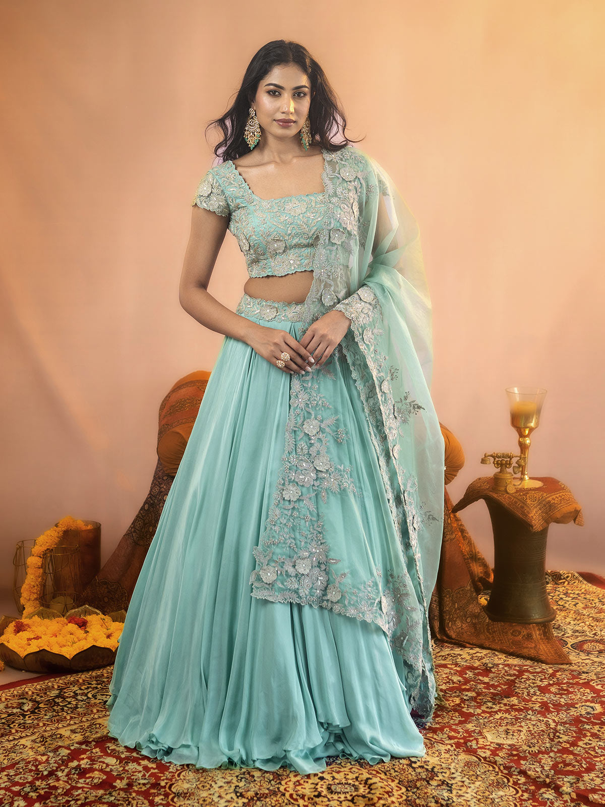 The Sea Green Lehenga consists of beautiful short blouse adorned with antique silver 3D flower work embroidery throughout the body. The deliciated embroidery adds a touch of glamour to the crop top. Paired with a flowy chiffon double-layered skirt. The attention to detail extends to the belt, which features Antique silver 3D flowers embroidery, adding a luxuries touch to the ensemble. The organza dupatta, intricately worked on all four sides, compliments the crop top and skirt beautifully. This outfit is a perfect choice for those seeking a blend of traditional craftsmanship and modern design.