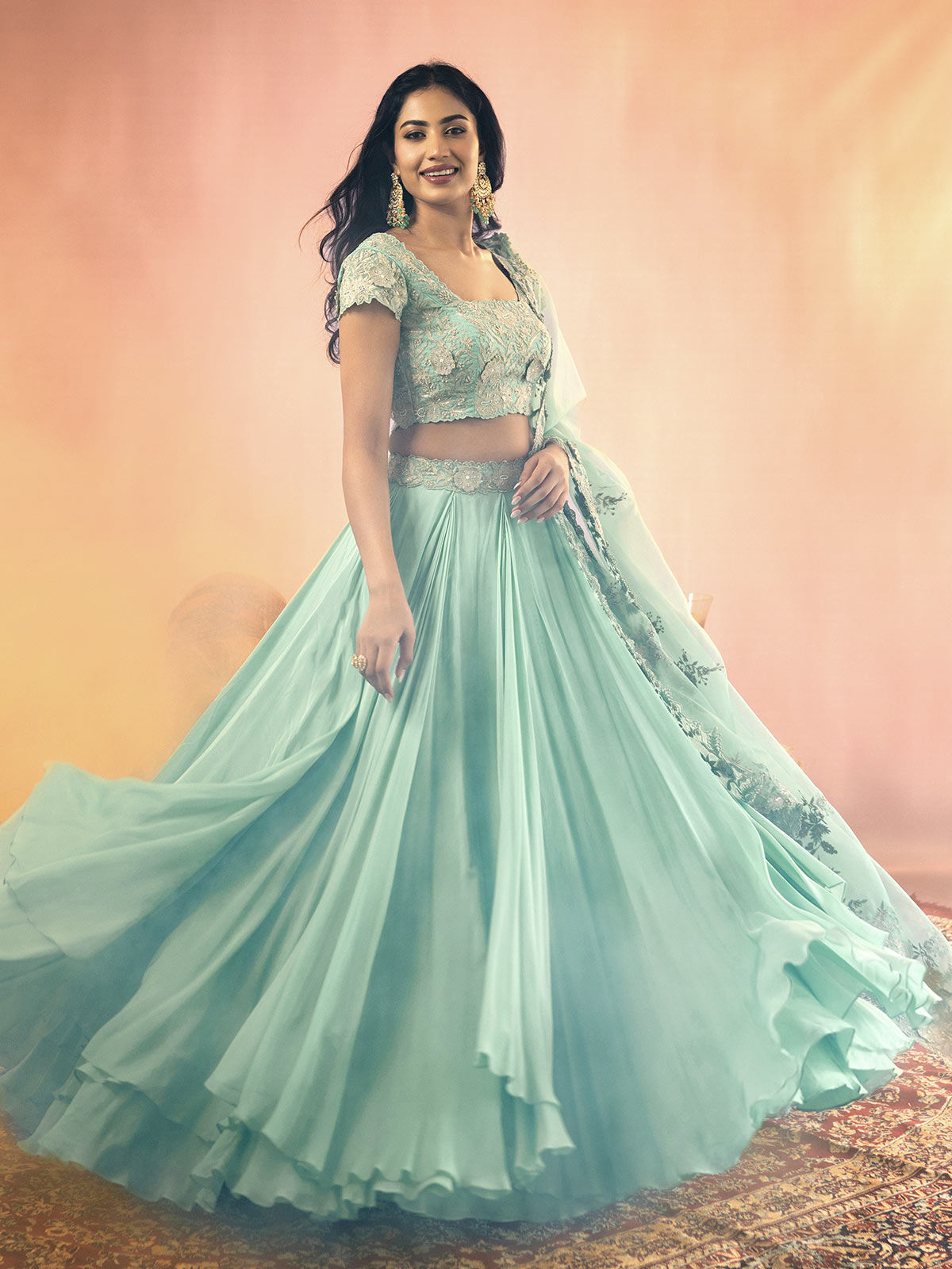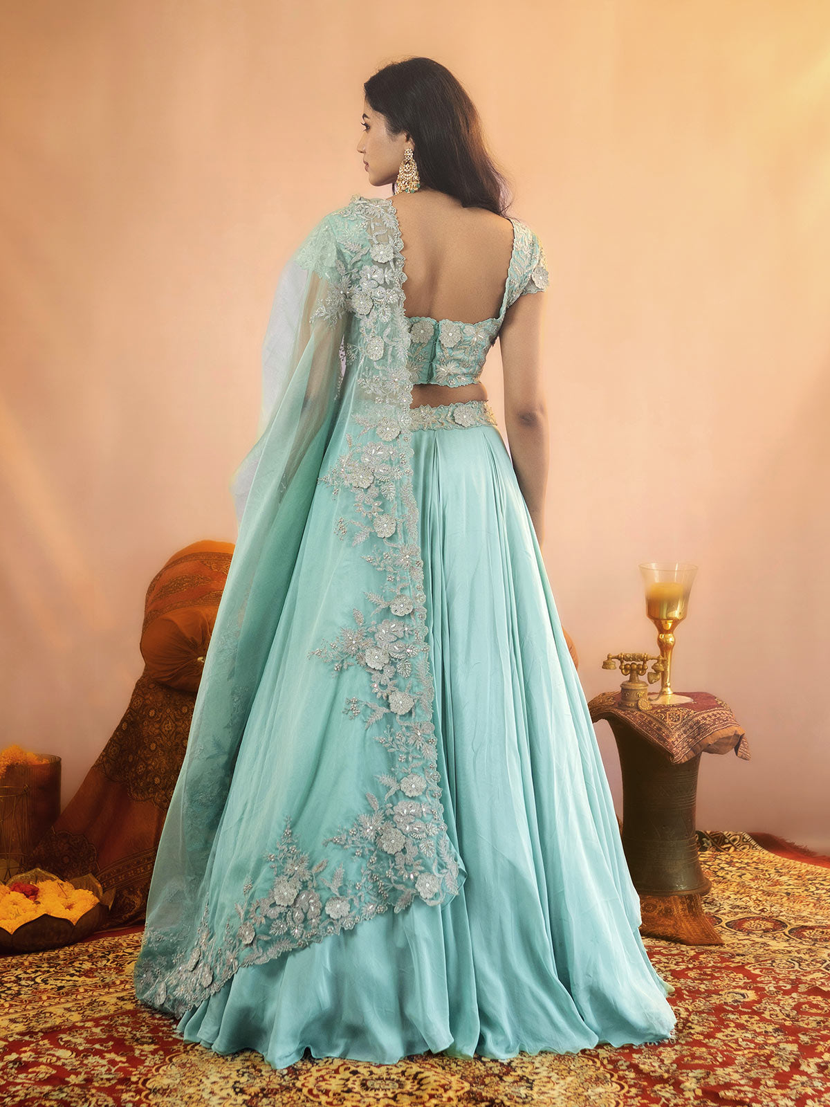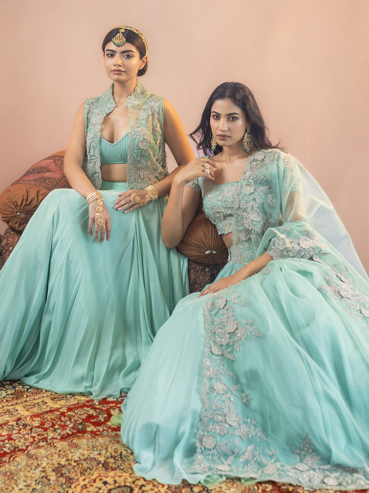 The Sea Green Lehenga consists of beautiful short blouse adorned with antique silver 3D flower work embroidery throughout the body. The deliciated embroidery adds a touch of glamour to the crop top. Paired with a flowy chiffon double-layered skirt. The attention to detail extends to the belt, which features Antique silver 3D flowers embroidery, adding a luxuries touch to the ensemble. The organza dupatta, intricately worked on all four sides, compliments the crop top and skirt beautifully. This outfit is a perfect choice for those seeking a blend of traditional craftsmanship and modern design.