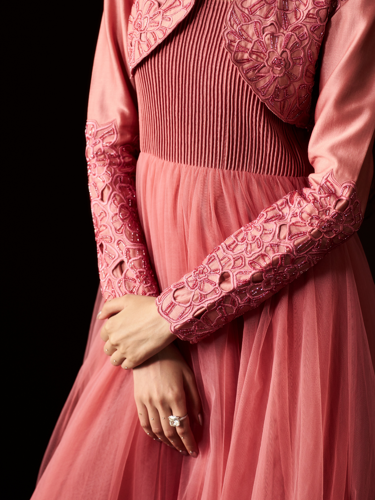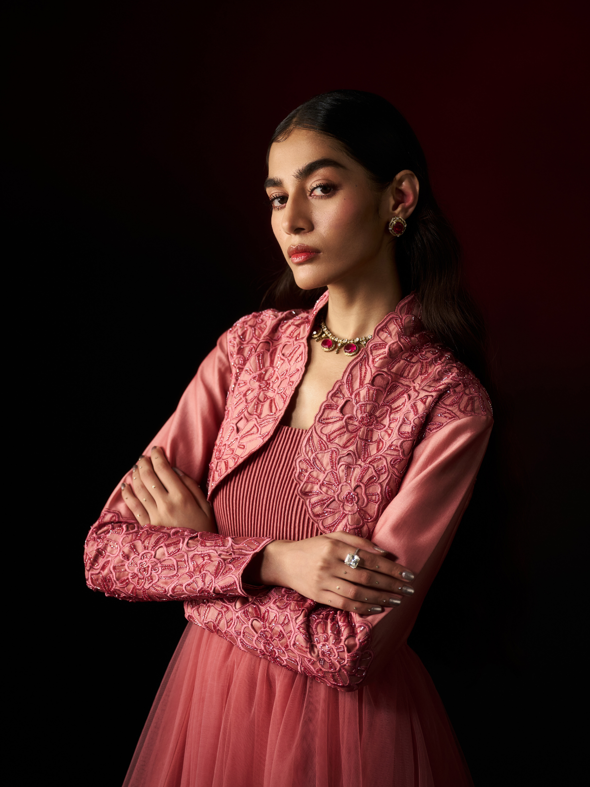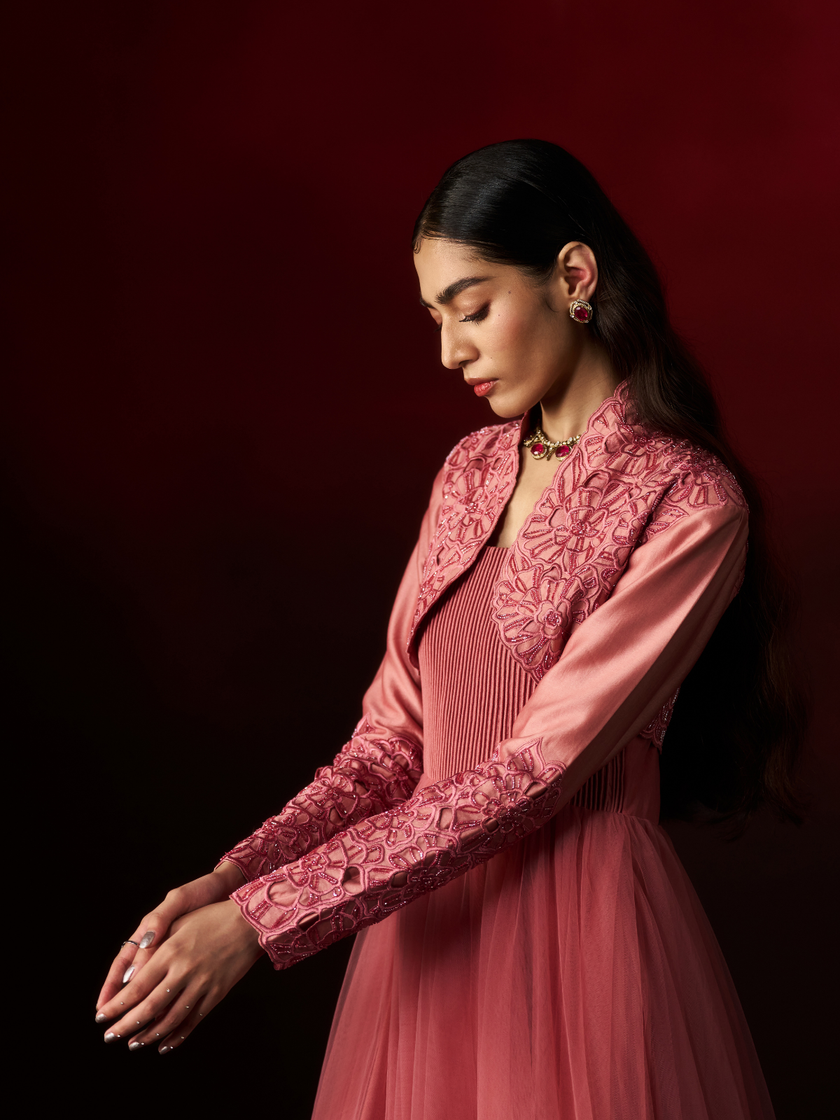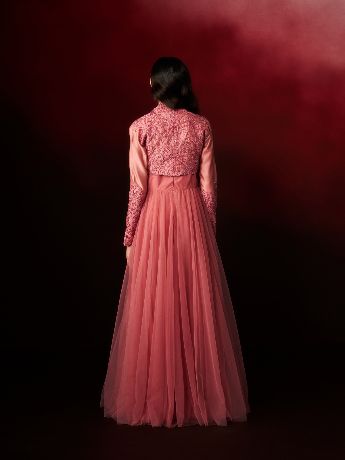 Elevate your style with this Dusty Rose Gown, featuring a mauve ankle-length net design accented by sleek straight cord piping that enhances its modern silhouette. Paired with a chanderi full-sleeve short jacket adorned with delicate blossom-inspired machine embroidery, intricate cut work, and subtle tone-on-tone dead work, this ensemble exudes elegance. Perfect for special occasions, it promises to make you stand out with its refined craftsmanship and contemporary charm.