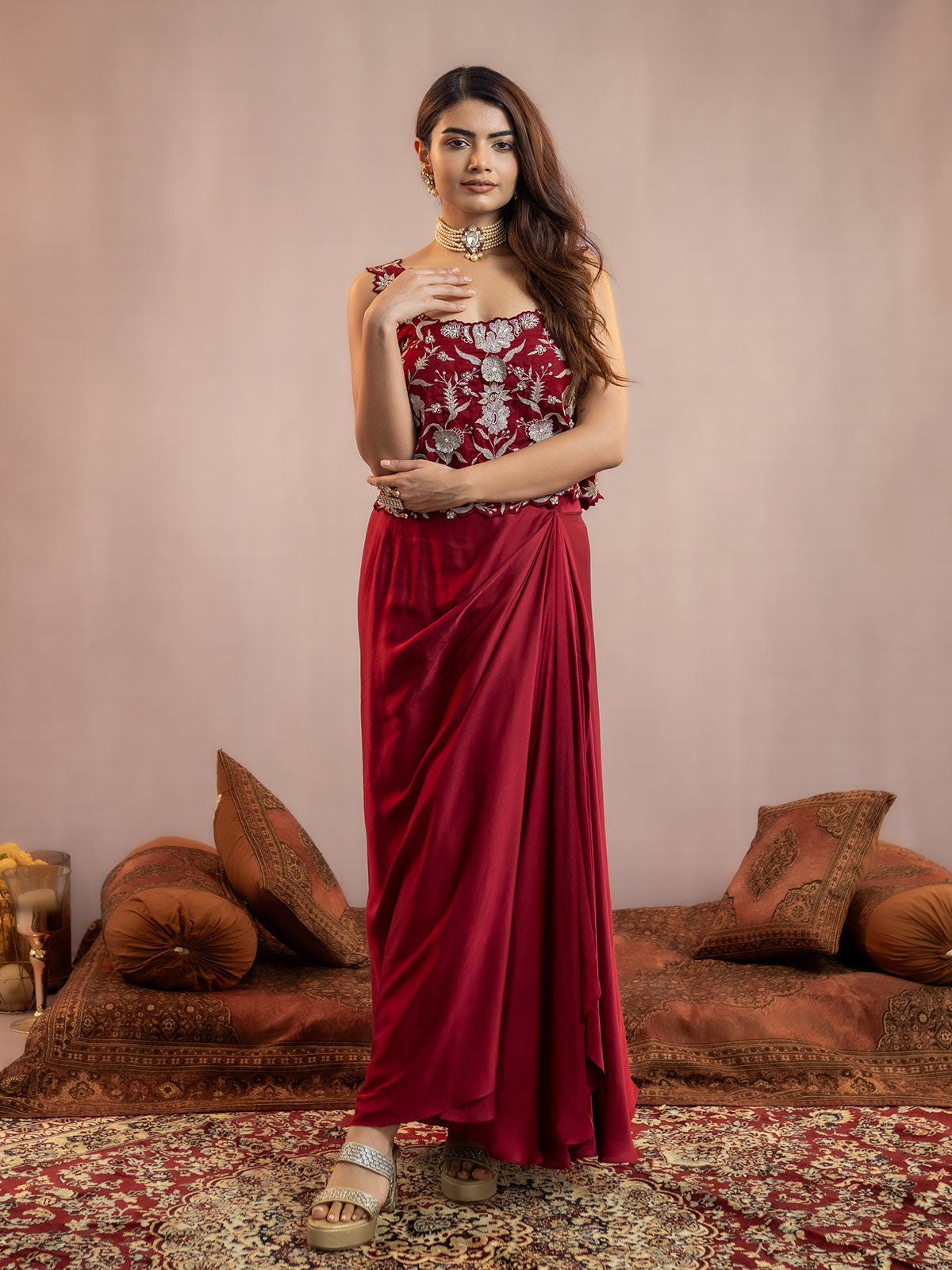 This stunning maroon short sleeveless top is beautifully embellished with intricate antique silver kasab 3D embroidered work. Paired with a Luxurious satin drape skirt, this ensemble exudes elegance and sophistication, making it perfect for any special occasion.