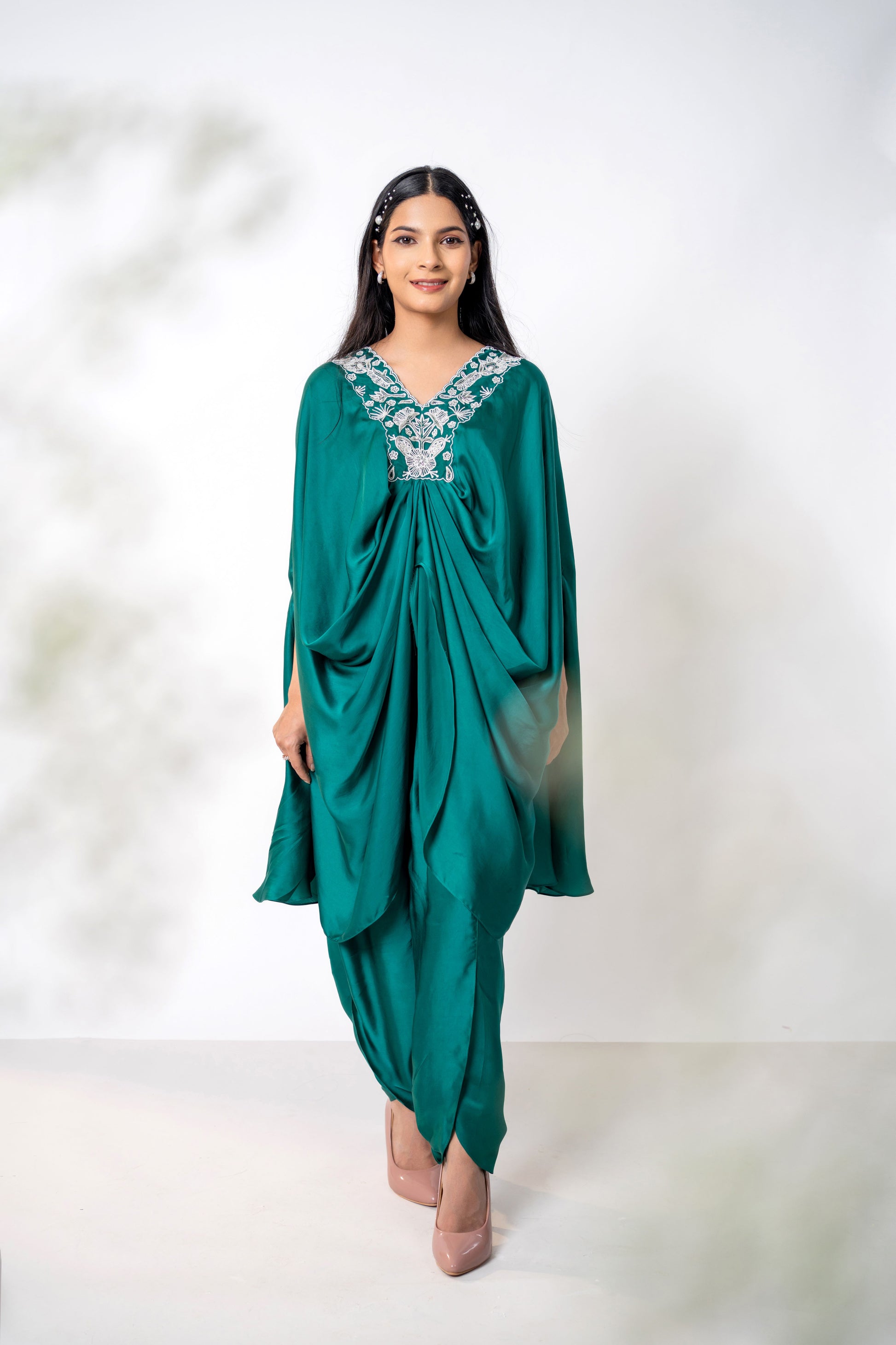 A Free-Size Draped Kaftan paired with Tulip Pants. Crafted from bemberg satin, it boasts a fluid silhouette for ultimate comfort. The yoke is embellished with contrast embroidery, featuring delicate pearls and intricate threadwork. All in a vibrant teal shade