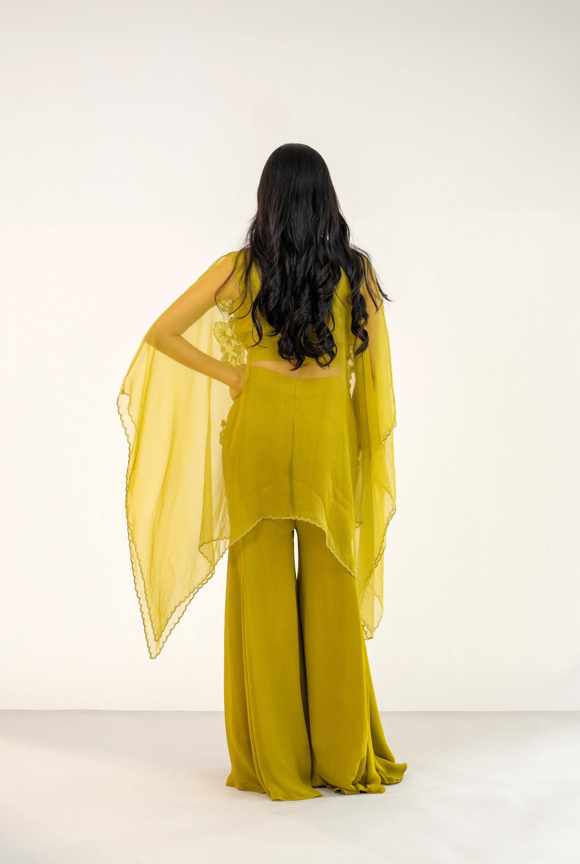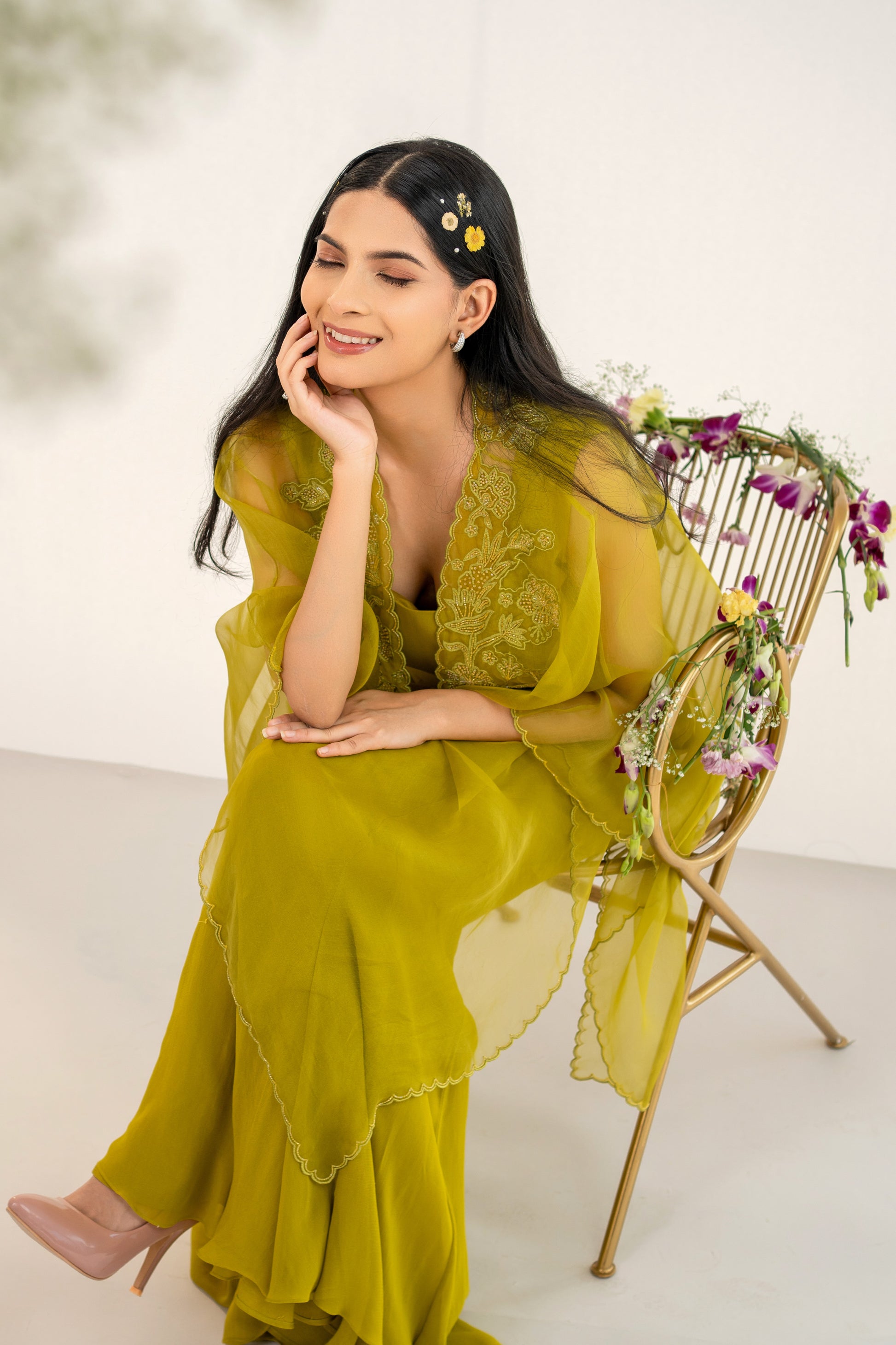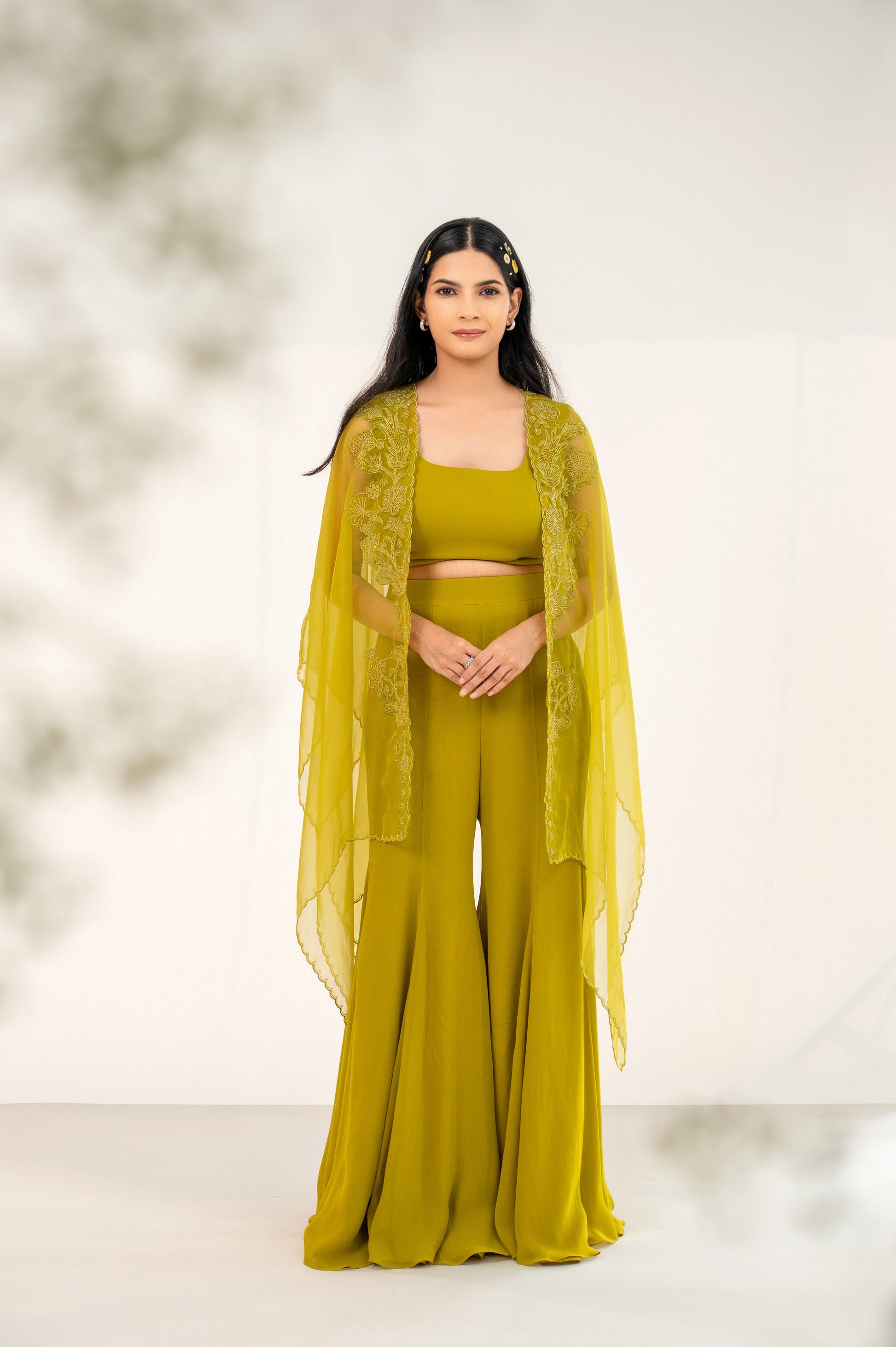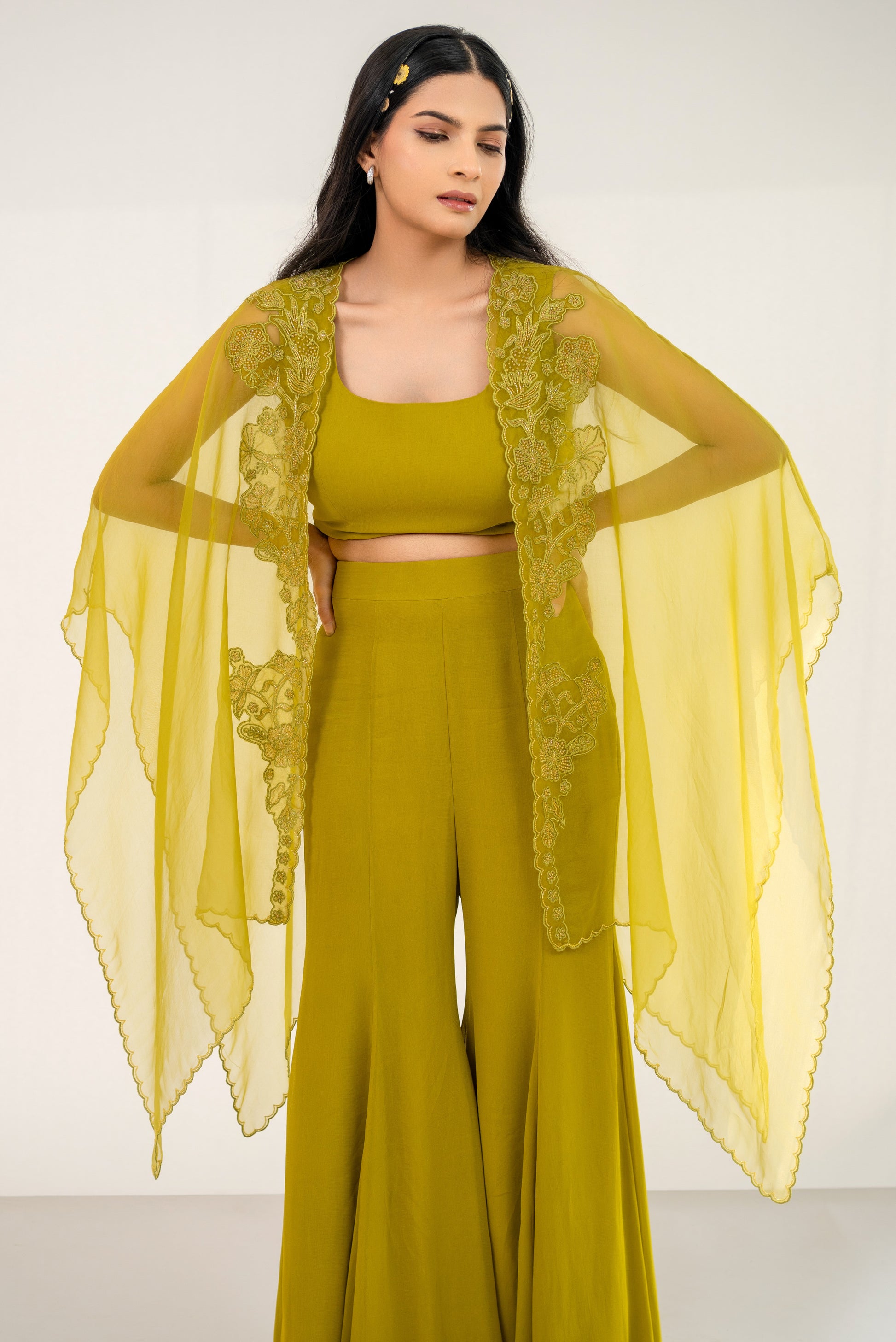 A throw-on organza cape embellished with intricate floral hand embroidery, cutwork, and thread work, perfectly paired with a sleeveless crop top and kali bell-bottoms. All in a stunning olive hue.