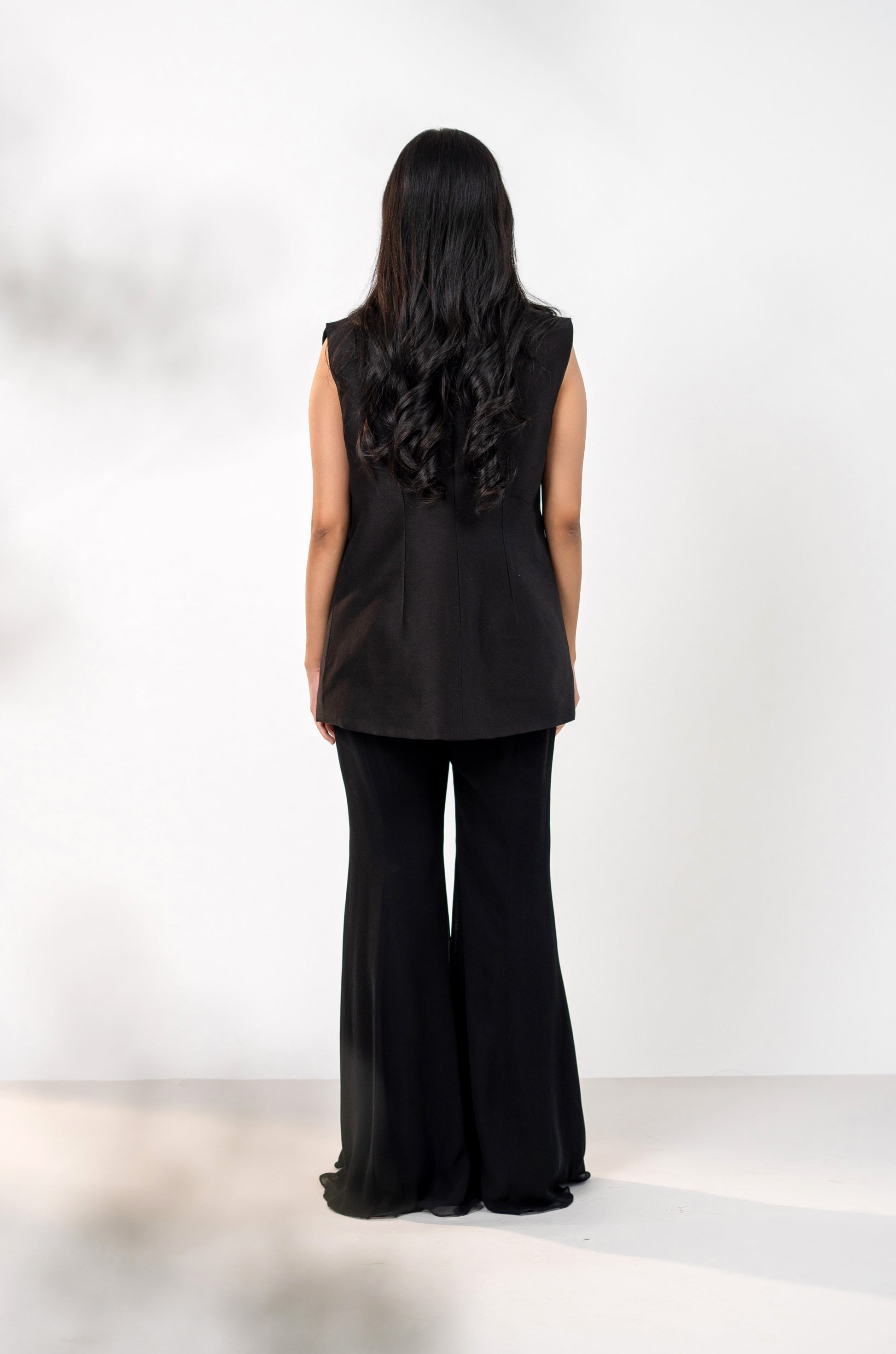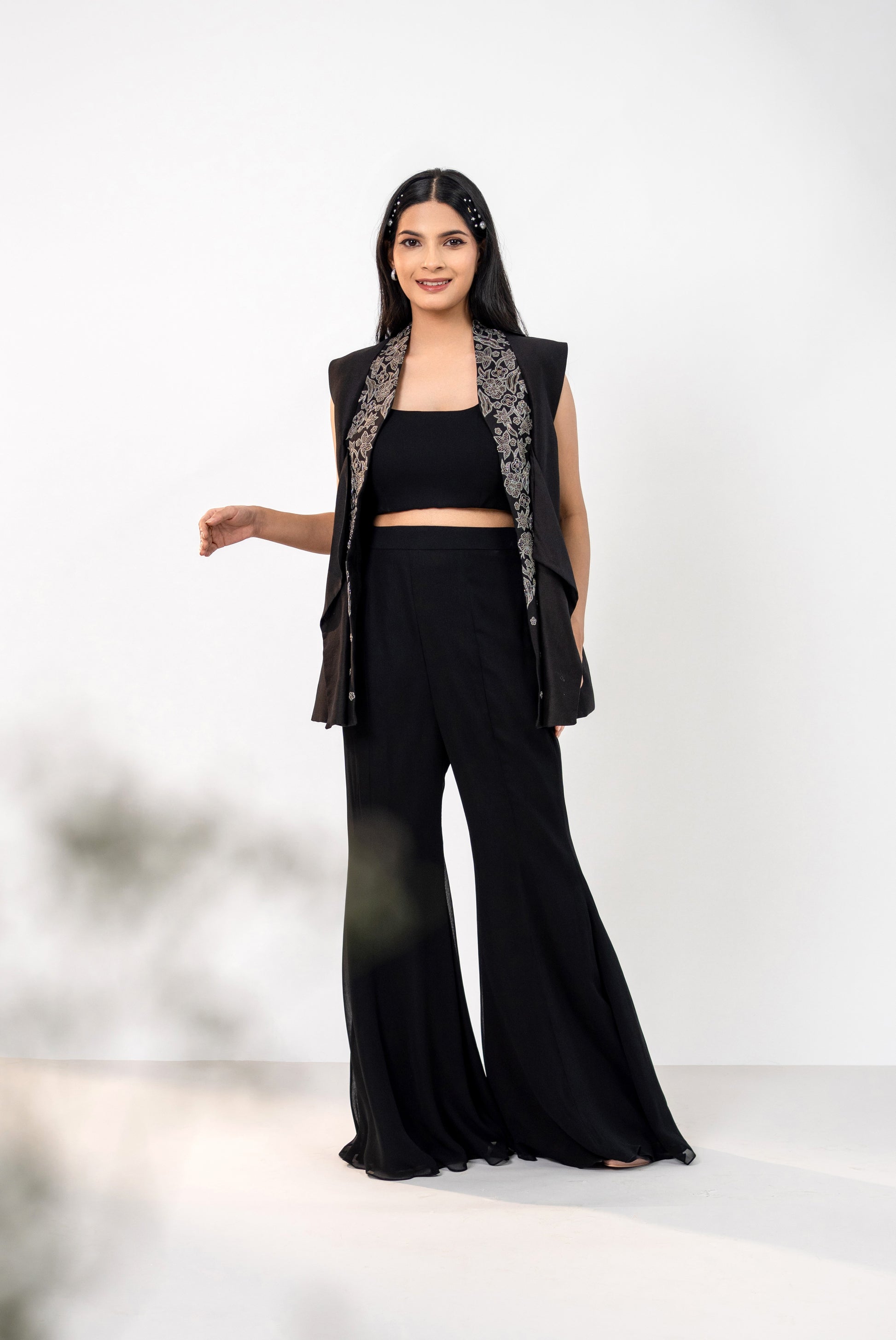 Sleeveless embellished blazer paired with a crop top and kali bell bottoms, all in black. The black blazer features grey pearl and thread work on a shawl collar, along with stylized flaps.