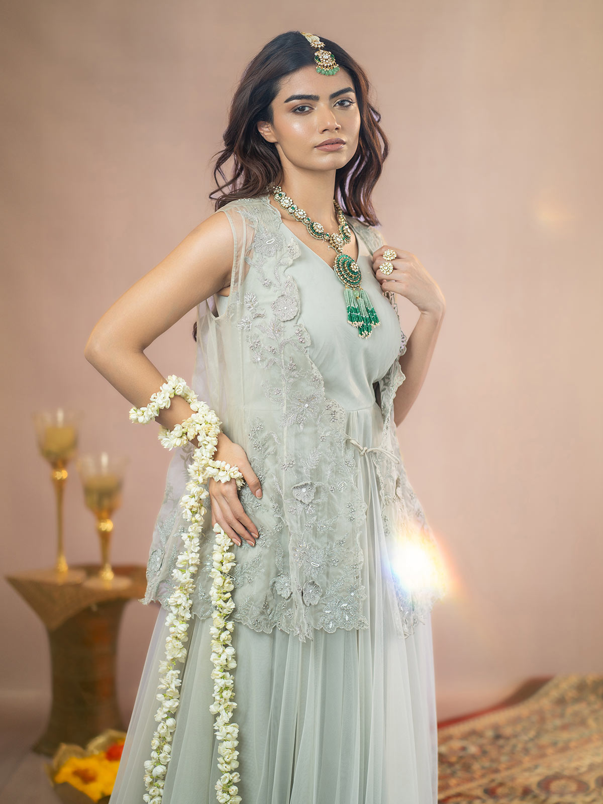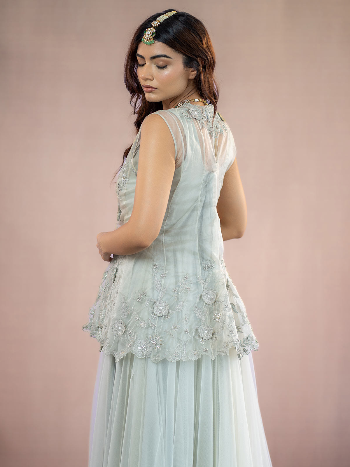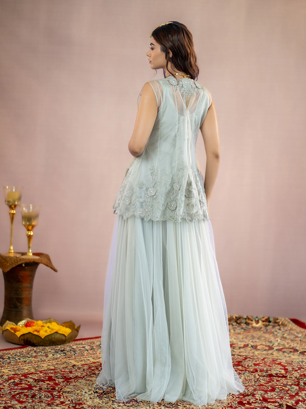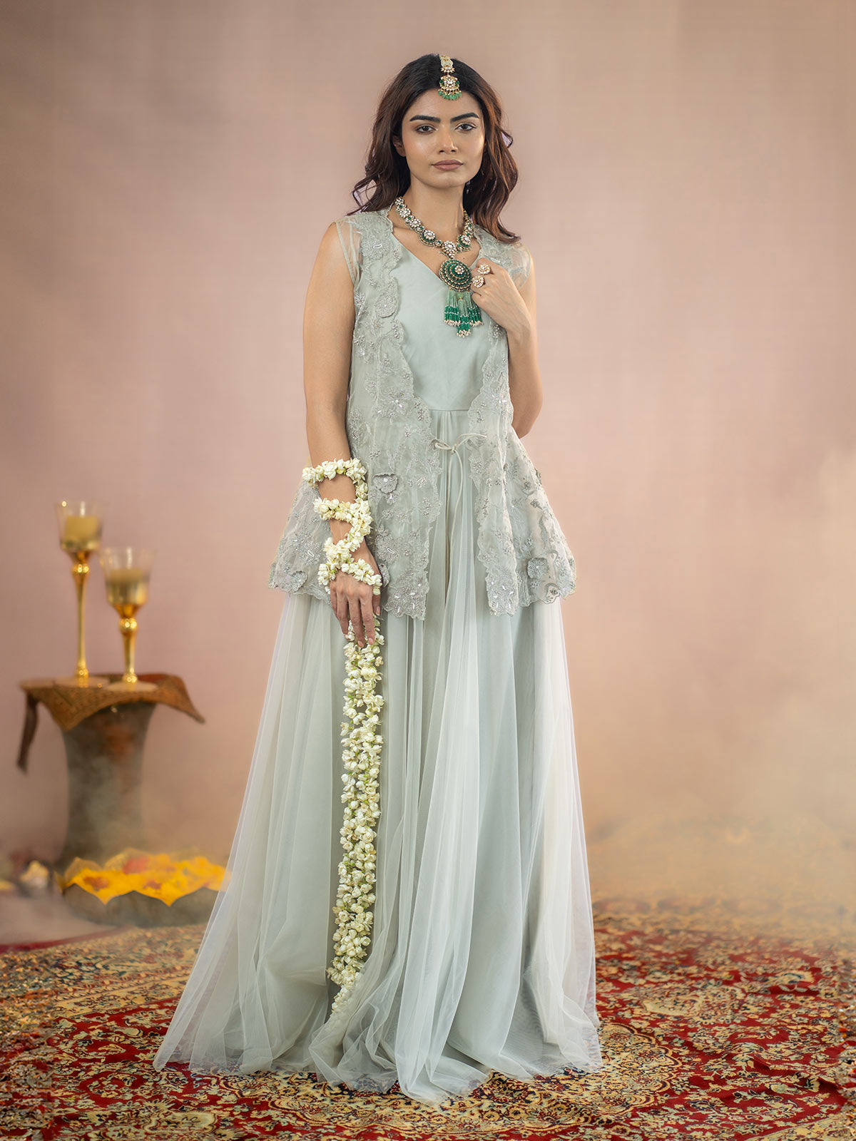 This Sophisticated grey organza jacket features exquisite antique silver kasab 3D flower embroidery, creating a stunning visual appeal. Complemented by a flowing net full-length gown, this ensemble radiates elegance and refinement, ideal for making a memorable impression at any event.