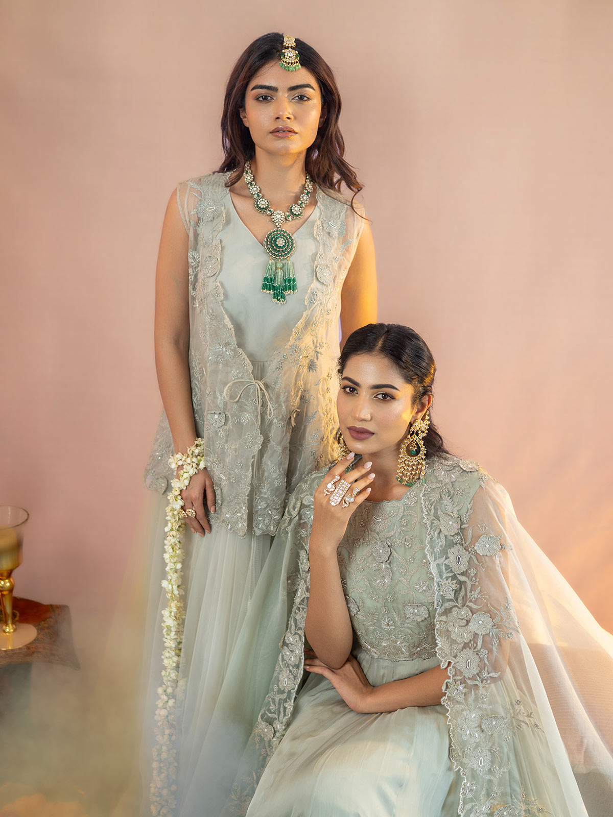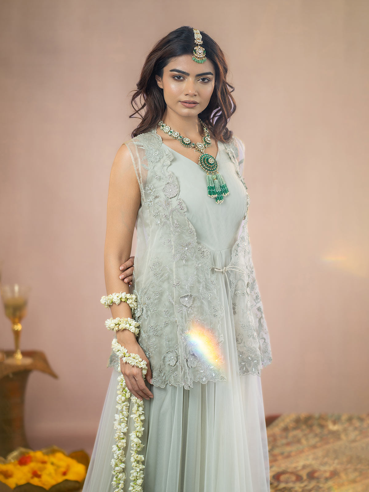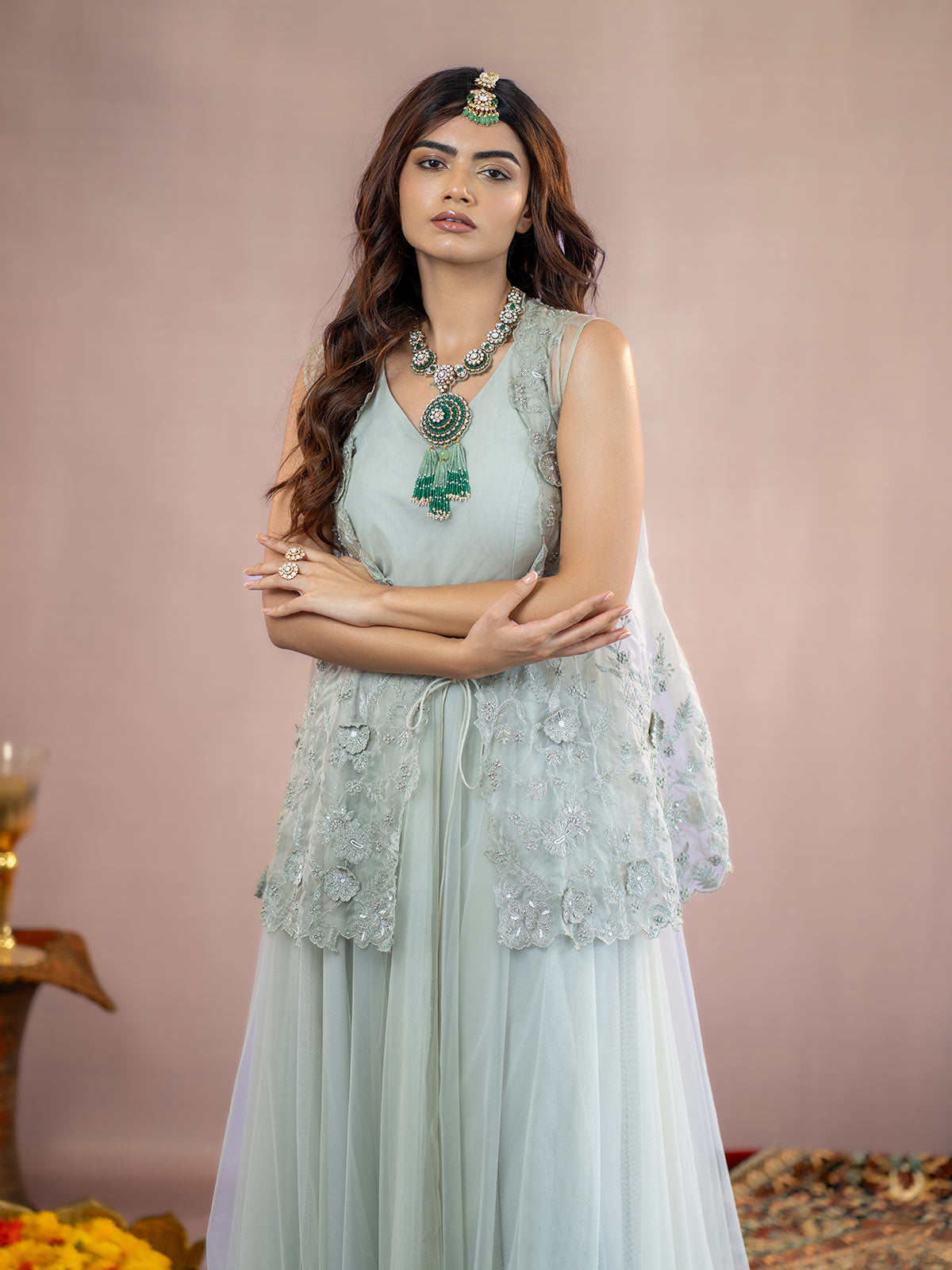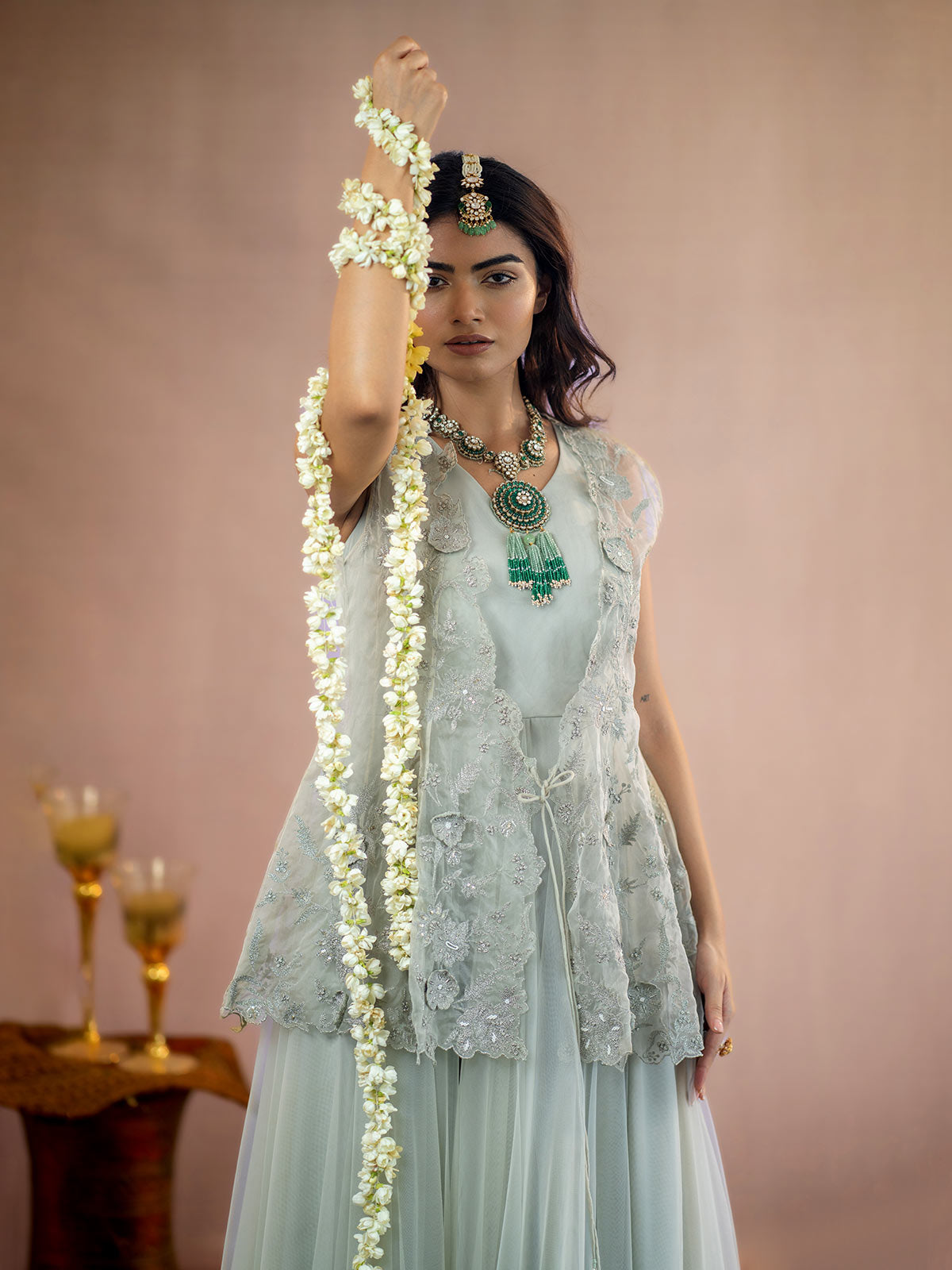 This Sophisticated grey organza jacket features exquisite antique silver kasab 3D flower embroidery, creating a stunning visual appeal. Complemented by a flowing net full-length gown, this ensemble radiates elegance and refinement, ideal for making a memorable impression at any event.