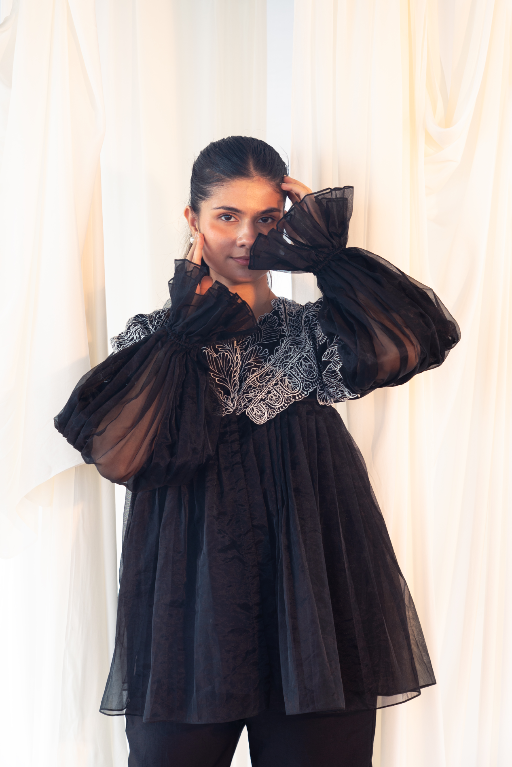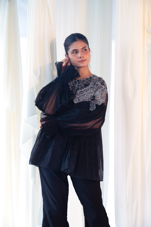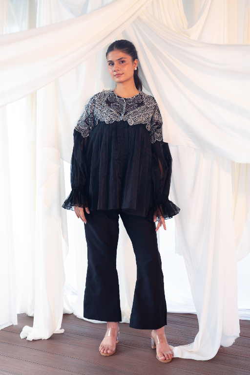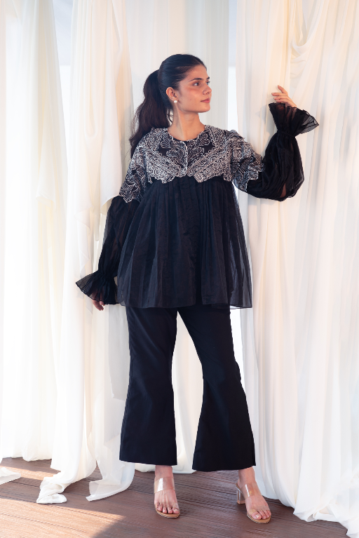 Embrace timeless elegance with the Grace Coord in Midnight Black. A symphony of style, it showcases a pleated organza shirt adorned with exquisite white thread embroidery, paired with a luxurious Chanderi inner and coordinating bell-bottom pants. This ensemble is your perfect companion for making an unforgettable impression.