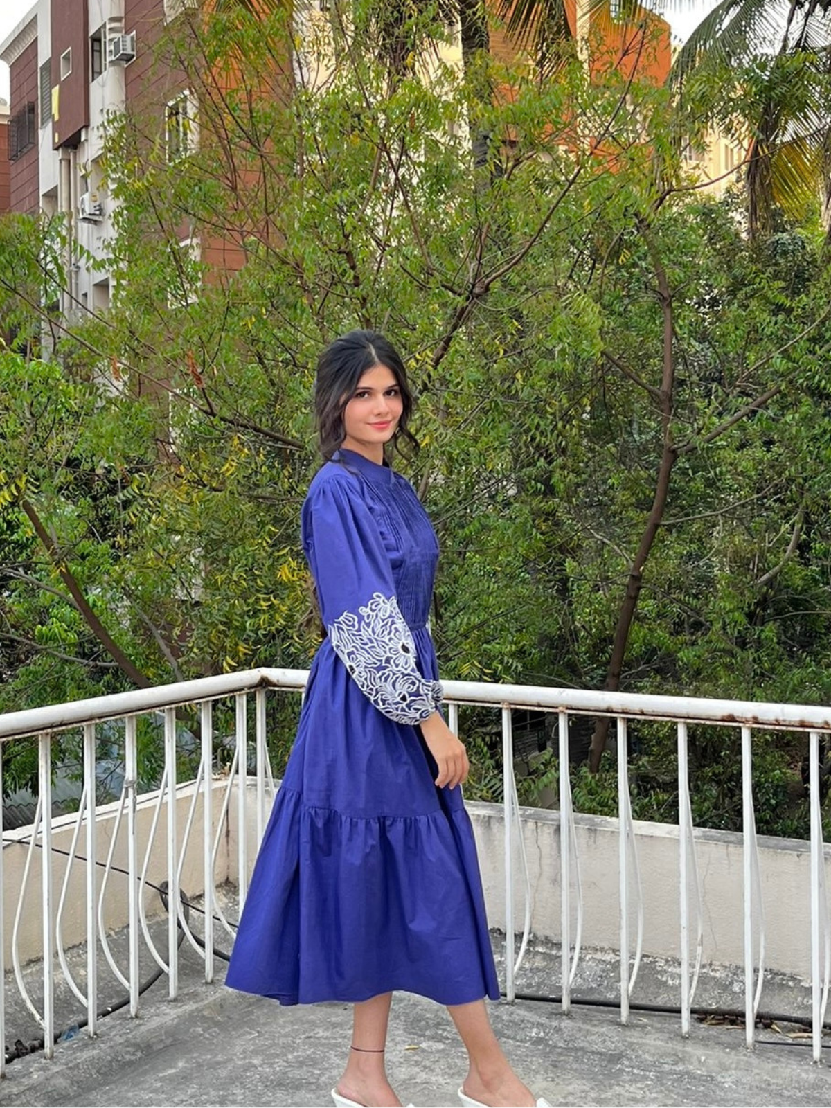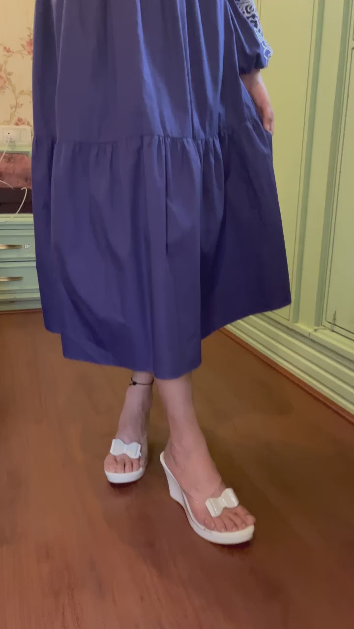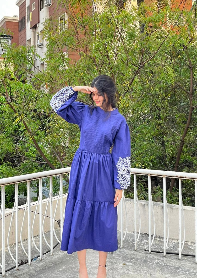 Relish the summer days in this beautiful ink-blue dress with a pleated yoke, contrasting embroidery on the sleeves, and intricate cutwork details. Crafted from luxe cotton, this dress is perfect for any occasion.
