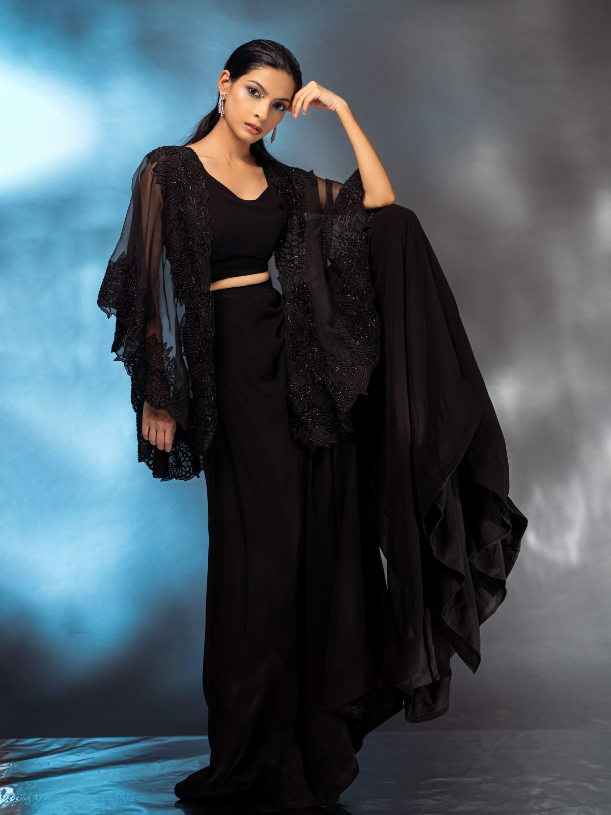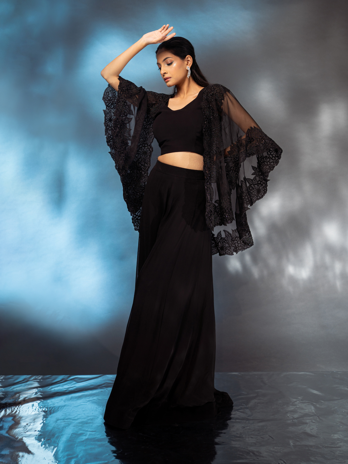 Look no further for a classic and stunning statement piece! The Isla Cape Set is perfection, with its georgette bustier and flared pants paired with an embellished throw-on organza cape in black. You'll be sure to make a style statement!