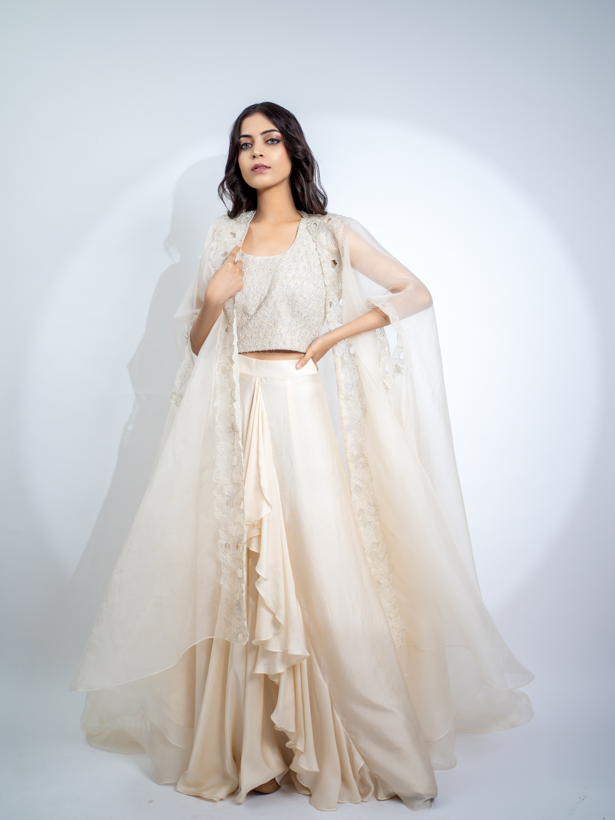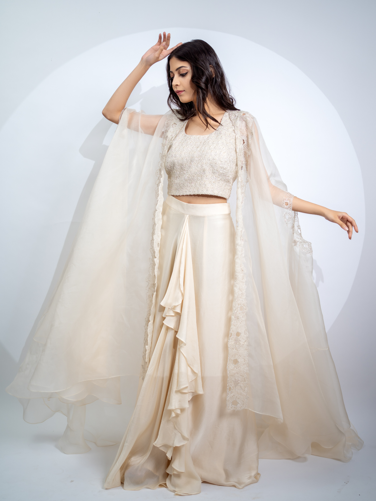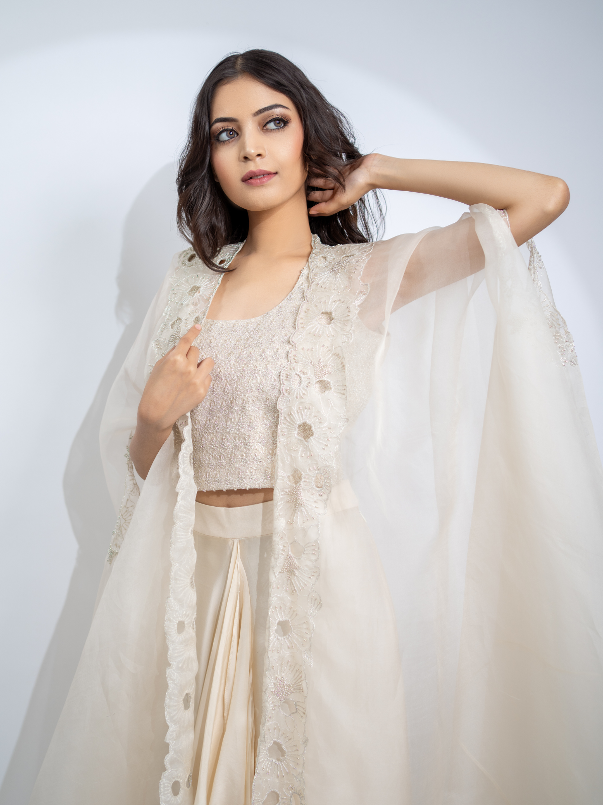 The ivory drape skirt with kasab detailed hand-embroidered top is an elegant look. Add the sheer organza cutwork cape to make it truly fly!