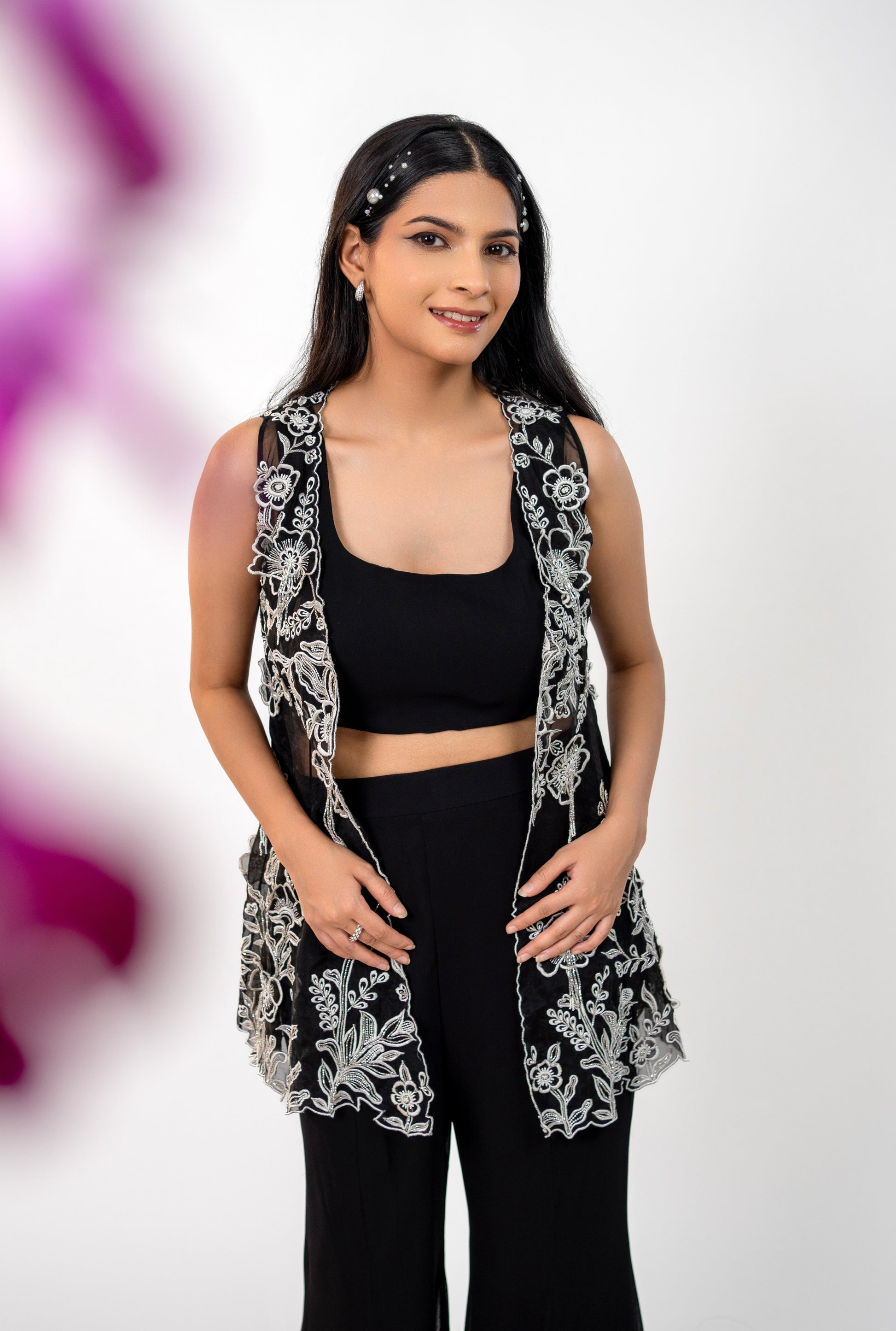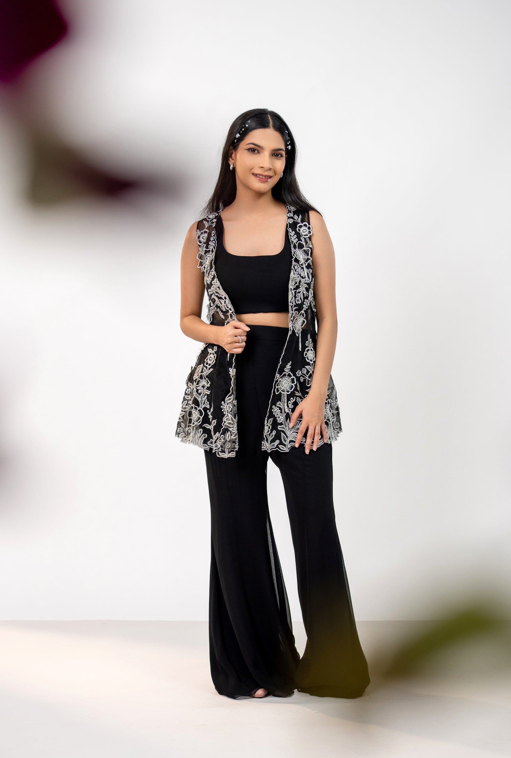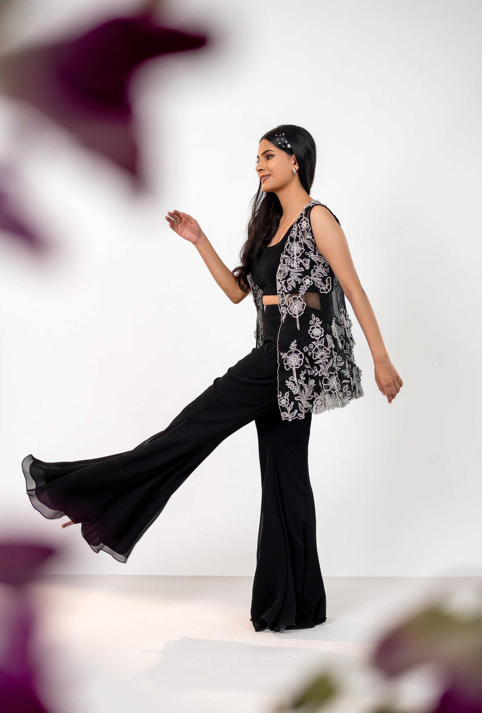 A georgette crop top and kali bell bottom paired with a black jacket. The heavily embellished jacket features contrast 3D floral work with Katdana hanging tassels and intricate thread work throughout.