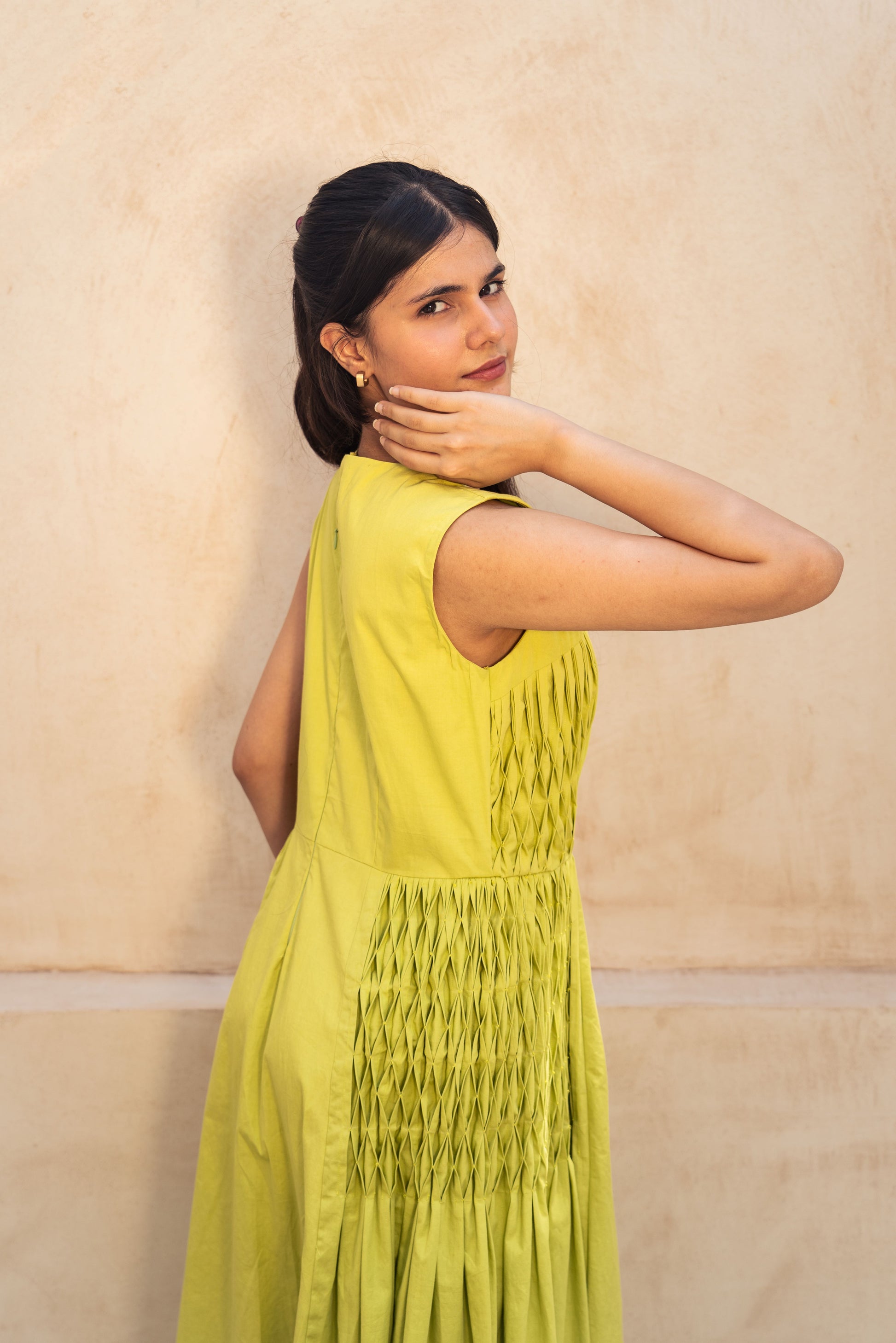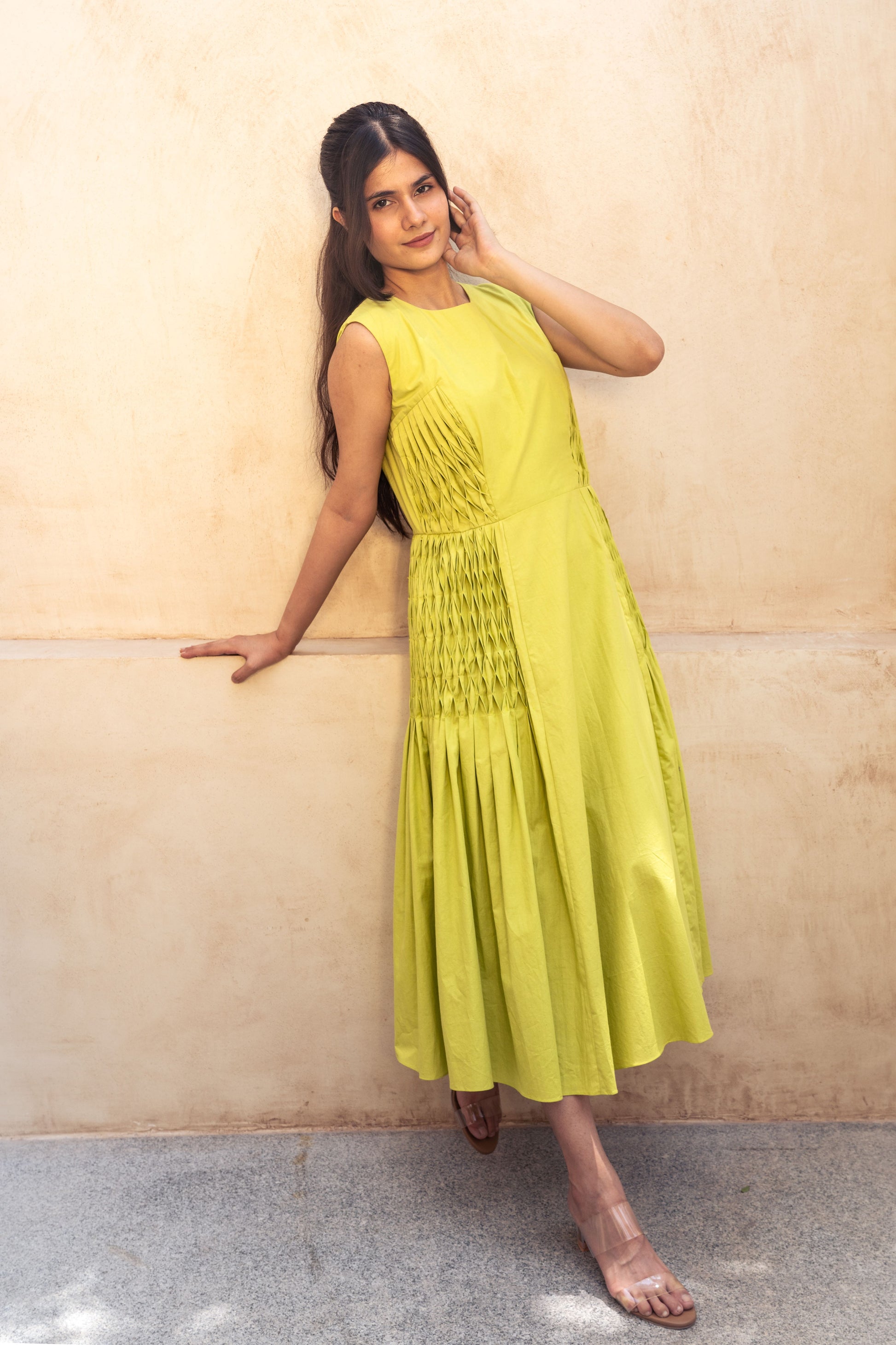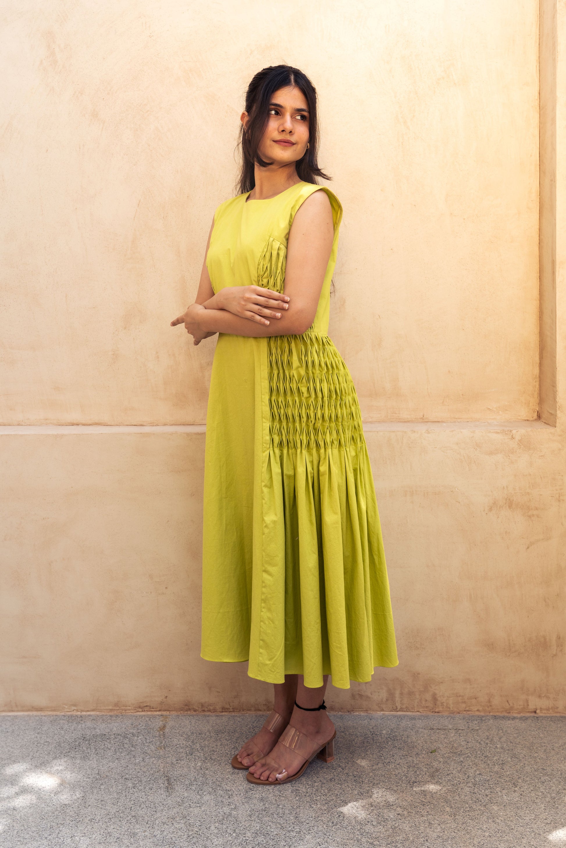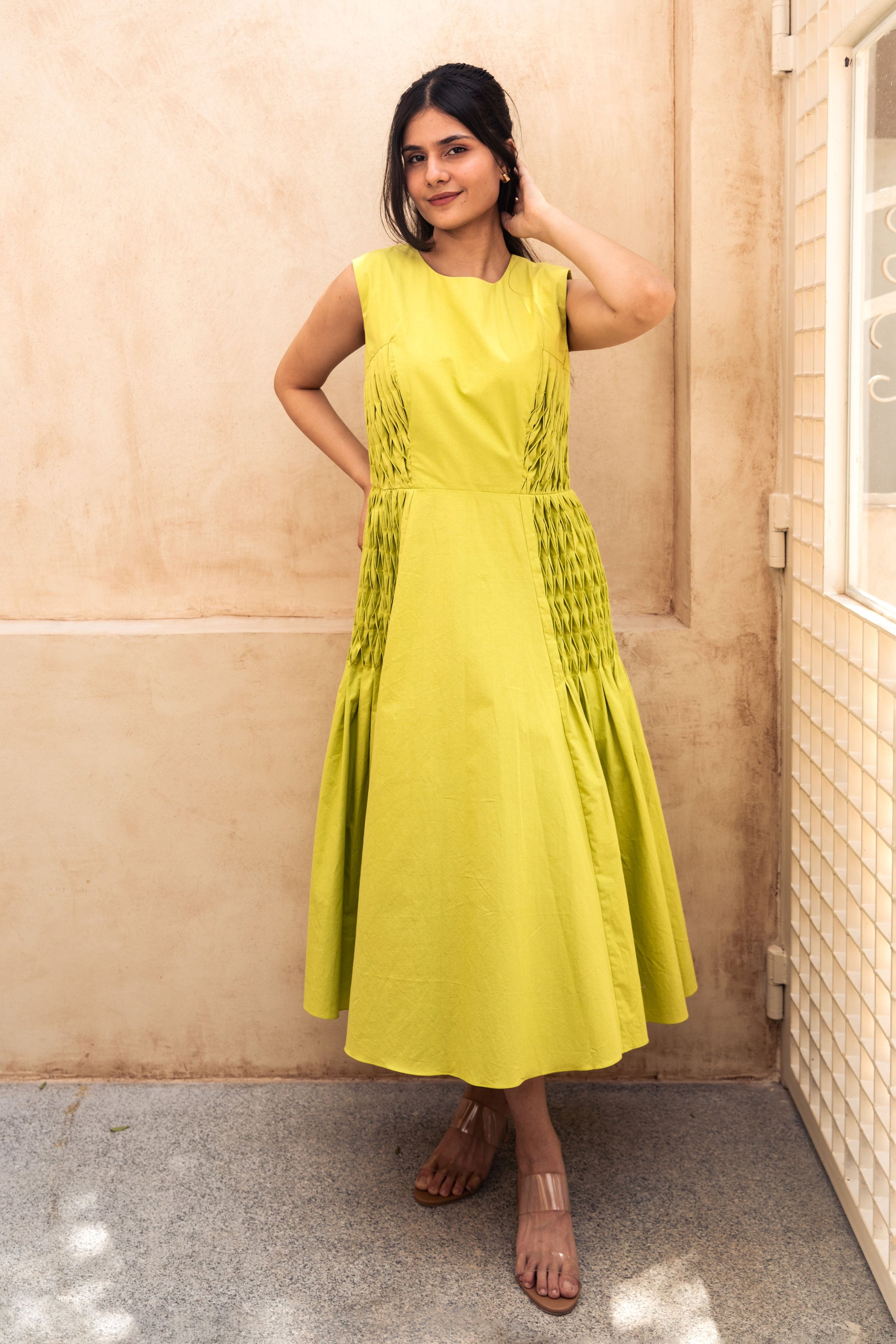 Light and airy Lime cotton dress with smocking on the sides.The smocking on the side adds a unique touch and look stylish. A sleeveless easy to style dress for any summer day out!