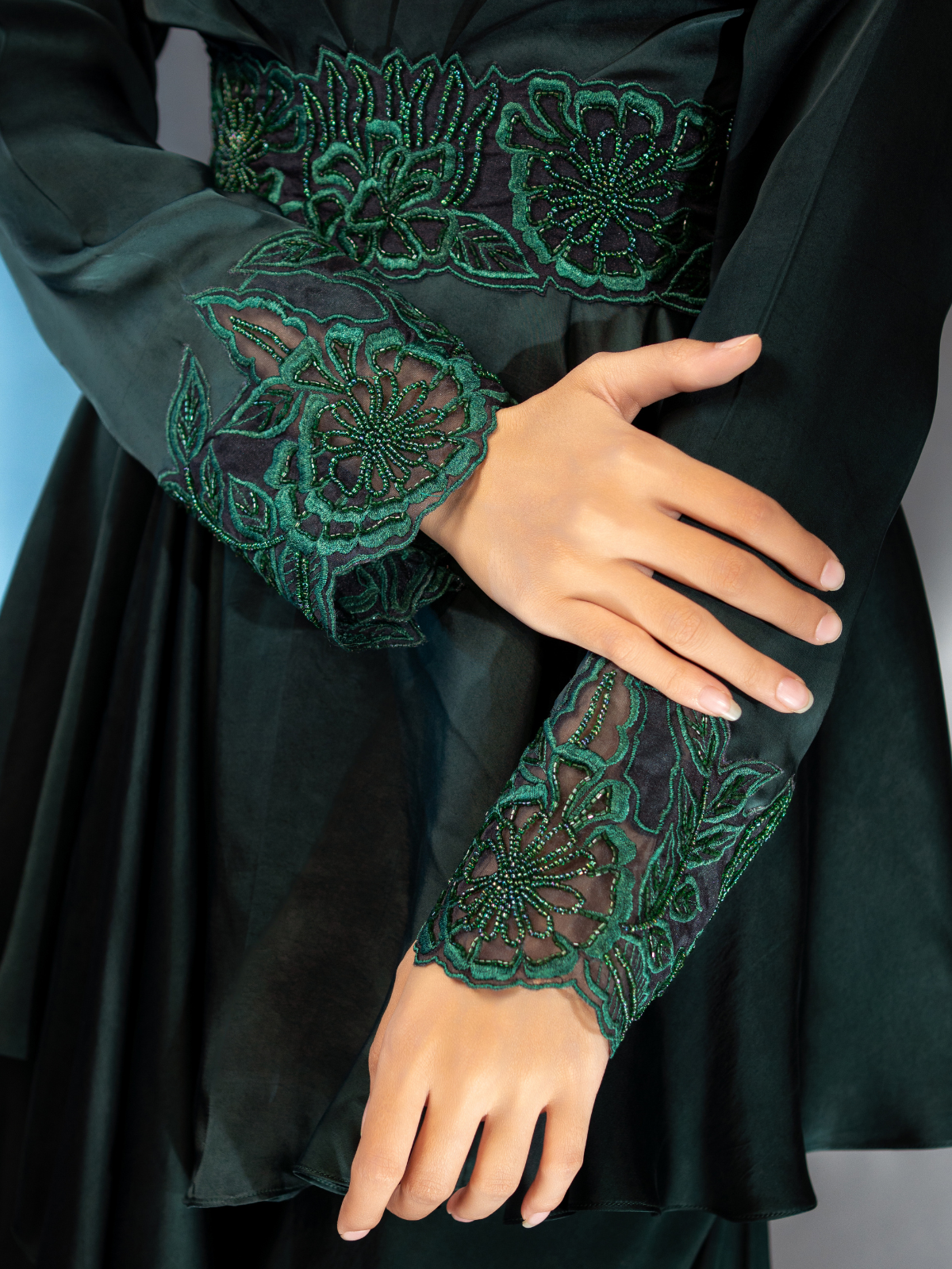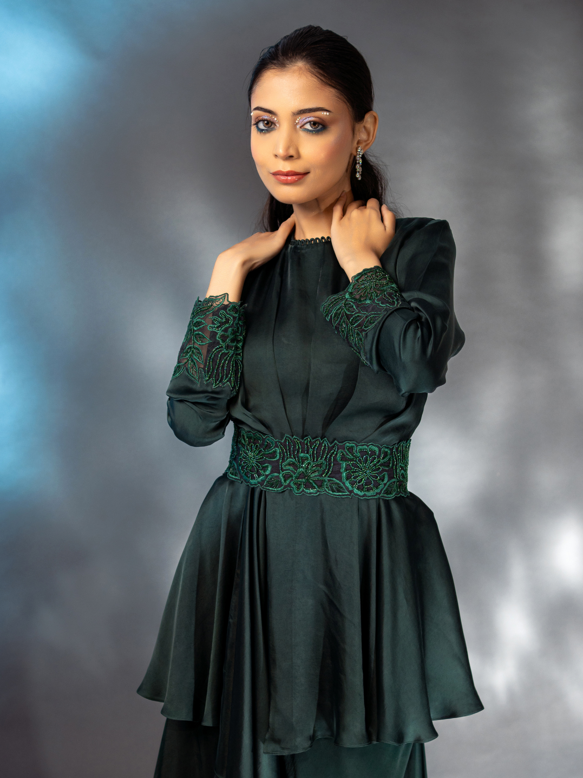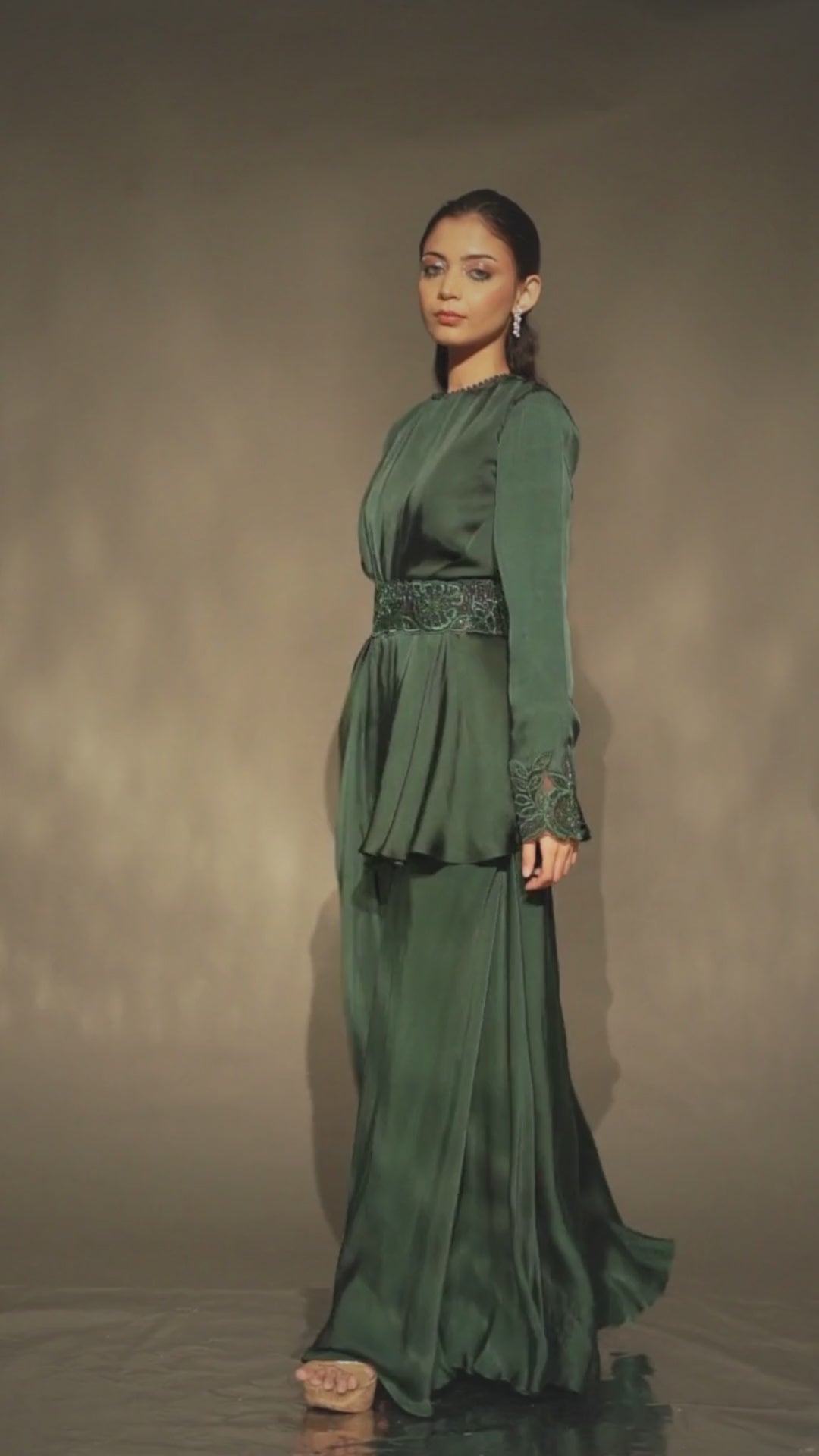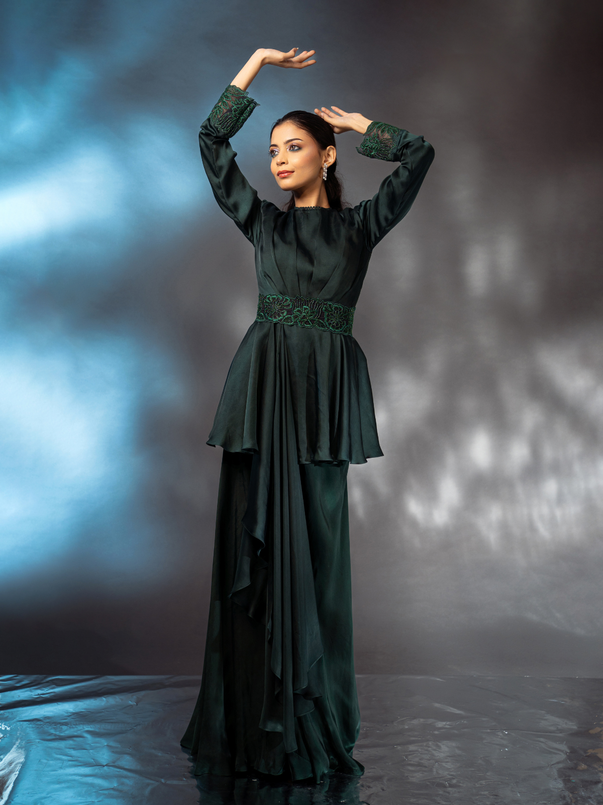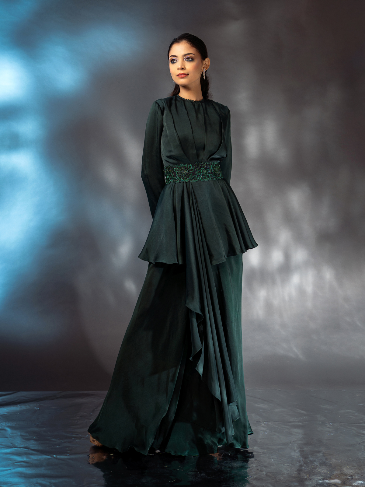 The draped top and flared pants feature a stunning bottle green hue and a twinkling coral-inspired embellished belt. The sleeves and hem are finished with intricate pearl and thread-work detailing for a unique touch. Slip it on for a look that shines.