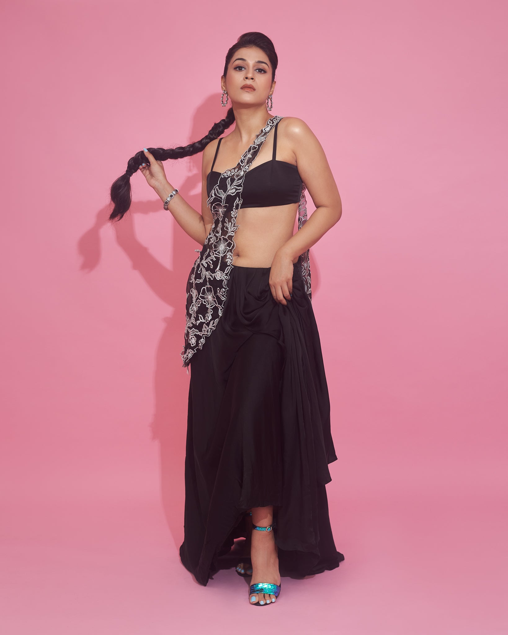 A strappy bustier paired with a draped skirt featuring a waterfall effect on the side. Completed with a heavily embellished sleek drape adorned with contrast embroidery, featuring 3D flowers and tassels.