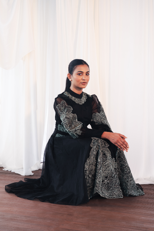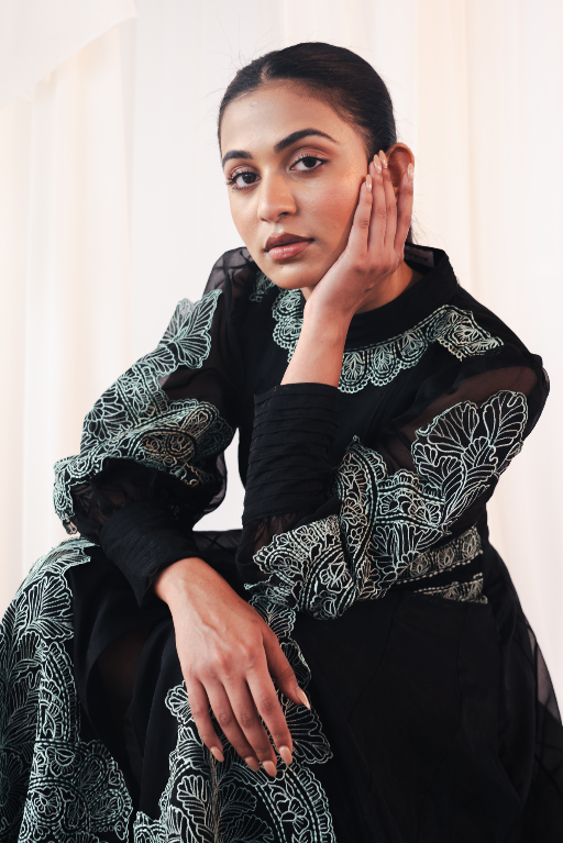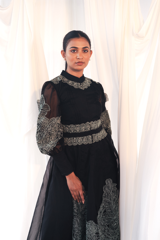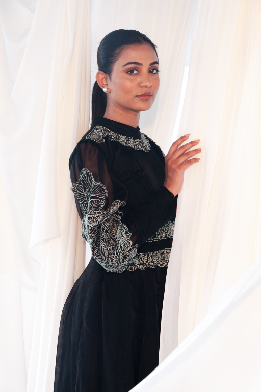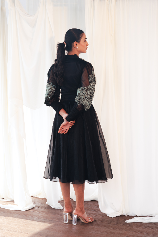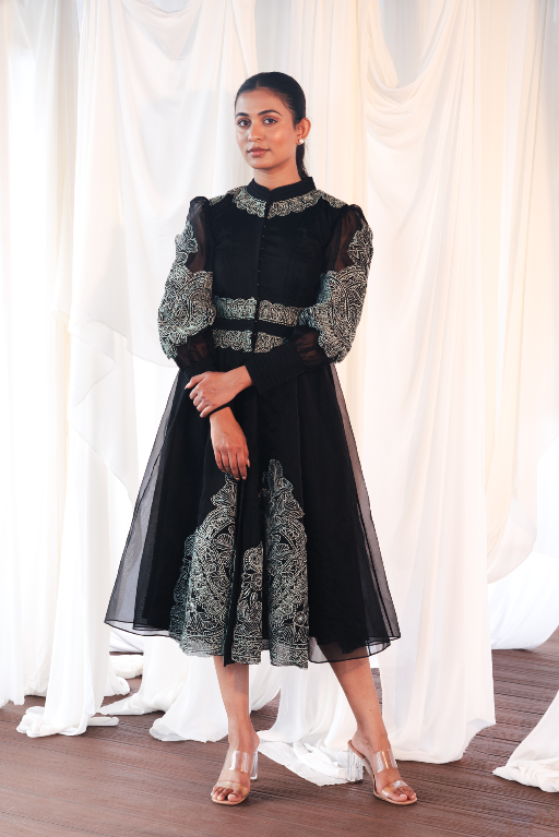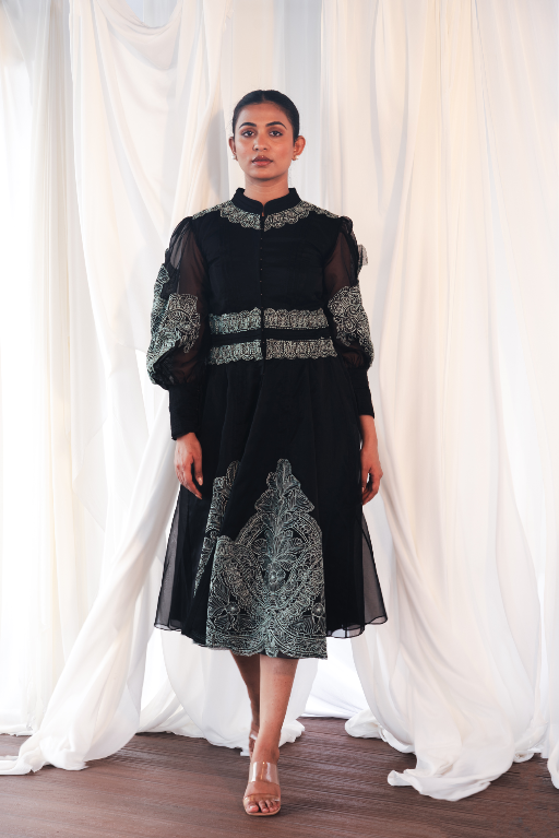 Find your fashion Nirvana in this stunning black organza midi dress. Pintuck details on the collar, sleeves, and body bring a refined structure, while delicate white embroidery graces the neck, shoulders, and hem. The embroidered patchwork on the sleeves and bottom adds a touch of artistry, making this elegant piece perfect for any occasion.