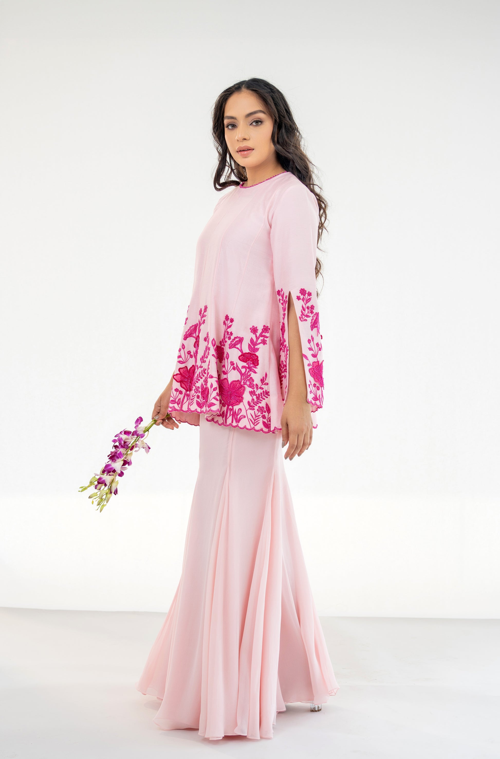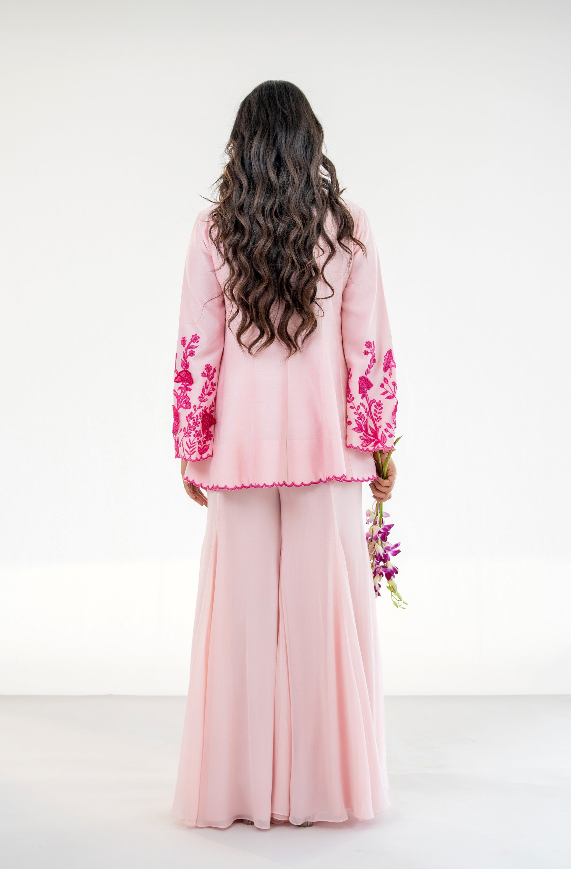 A charming baby pink short kali kurta adorned with vibrant dark pink handwork on both sleeves and the kurta itself. The embroidery showcases exquisite 3D flowers, katdana, and intricate thread work. The slit sleeves add a touch of drama to the ensemble. Paired with georgette bell-bottom pants for a complete look.