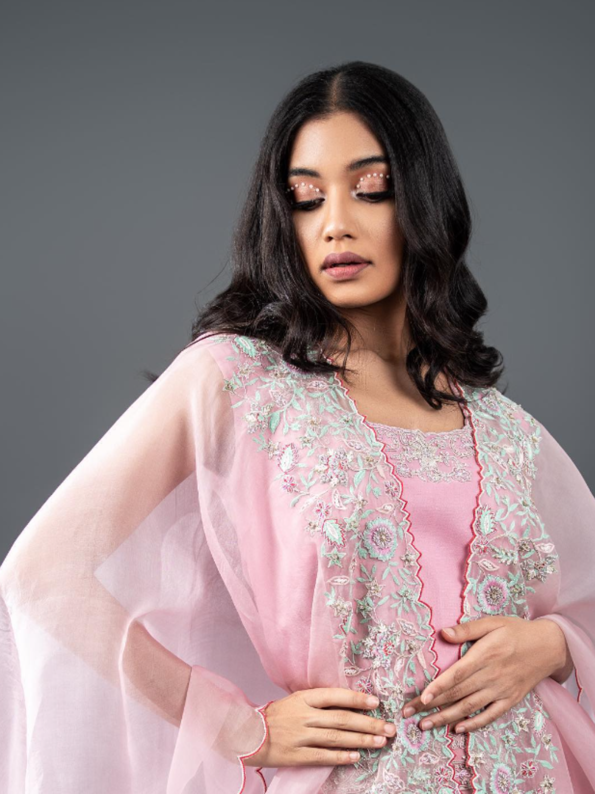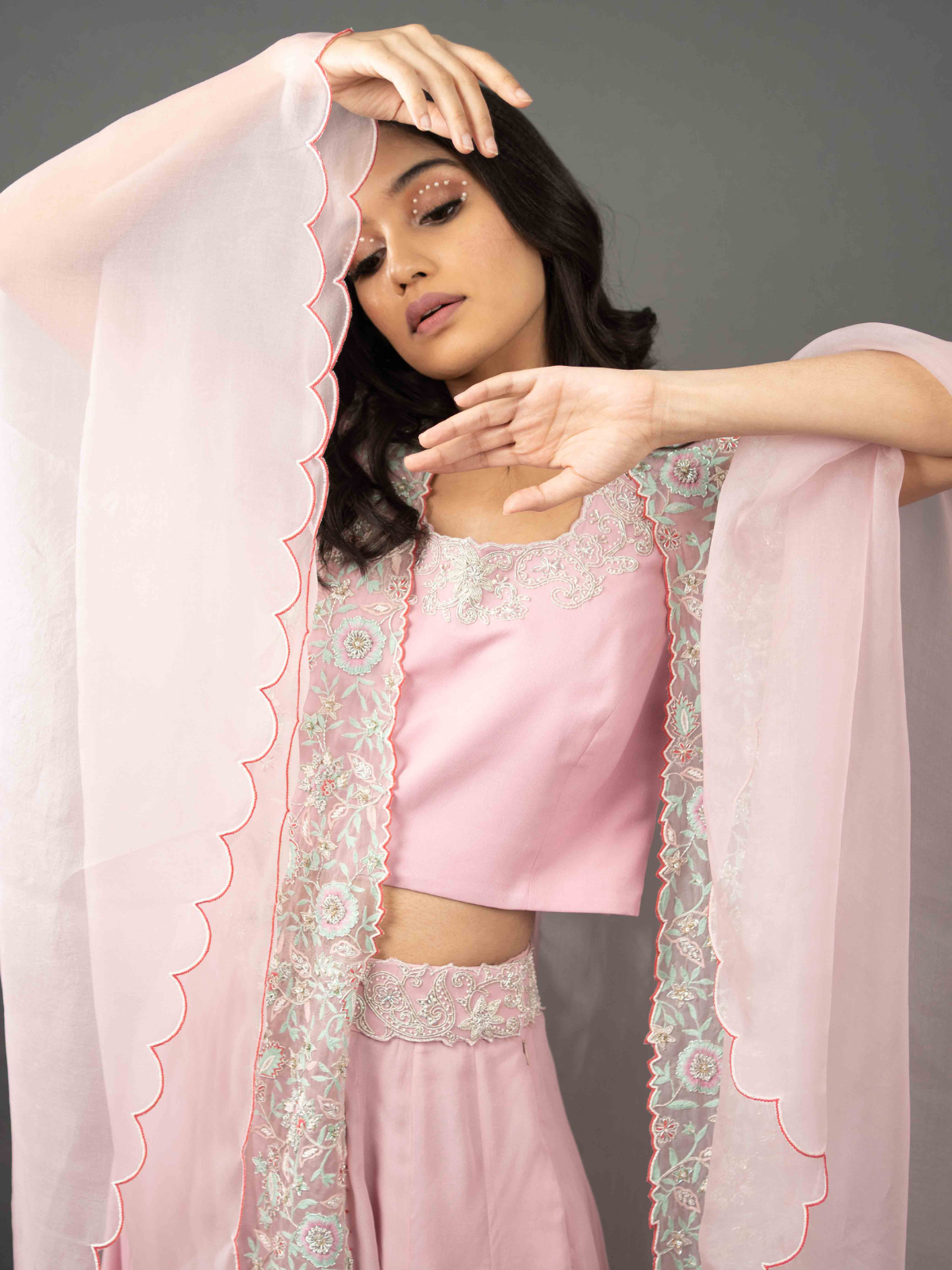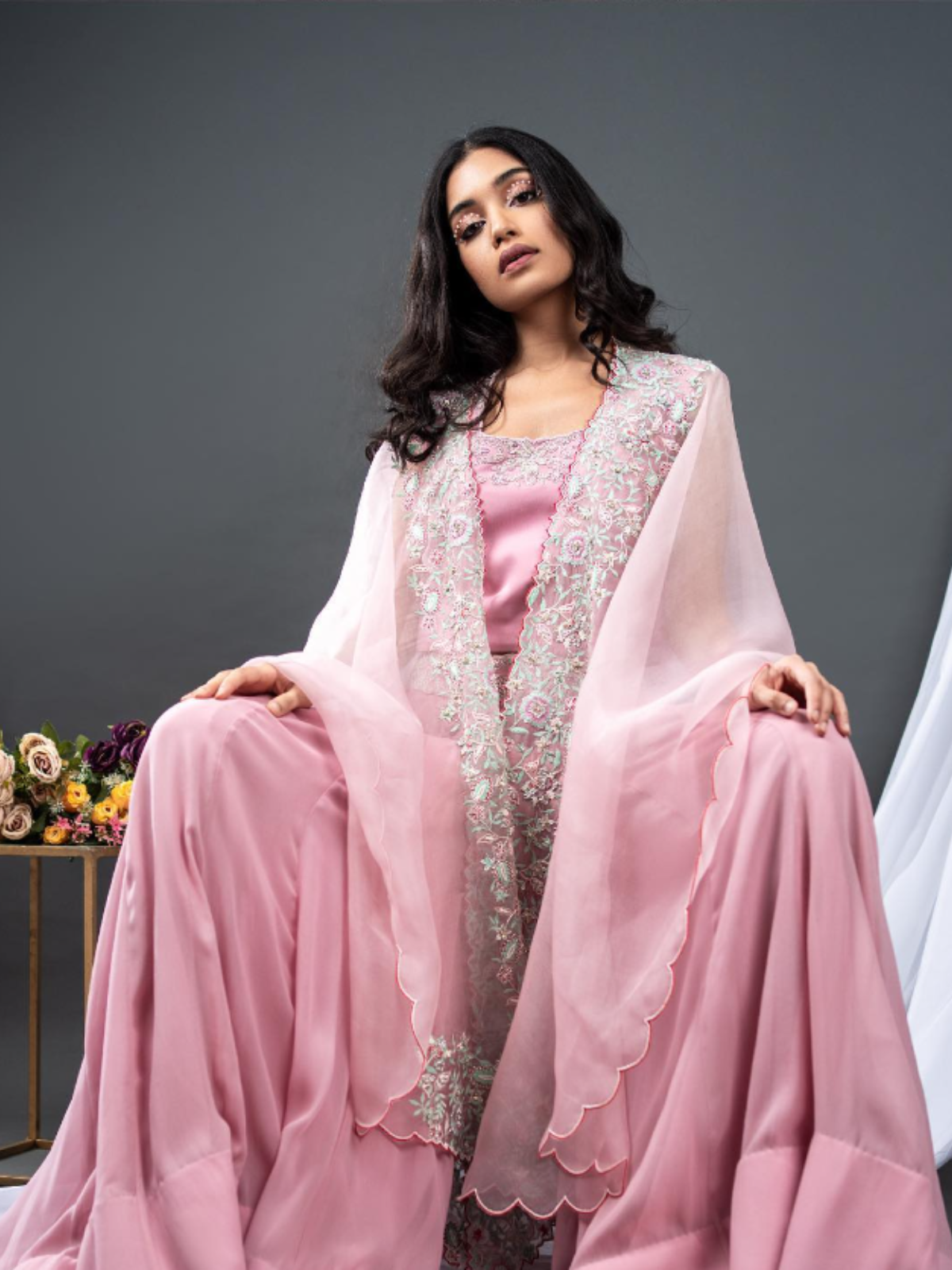 Flirty in this Pink Cape Set. The flared palazzo pants with matching crop top and pink embroidered cape will make you feel cute and stylish. The georgette fabric and organza cape let you express your feminine graceful side.