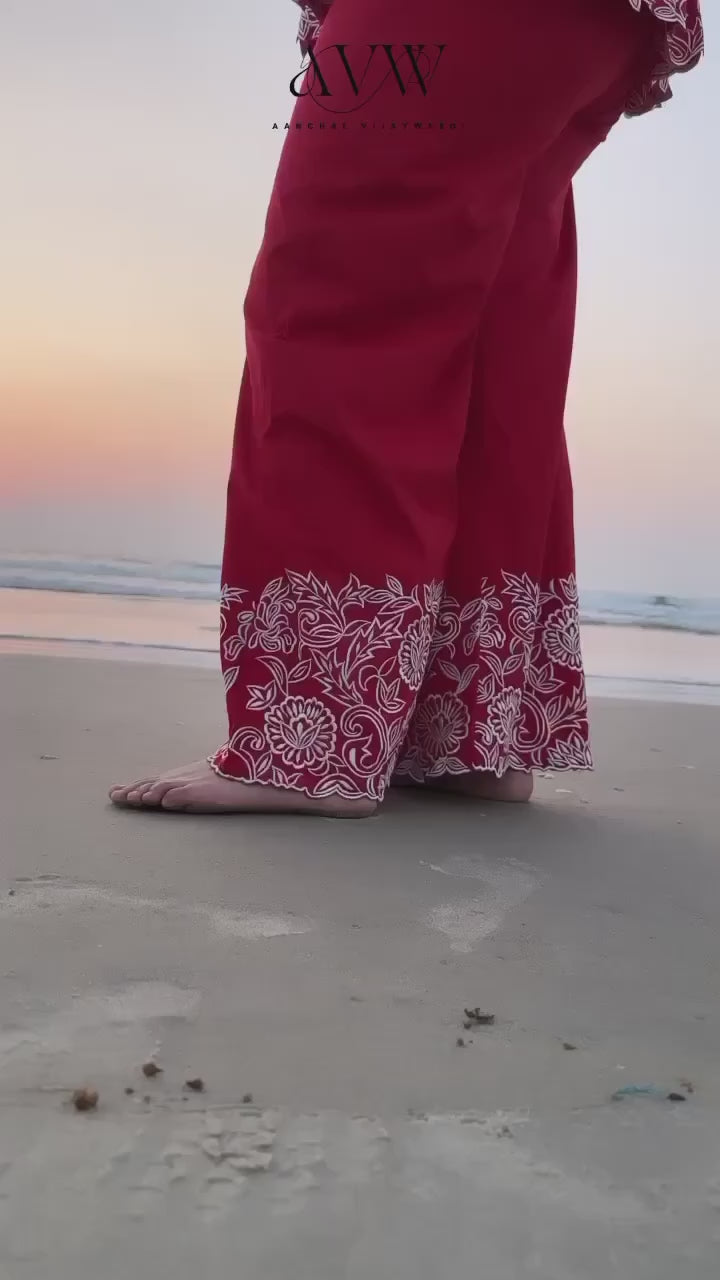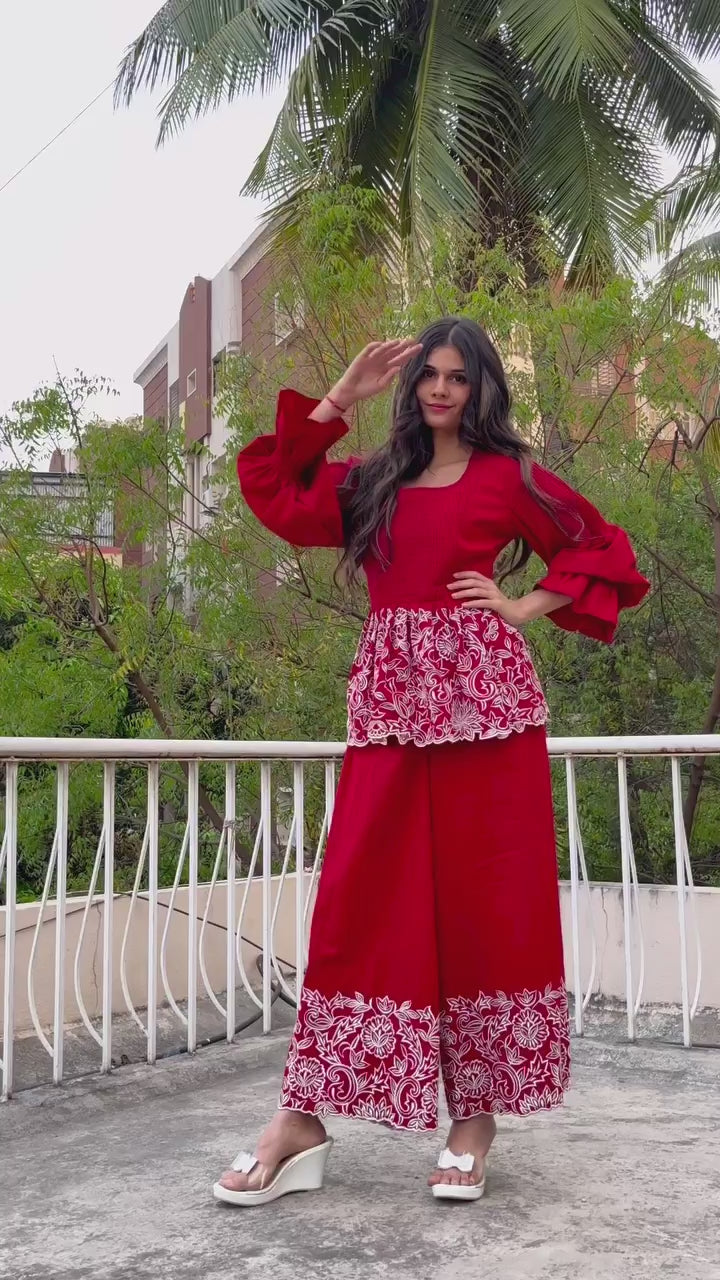 Feel vibrant in this red peplum co-ord set. Crafted from pure cotton with contrast cutwork embroidery, the set features a dramatic pleated yoke and unique flared sleeves. Perfect for any special occasion!