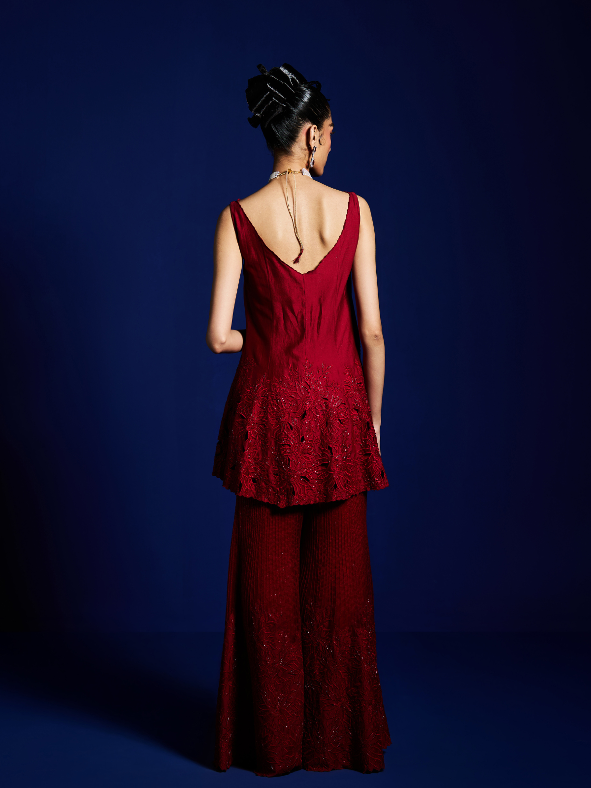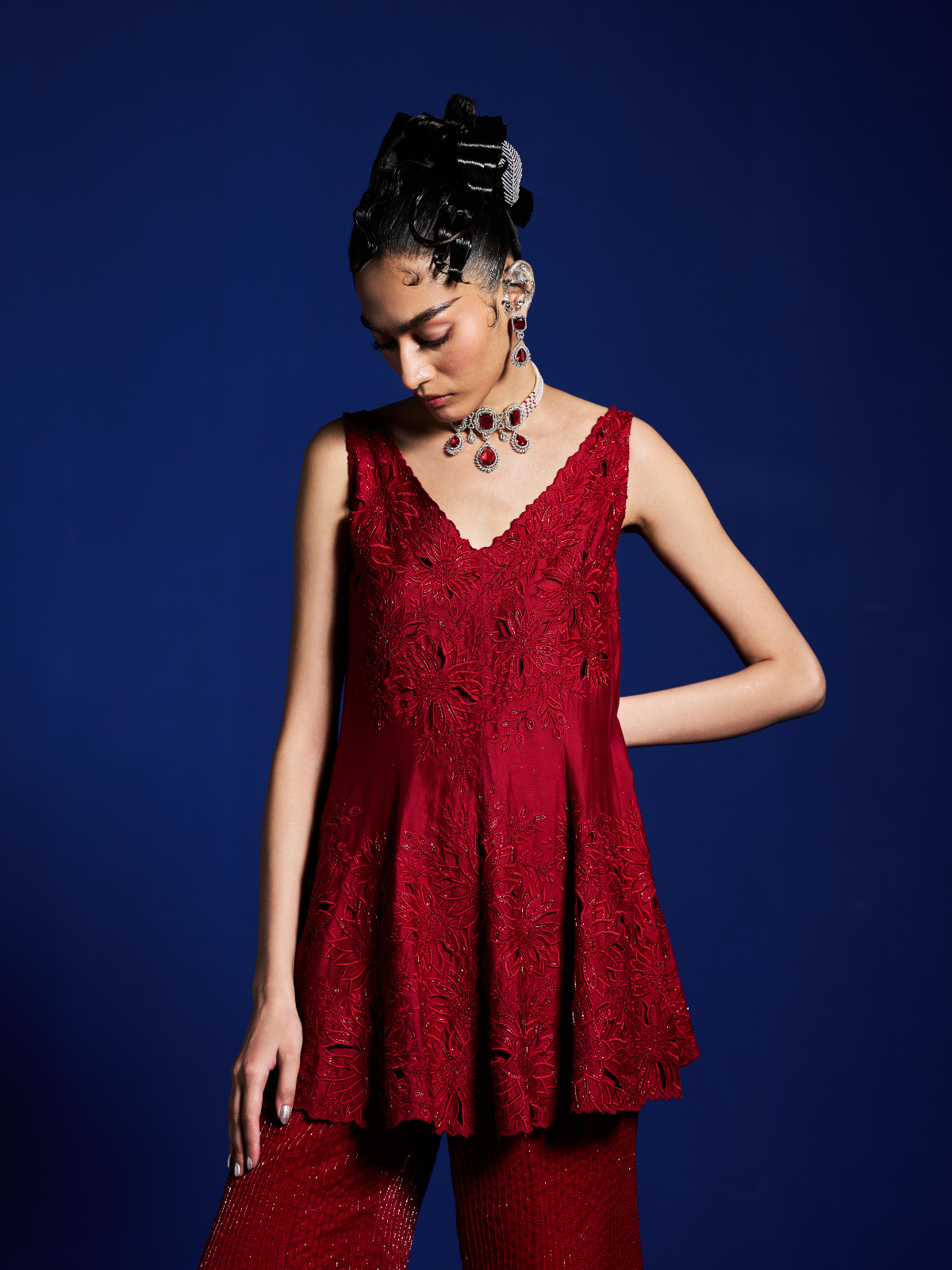 Unleash your bold side in this deep red chanderi Rouge Kali Top & Pants ensemble. The sleeveless peplum top features an intricate floral design in a tone-on-tone embroidery, delicate cut-work, and shimmering katdana accents. Paired with flowing organza Kali bell bottom pants adorned with matching embellishments, this set transforms traditional craftsmanship into a daring statement.