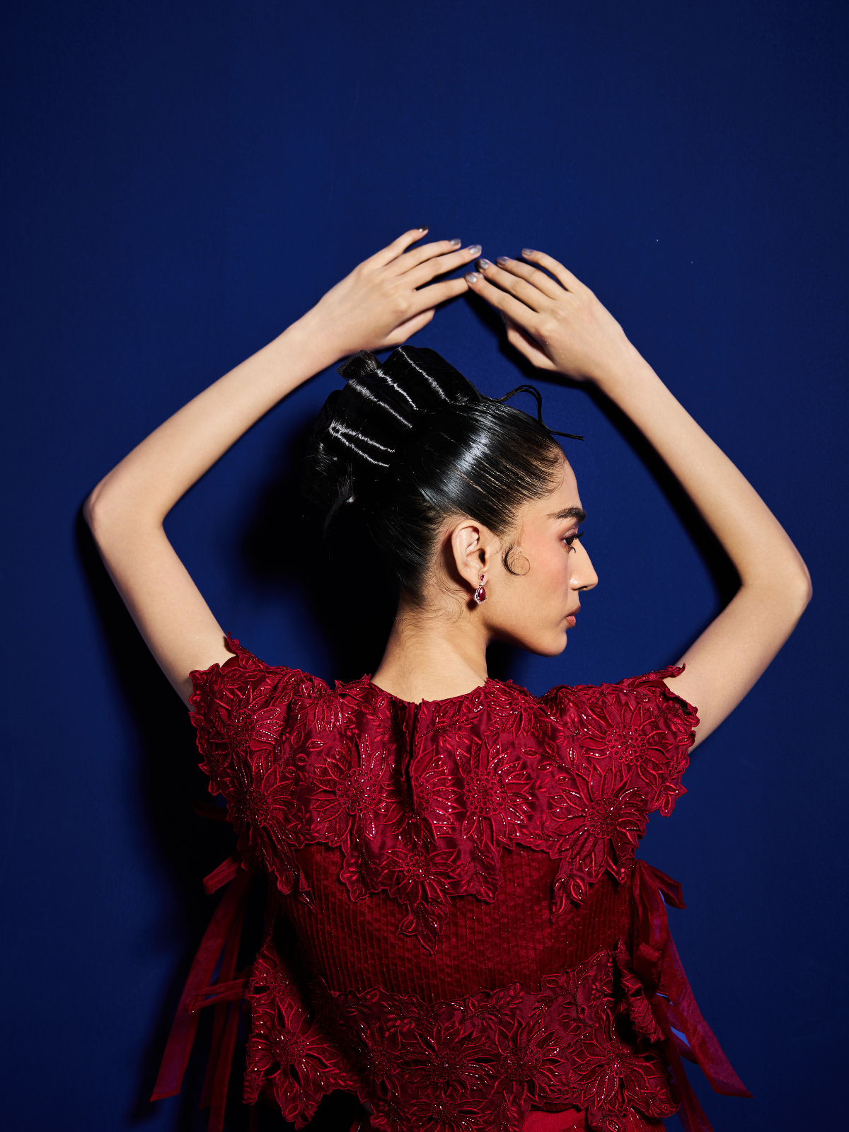 The Ruby Drape Set is a stunning three-piece set in rich maroon. This collection features a luxurious satin bustier, an organza tie-up top adorned with floral cut-work embroidery and intricate katdana work. The set is completed with a bemberg satin drape skirt that flows elegantly.