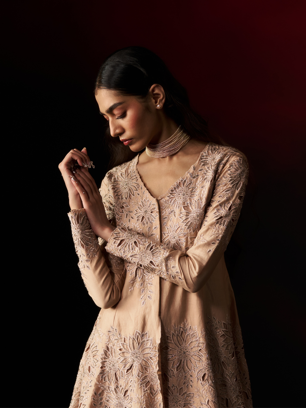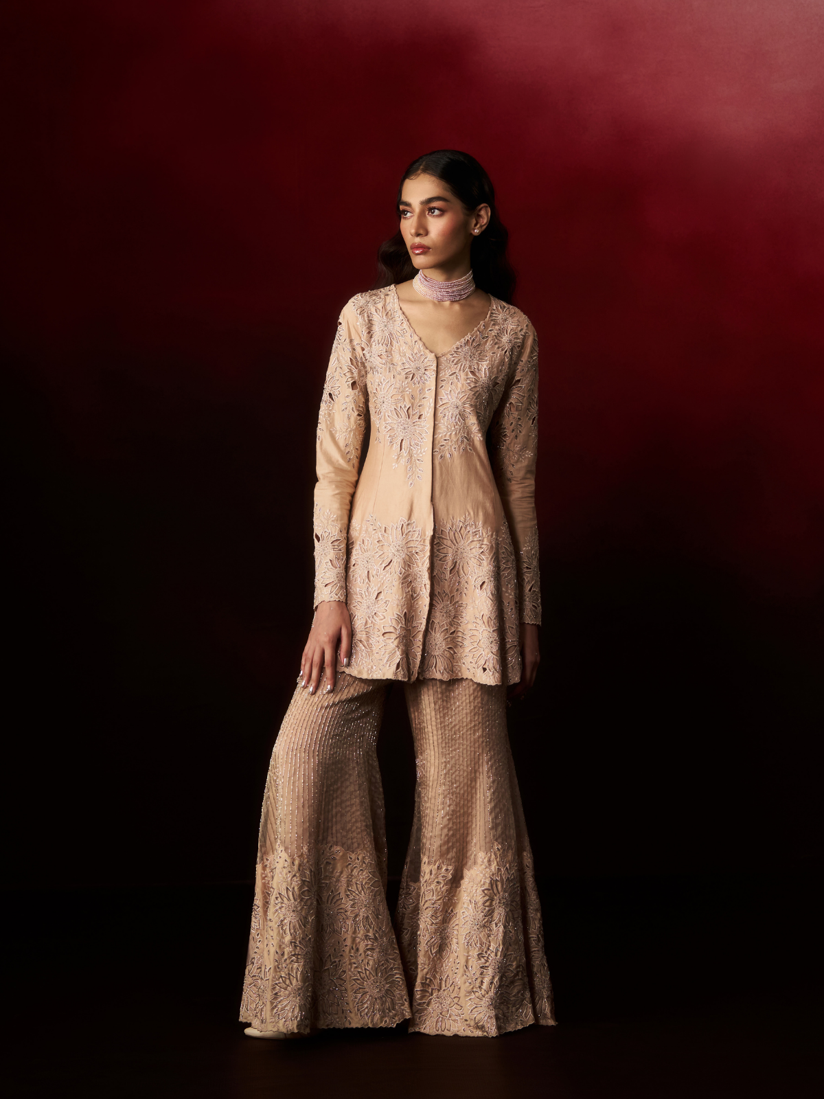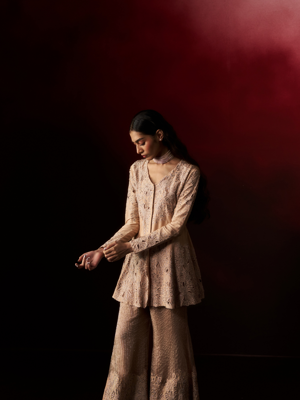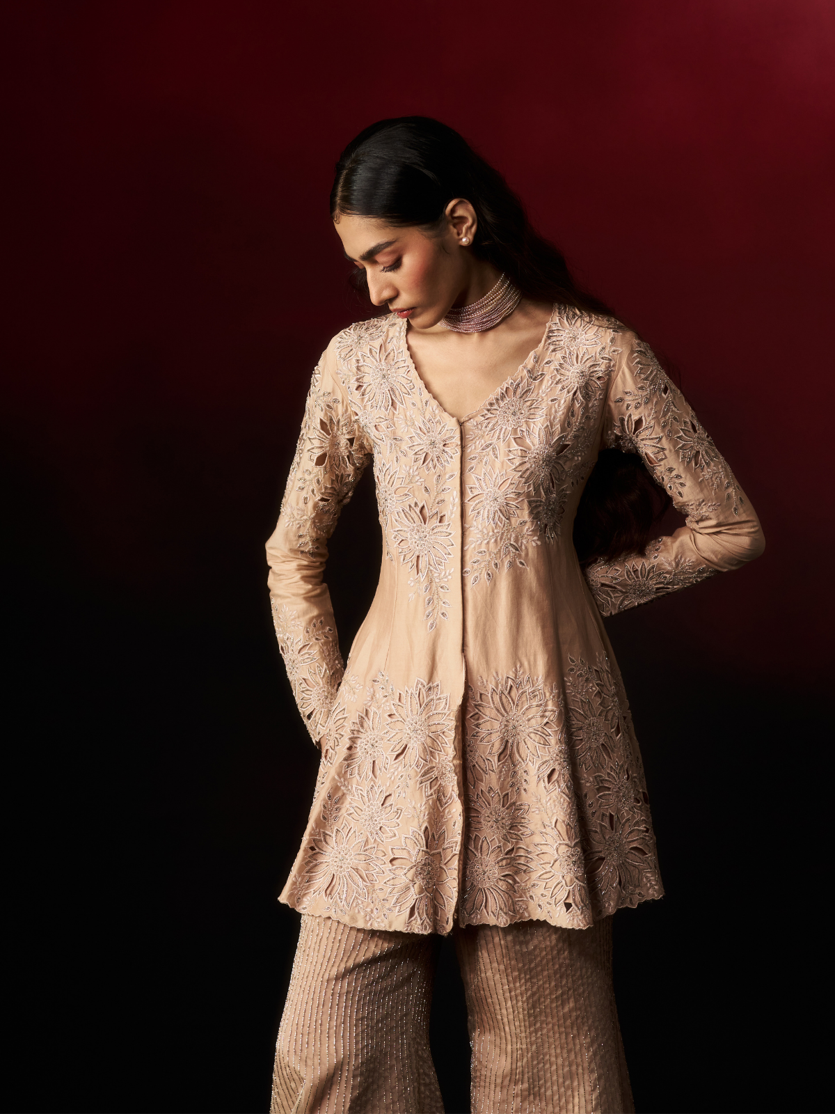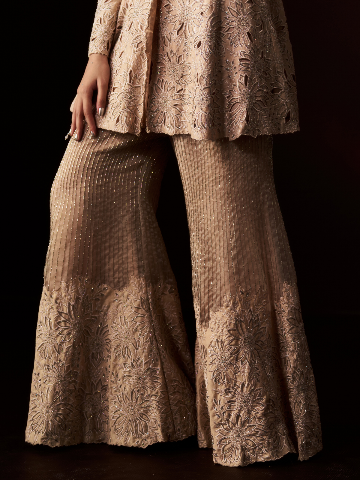 This beige Chanderi kali Peplum top with full sleeves showcases exquisite sunflower-inspired machine embroidery and delicate cut work, enhanced by shimmering katdana accents for a luxurious finish. Paired with matching Organza kali bell bottom pants featuring coordinated embroidery and katdana lines, this set offers a harmonious and elegant look. Perfect for special occasions, the Sand Bell Bottom Set combines traditional craftsmanship with contemporary style to make you stand out effortlessly.