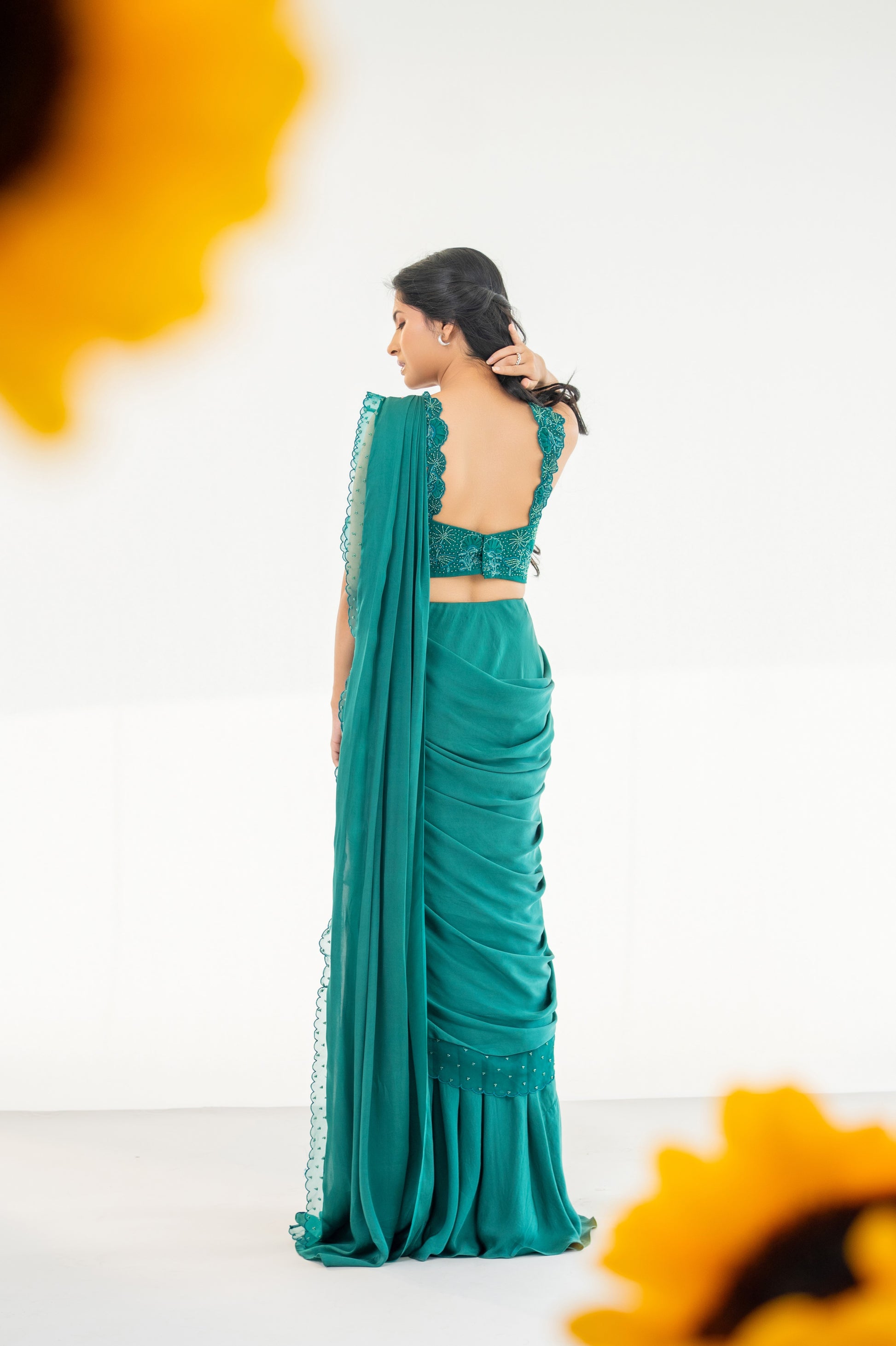 A front-pleated saree cascading in a graceful waterfall effect, coupled with an intricately embellished corset blouse. The saree's edge is delicately adorned with organza detailing, while the corset boasts embellishments of pearls, threadwork, and floral appliqué work, all in a teal shade.