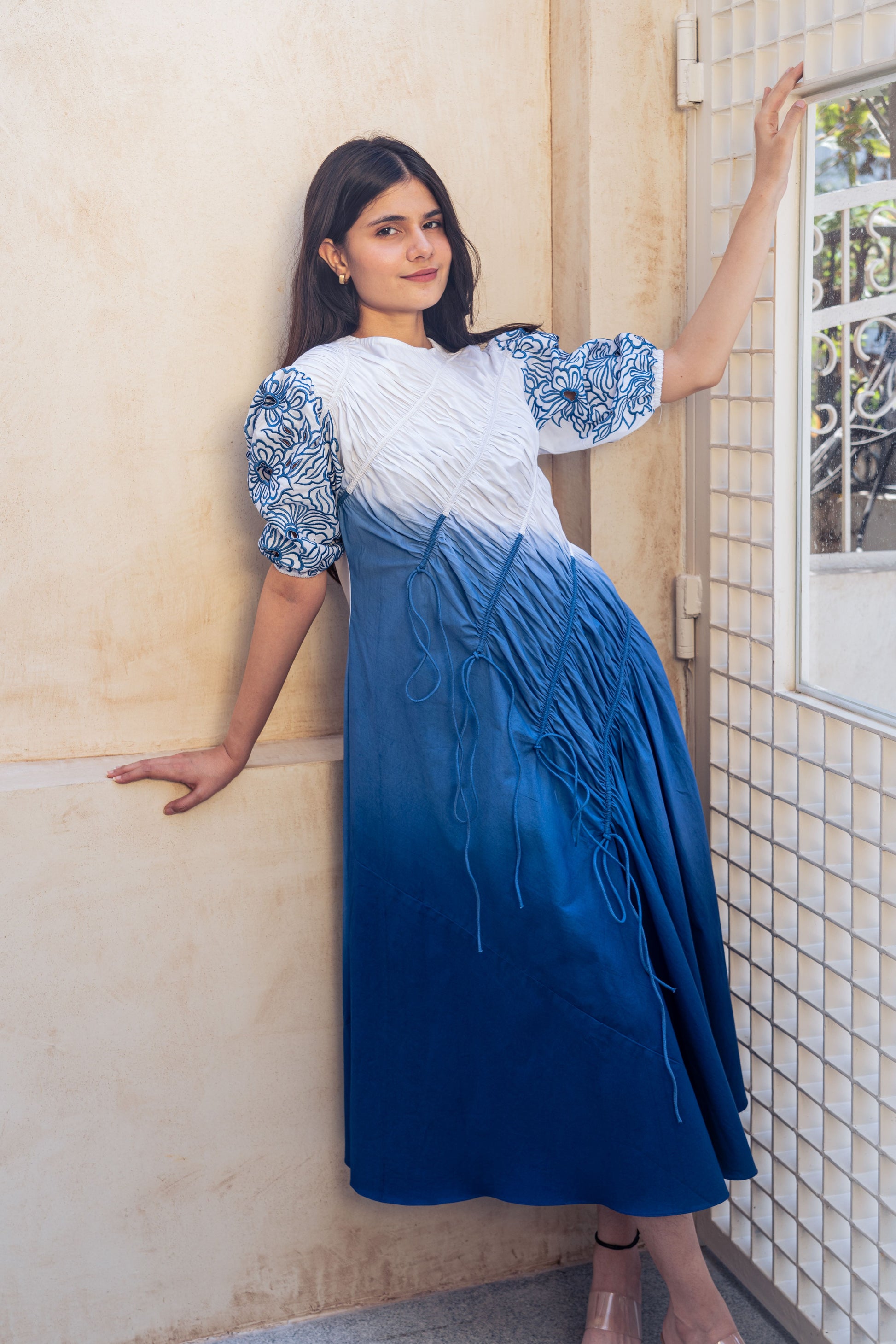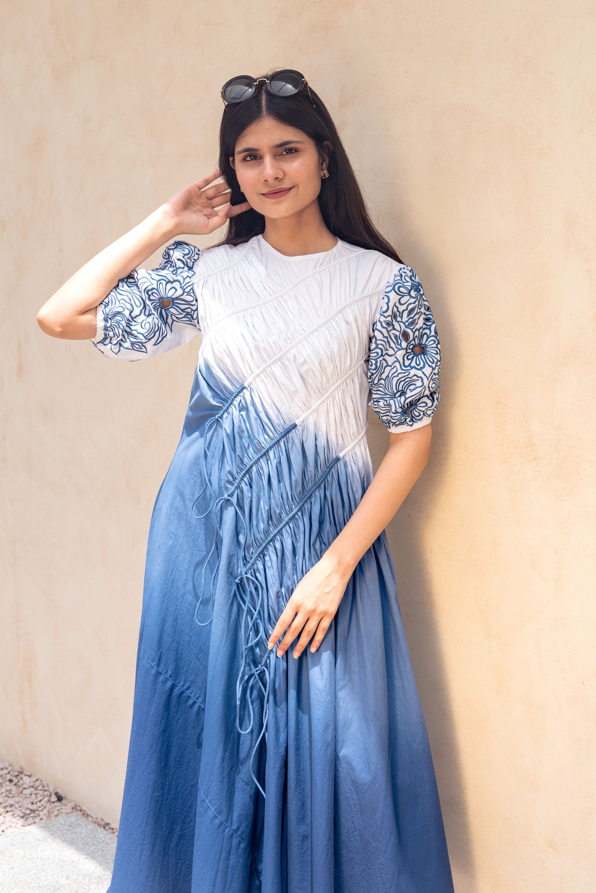 Light and airy the Shaded Blue cotton string dress has a closed round neck, tone-on-tone flower machine embroidery with delicate cutwork elbow-length puff sleeves featuring gathered strings along the body, adding a delightful texture that's both stylish yet comfortable.