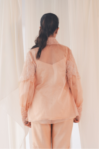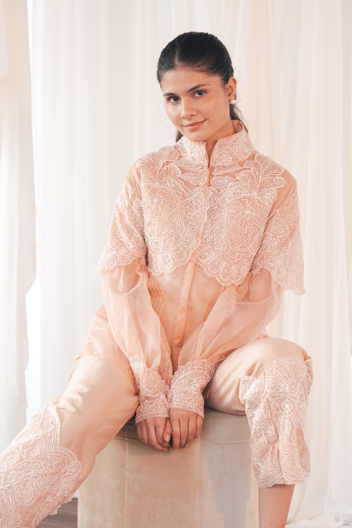 Let the Shadow Shirt in Blush Pink add depth to your wardrobe. This soft, blush pink shirt crafted from organza features a unique play of shadowy embroidery along the collar and cuffs, creating an intriguing contrast. Its delicate design and ethereal fabric make it perfect for both day and evening wear, offering a timeless yet contemporary vibe.