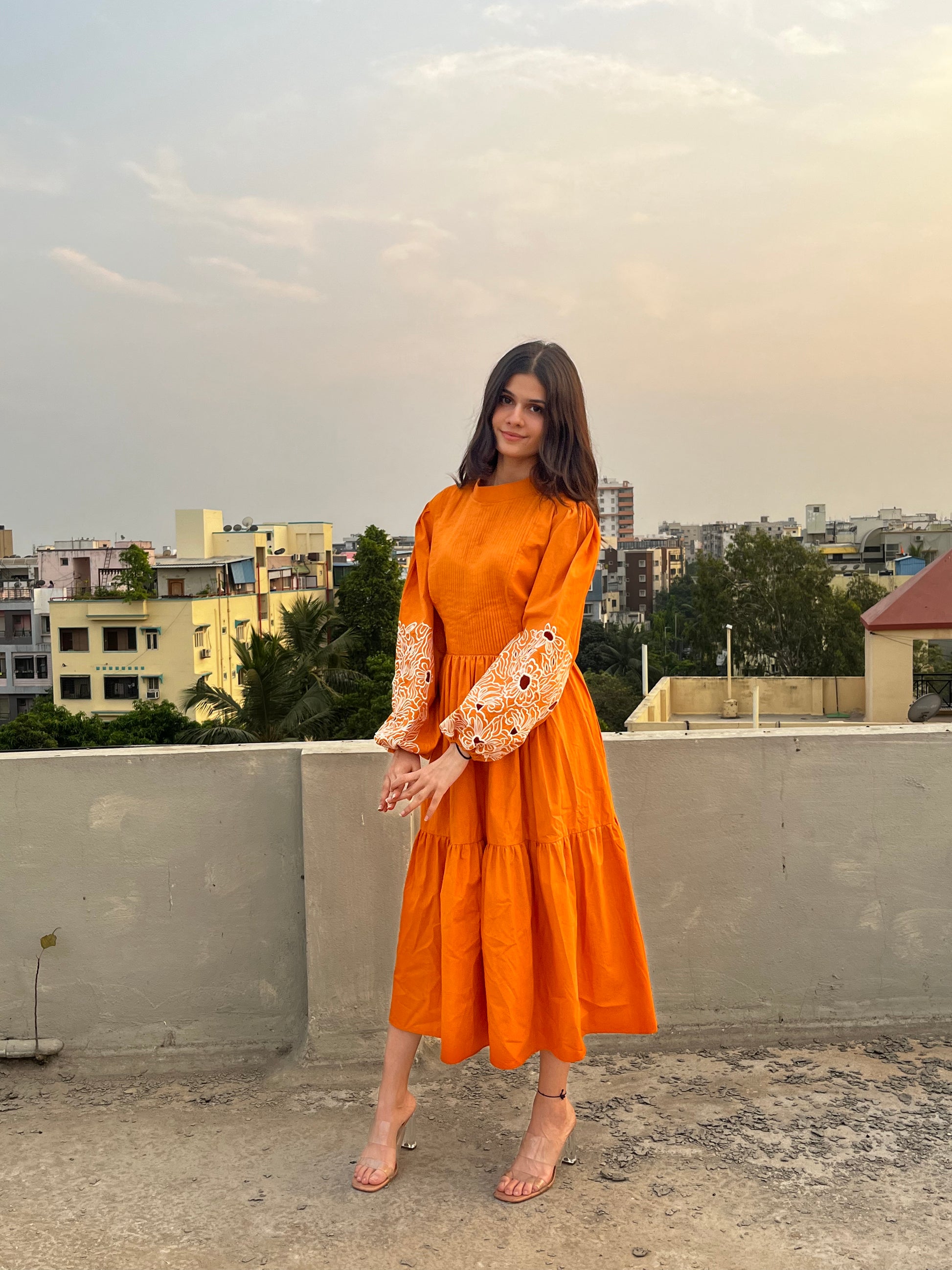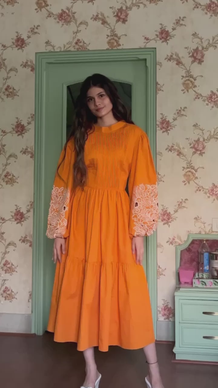 Relish the summer days in this vibrant tangerine dress with a pleated yoke, contrasting embroidery on the sleeves, and intricate cutwork details. Crafted from luxe cotton, this dress is perfect for any occasion.